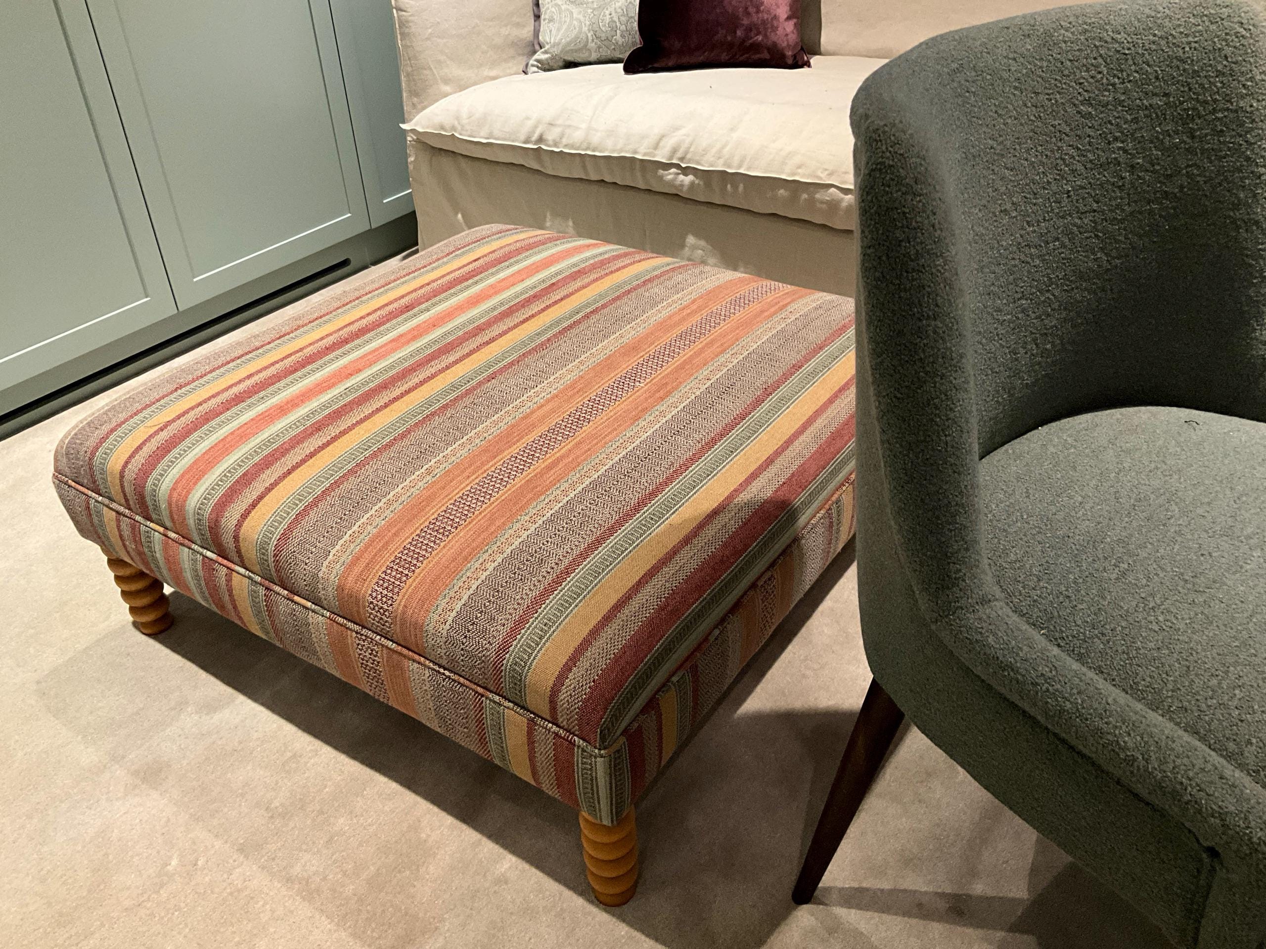 Bespoke Ottoman style footstool upholstered in your own fabric with a choice of piping and turned beech legs stained in warm beeswax.