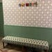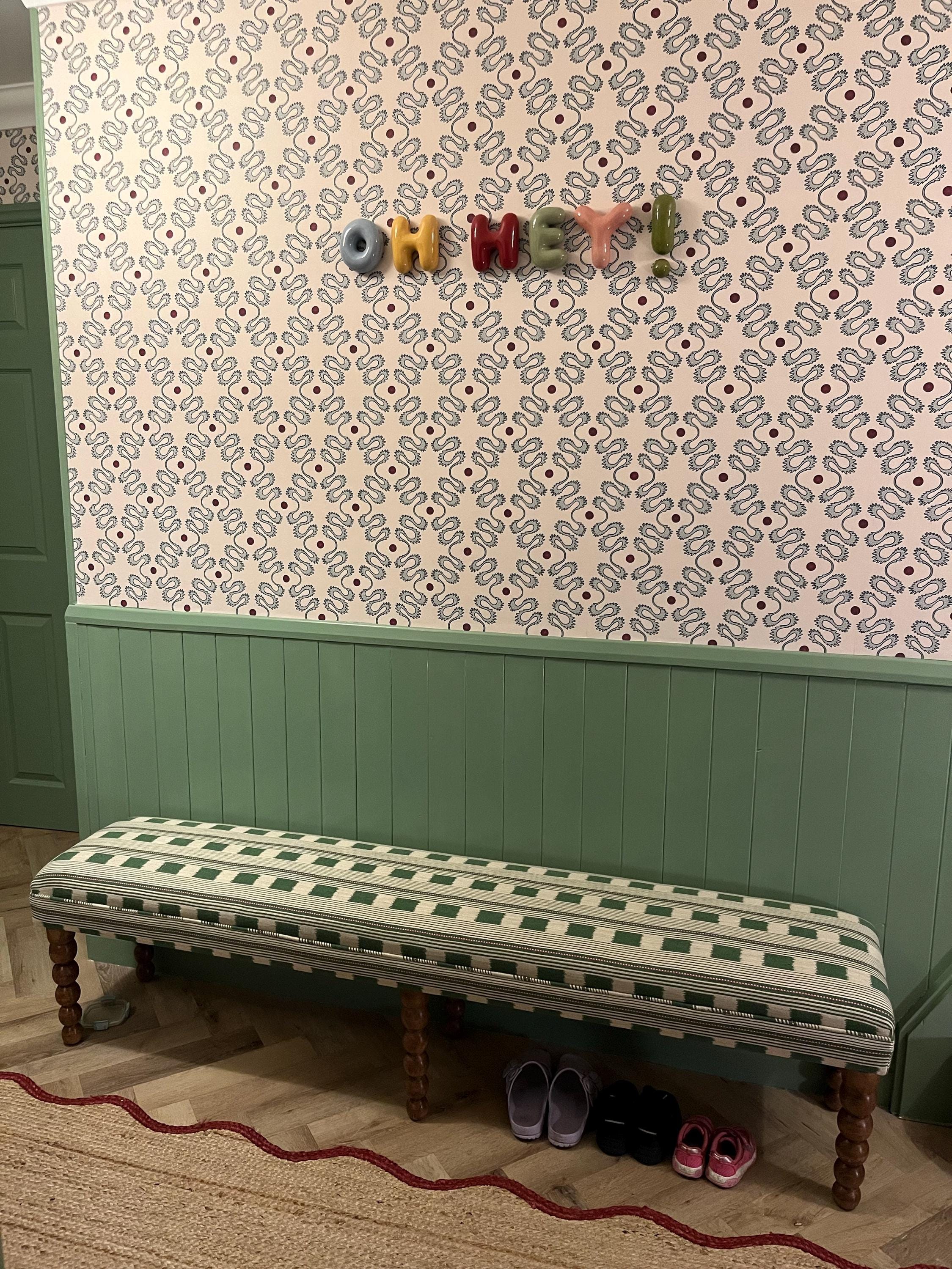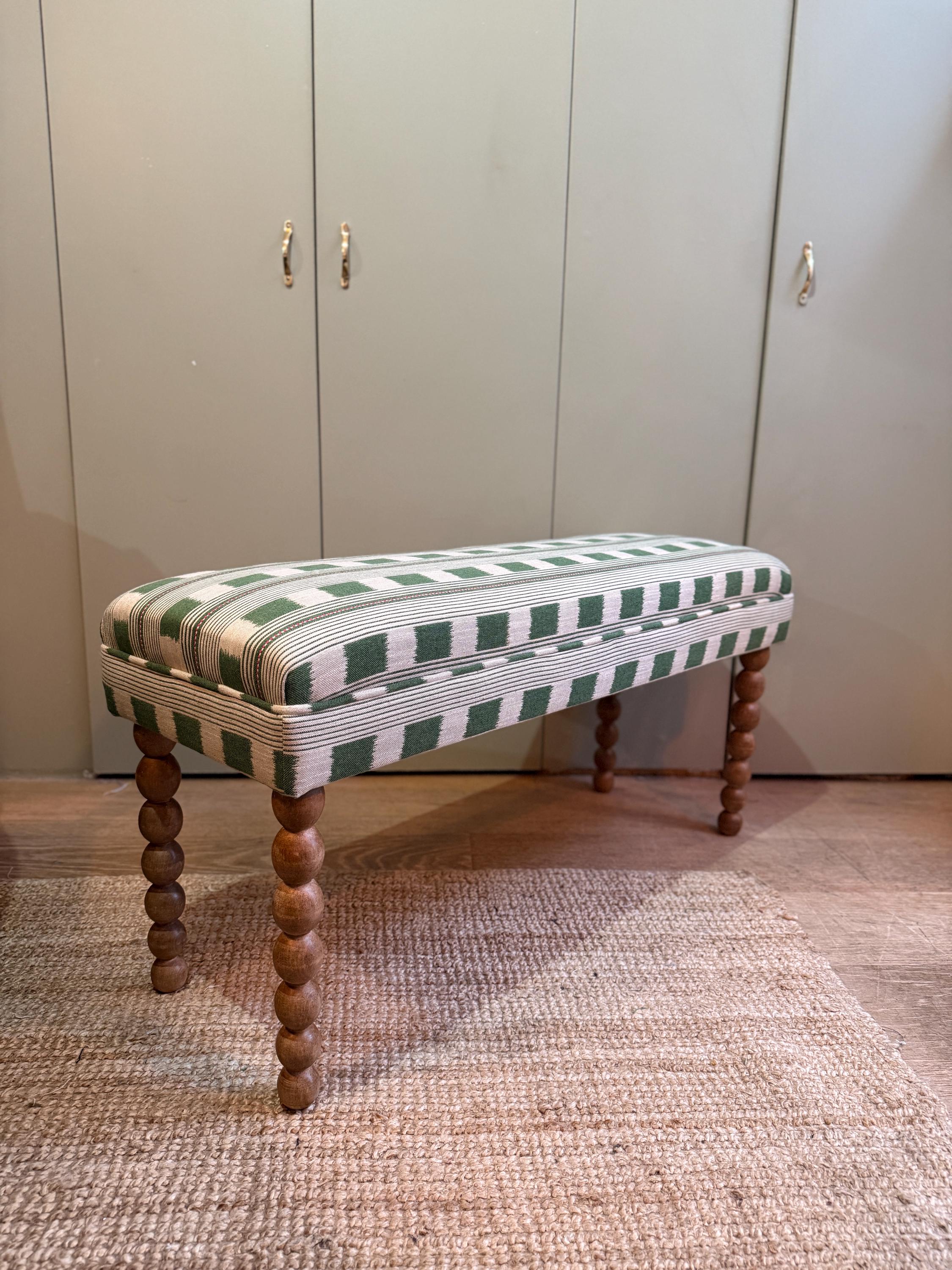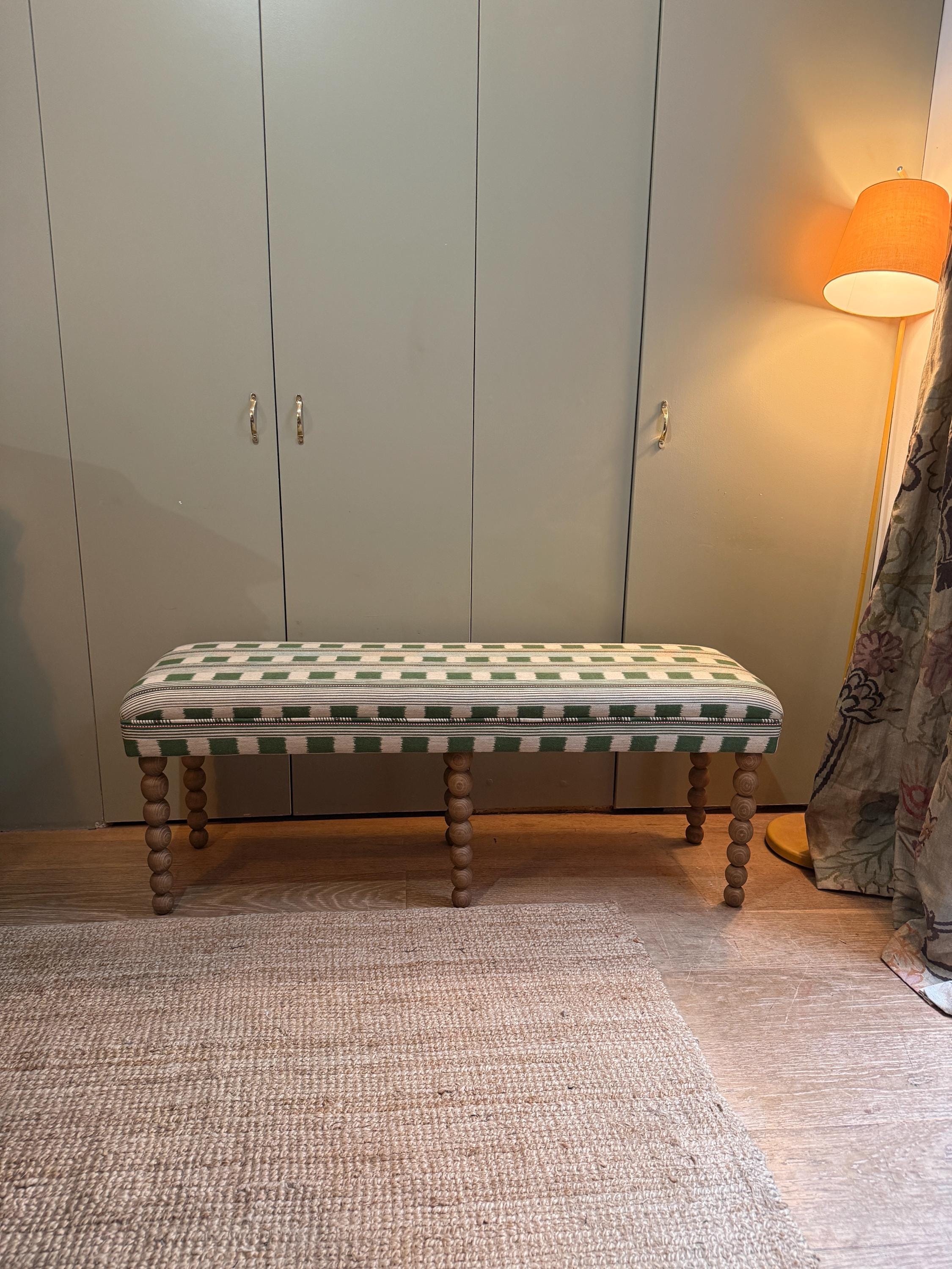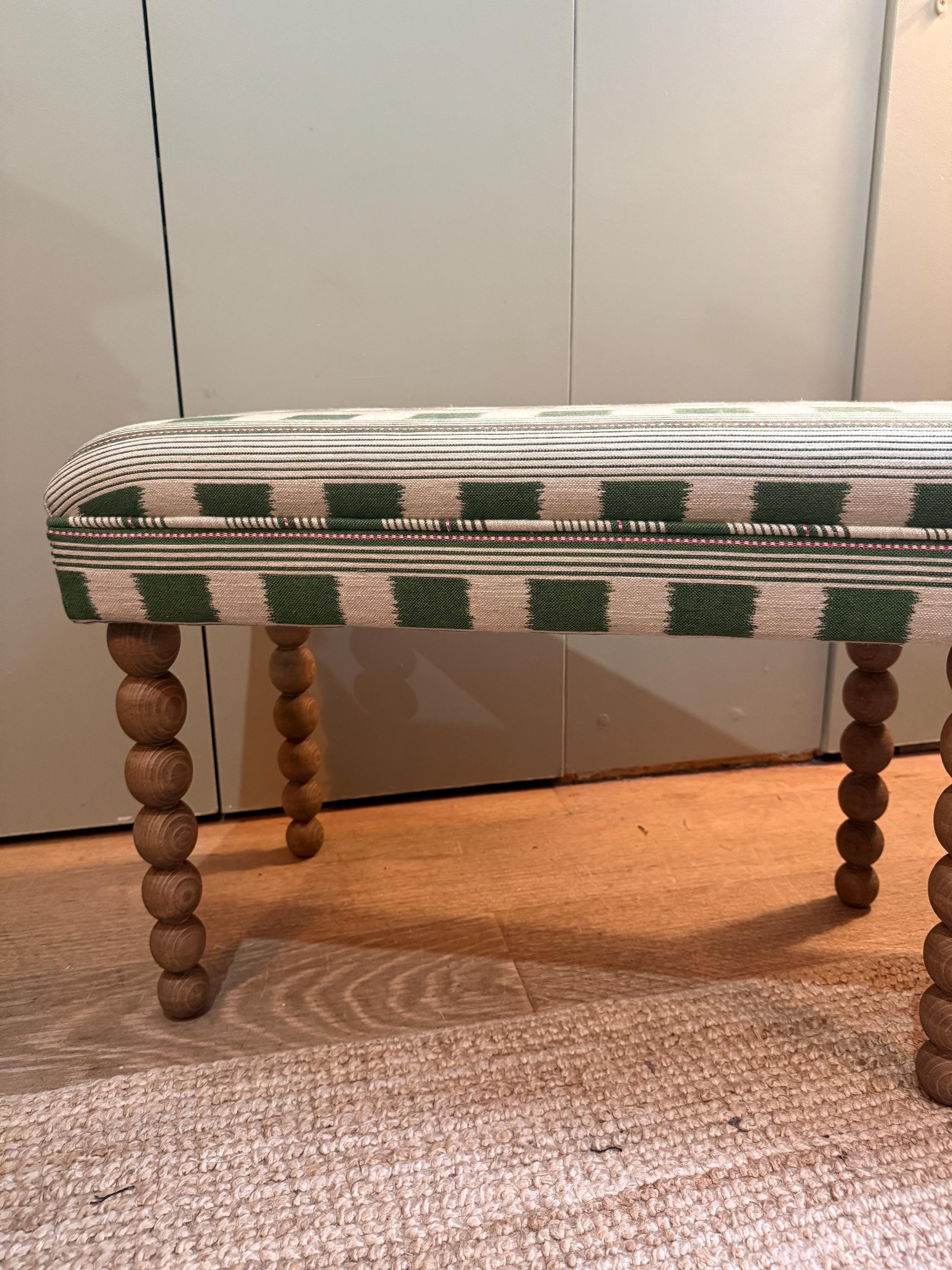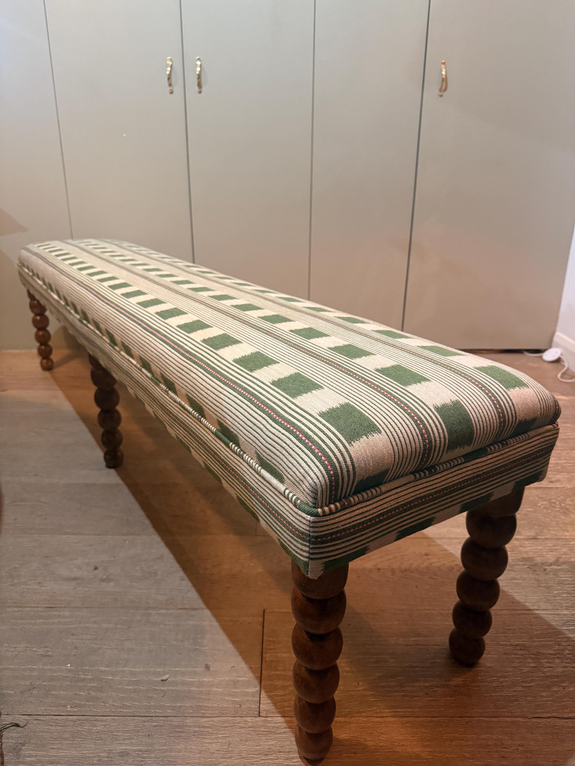 Bespoke upholstered bench in eye catching Christopher Farr Cloth “Lost And Found” by designer Kit Kemp with burgundy piping detail and stunning bobbin style wooden legs.