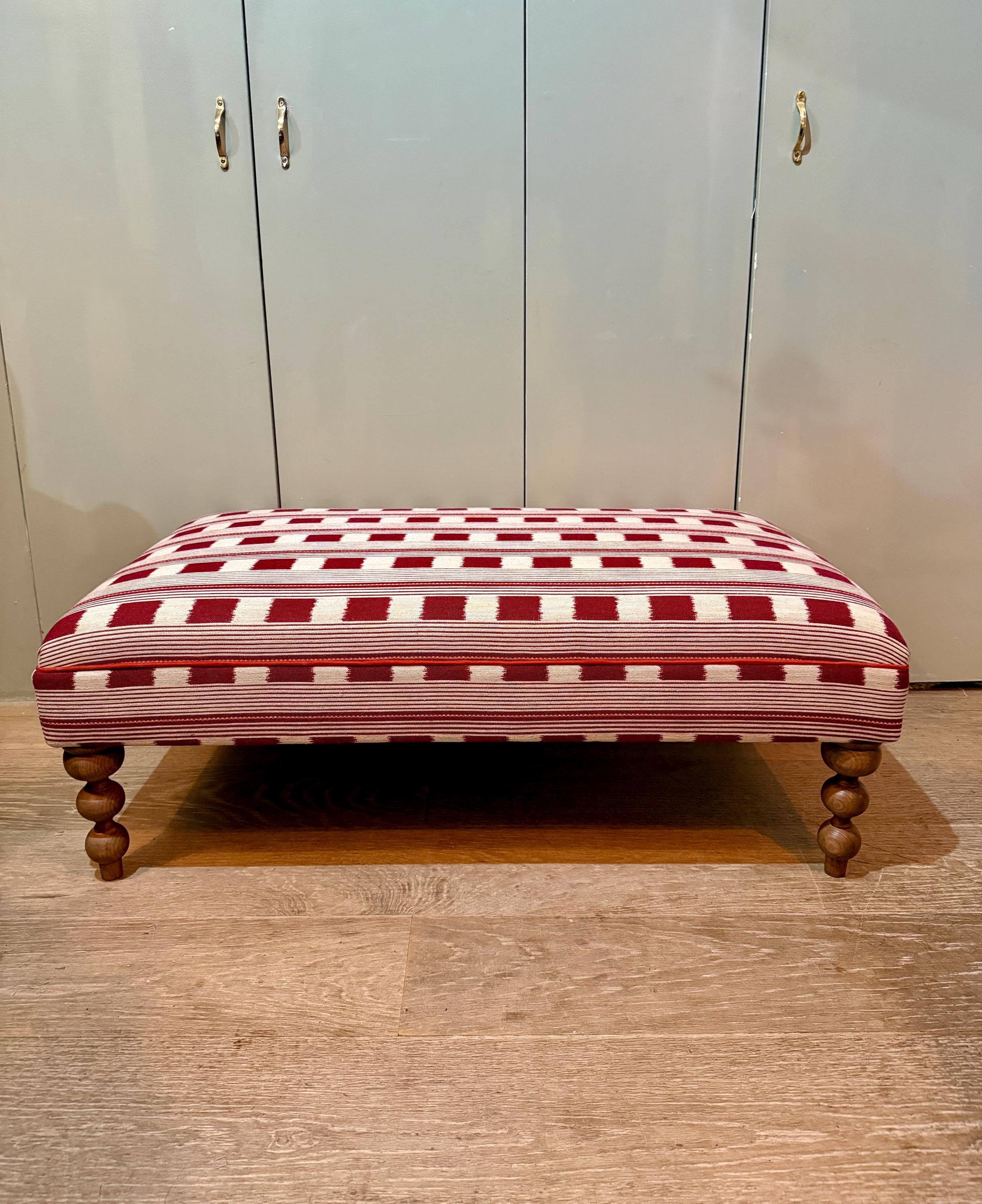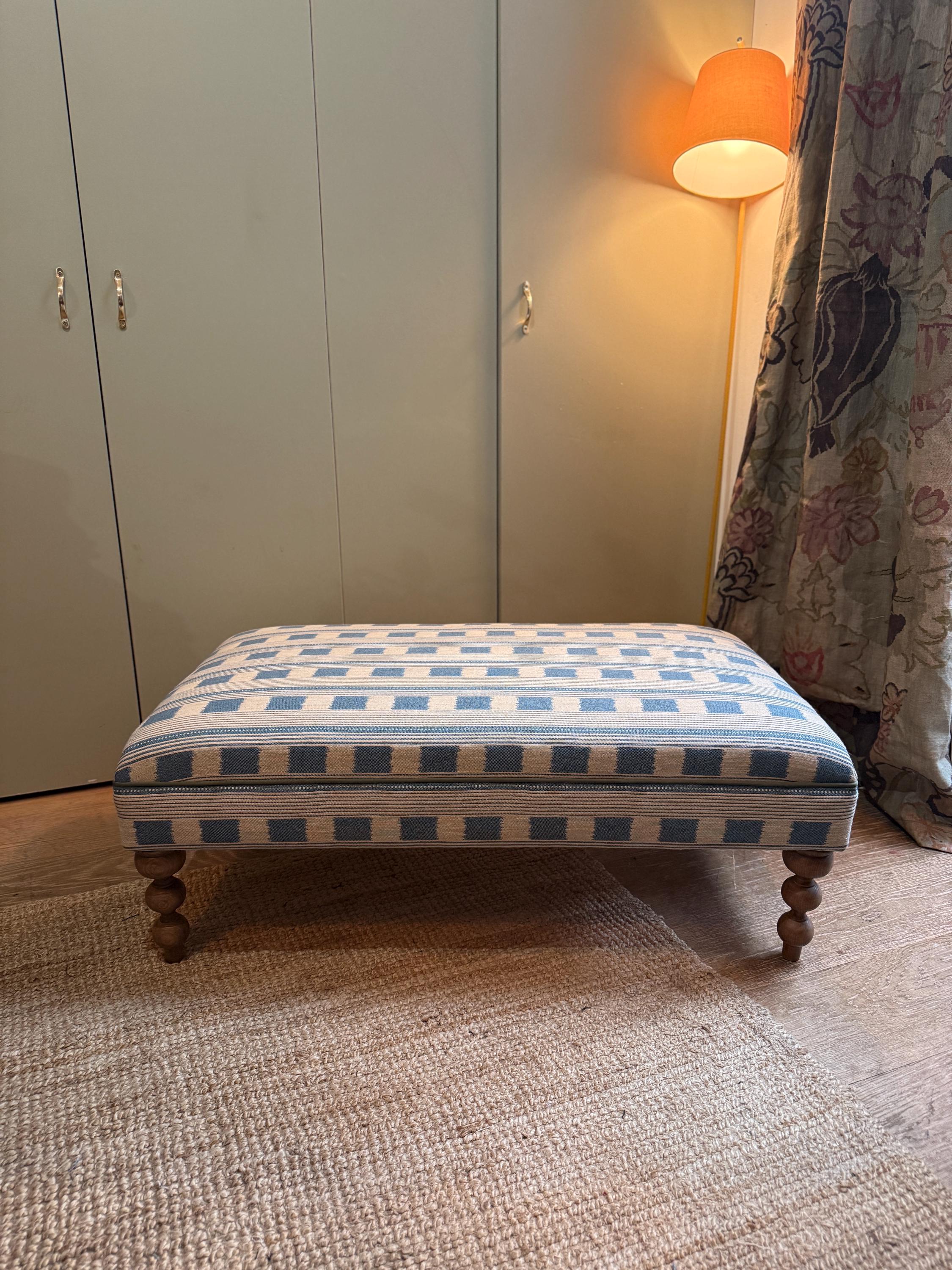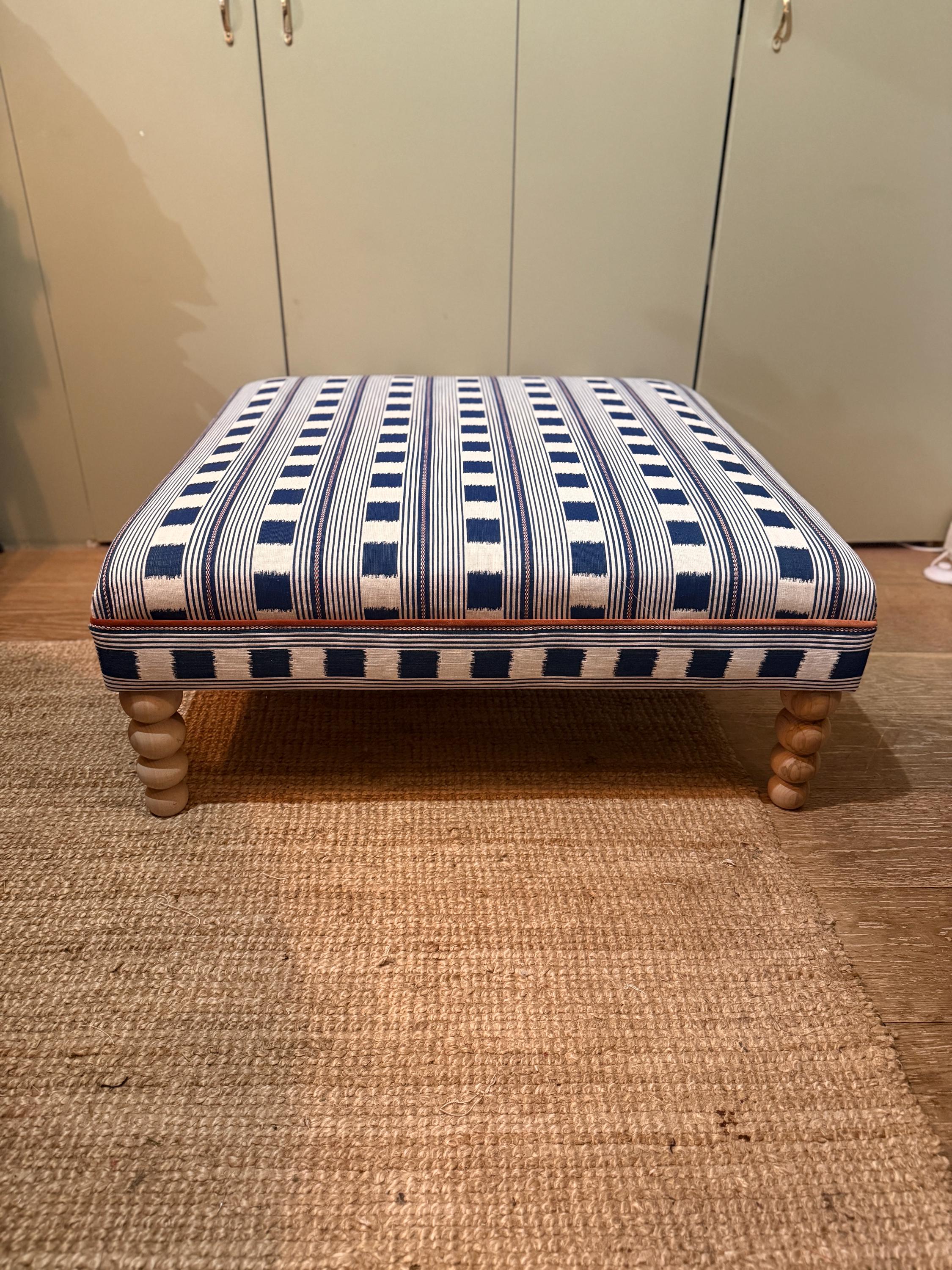 Bespoke Ottoman style footstool upholstered in Christopher Farr Cloth Lost and Found fabric - see colour choices in the photos and personalise with any colour piping and turned beech legs stained in warm beeswax.