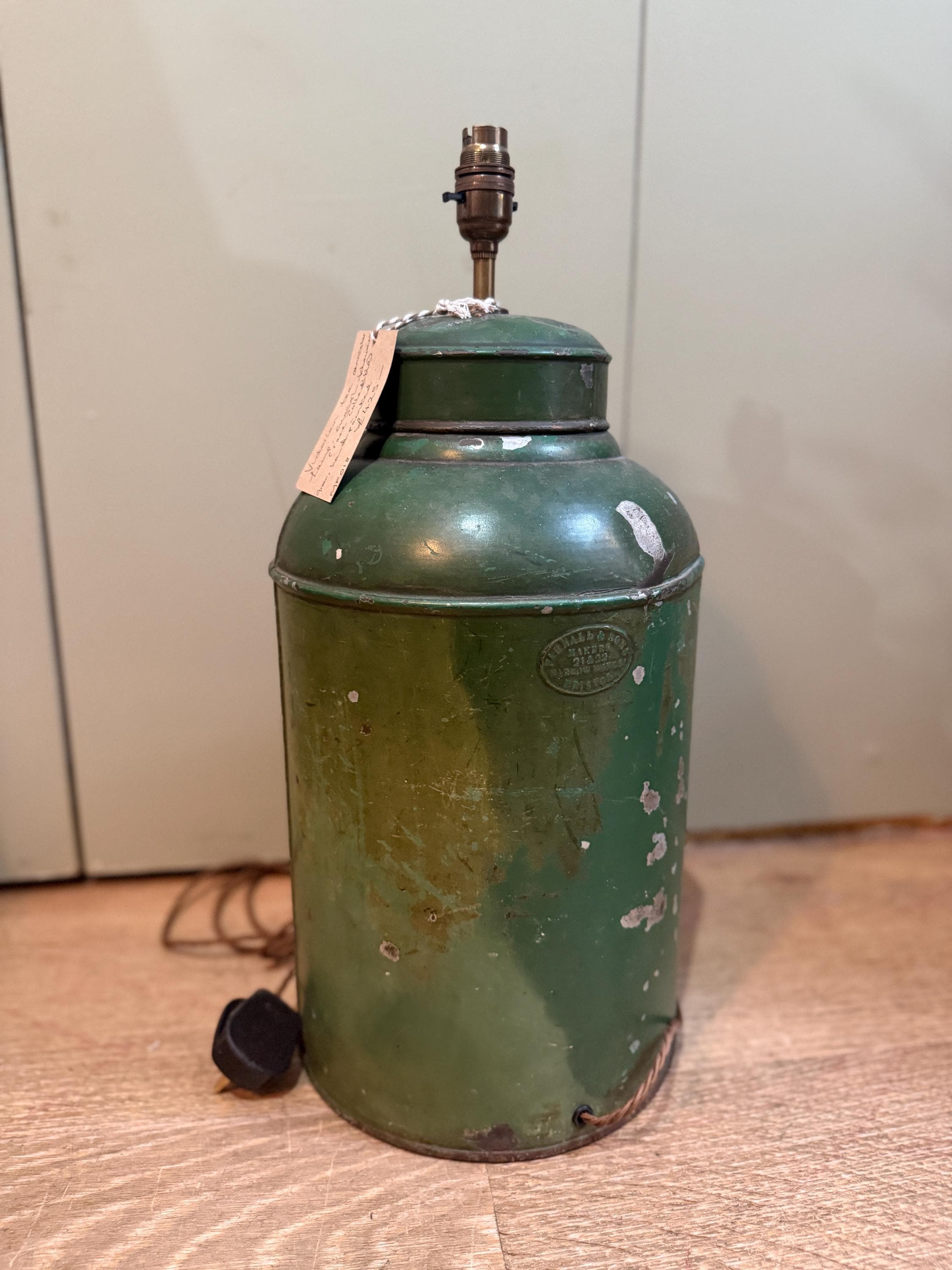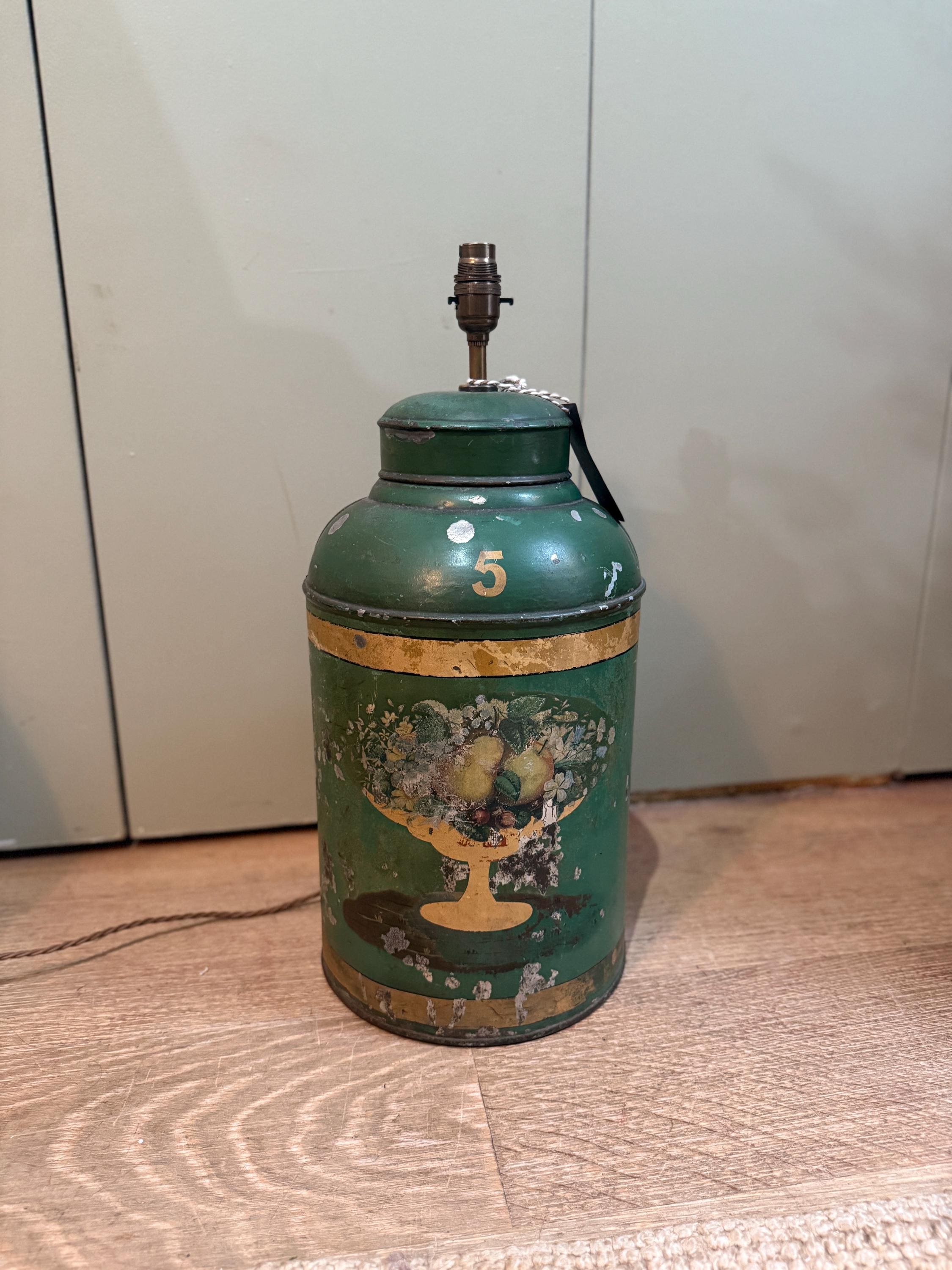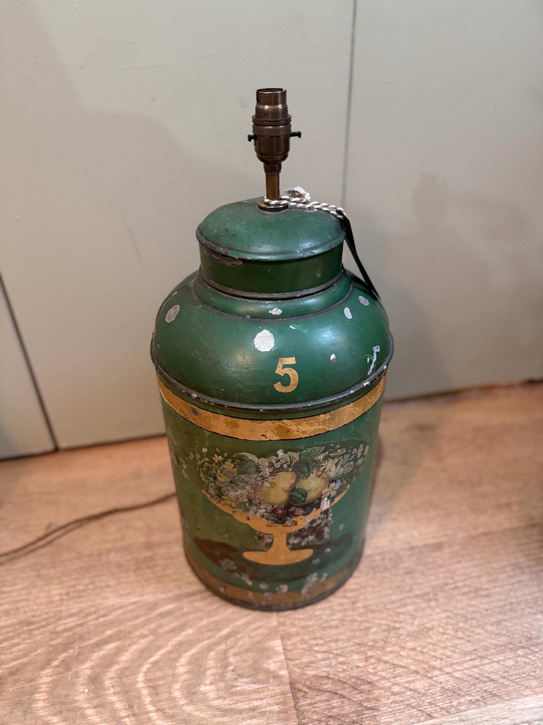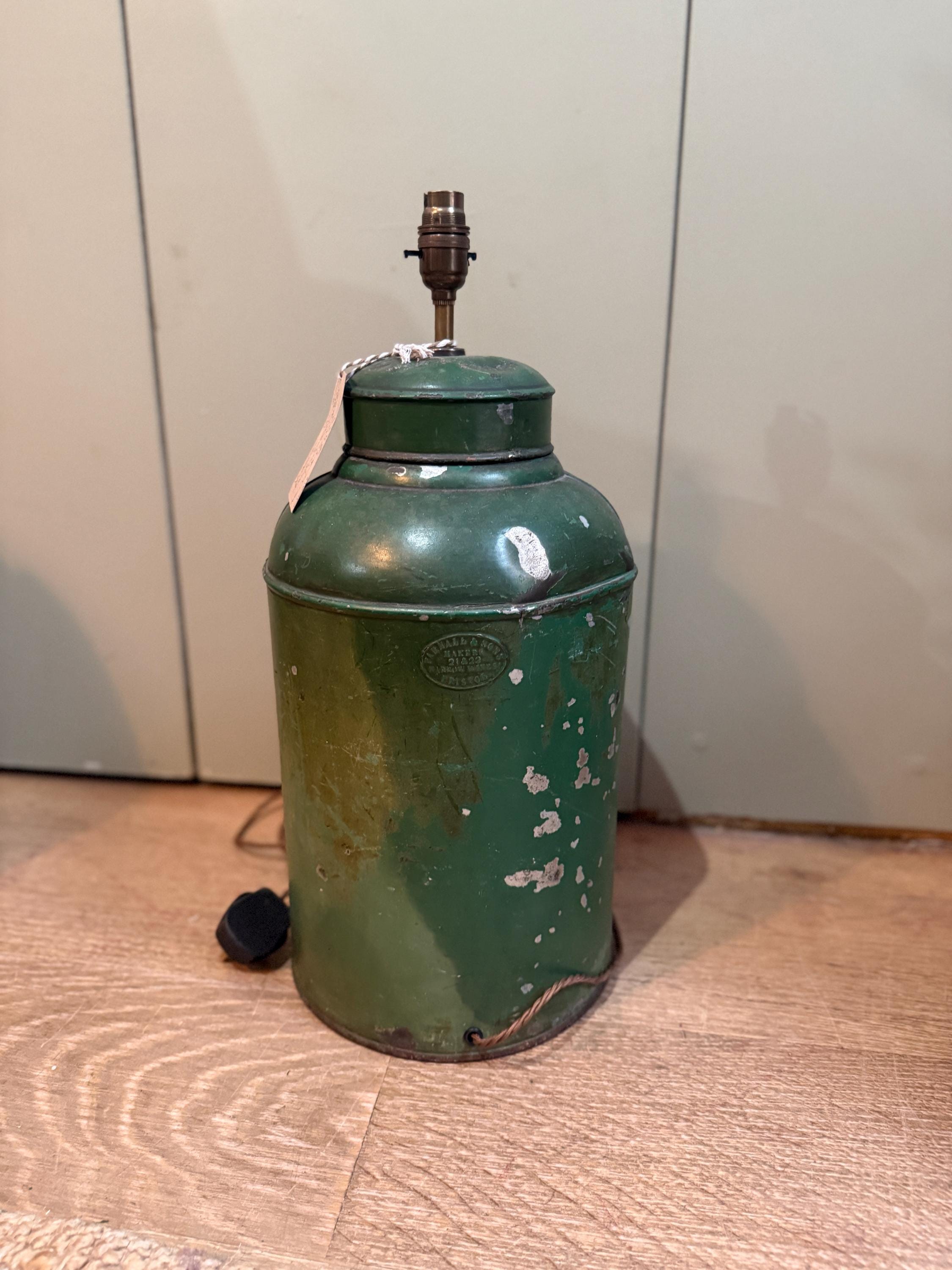 A large green antique toleware Tea Canister Lamp, sourced In England and newly converted into a lamp here in London by our antique lighting specialist with shiny brassware and a traditional style woven cord. The piece is circa 19th century and shows interesting patina due to its age.