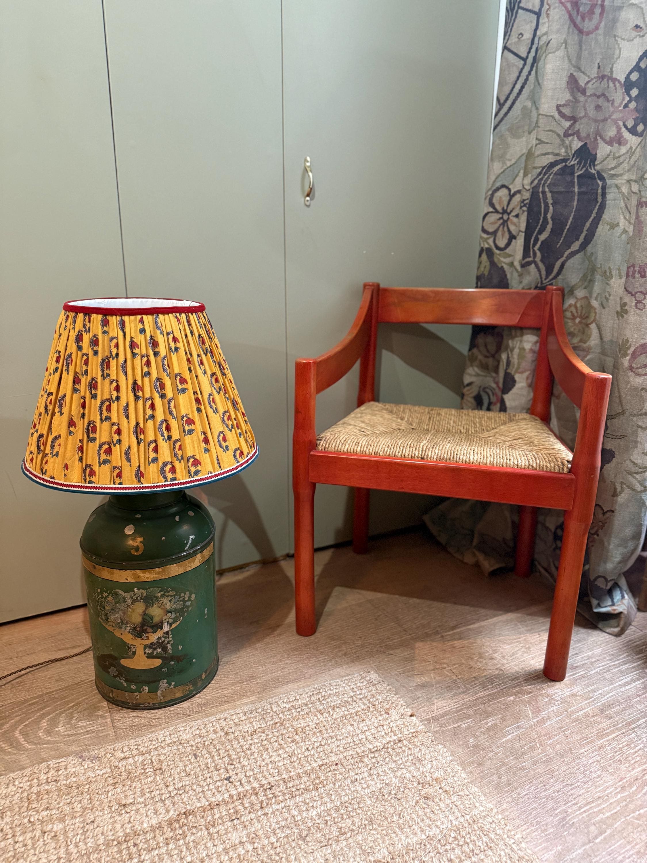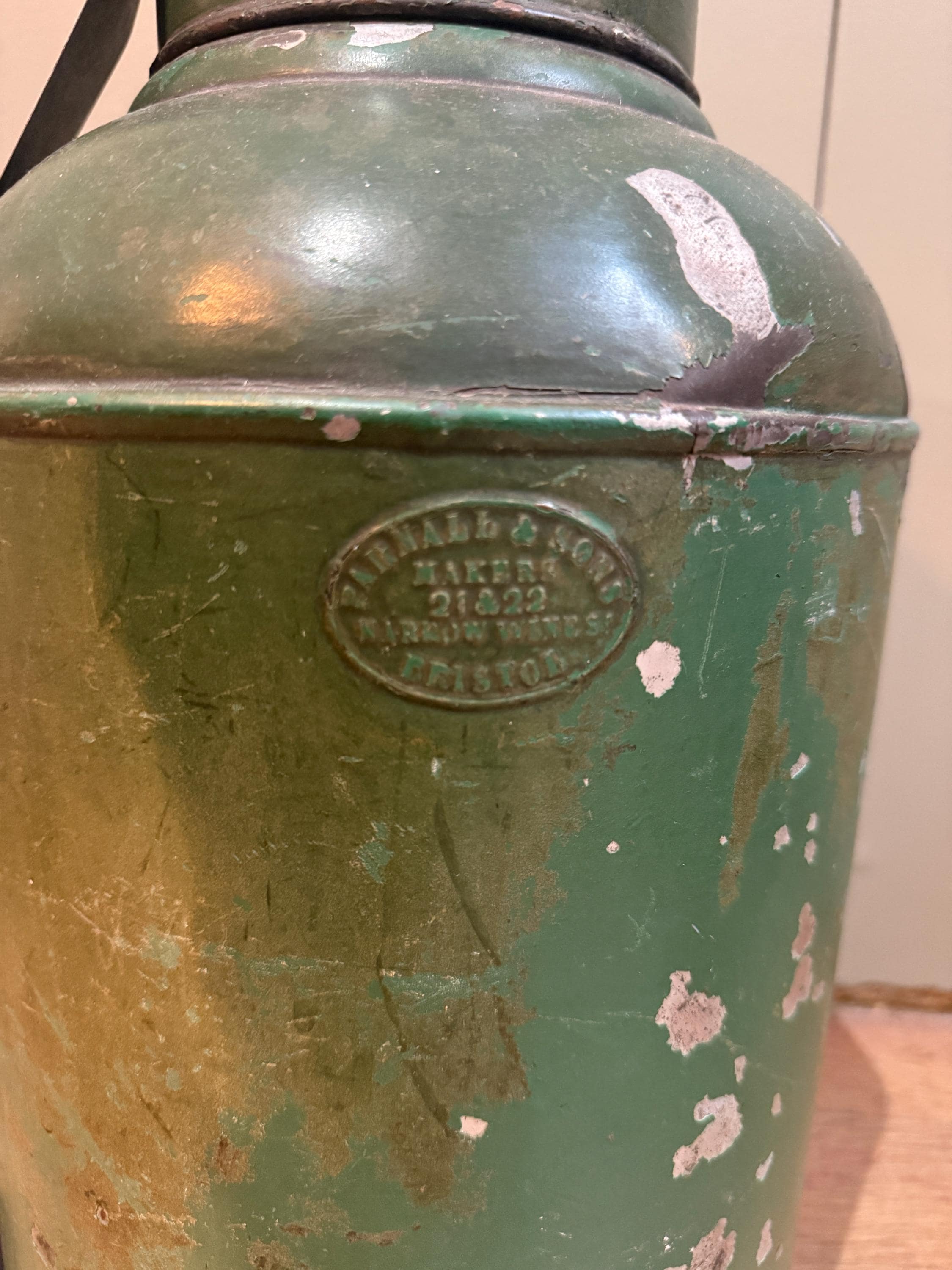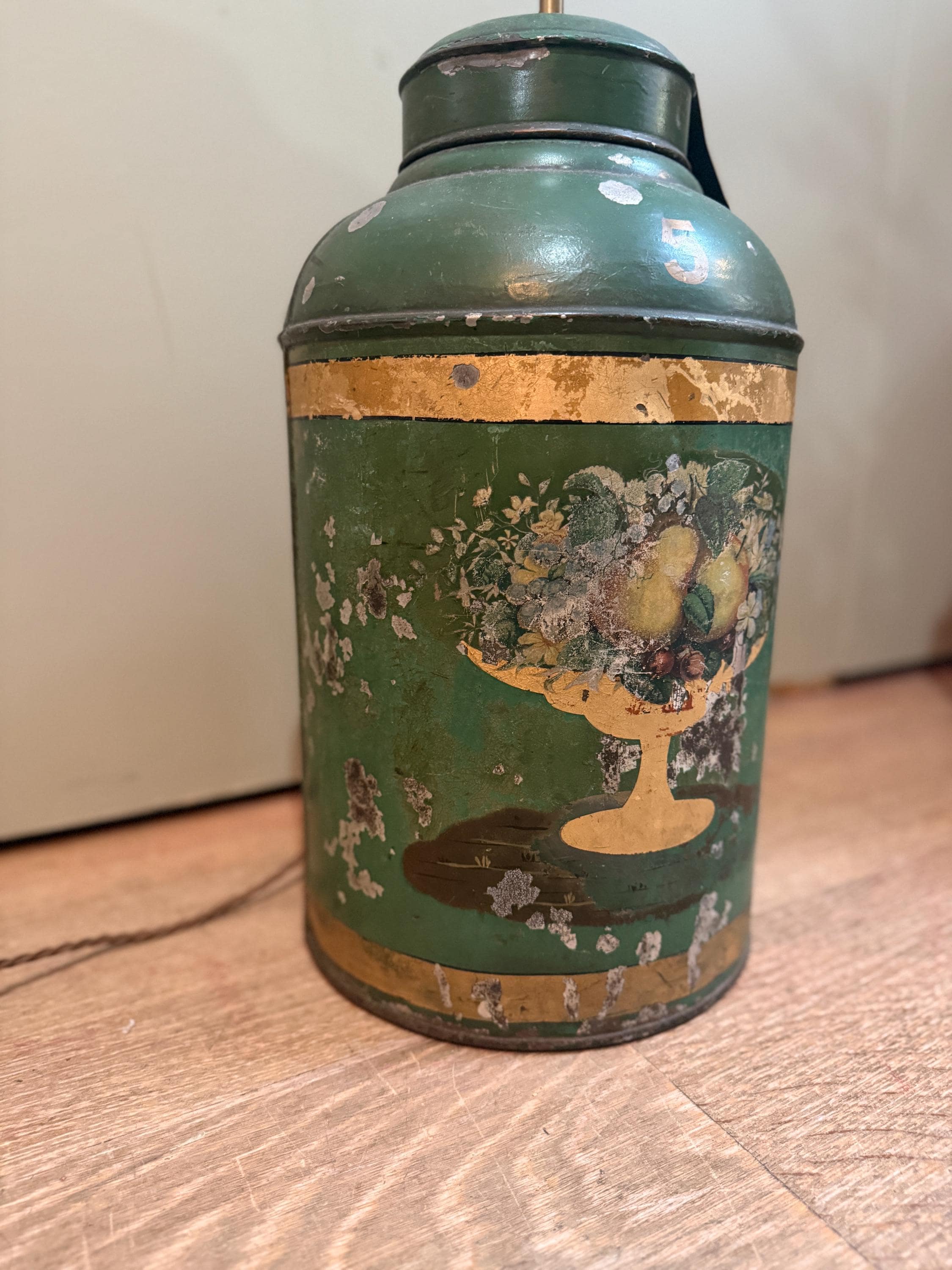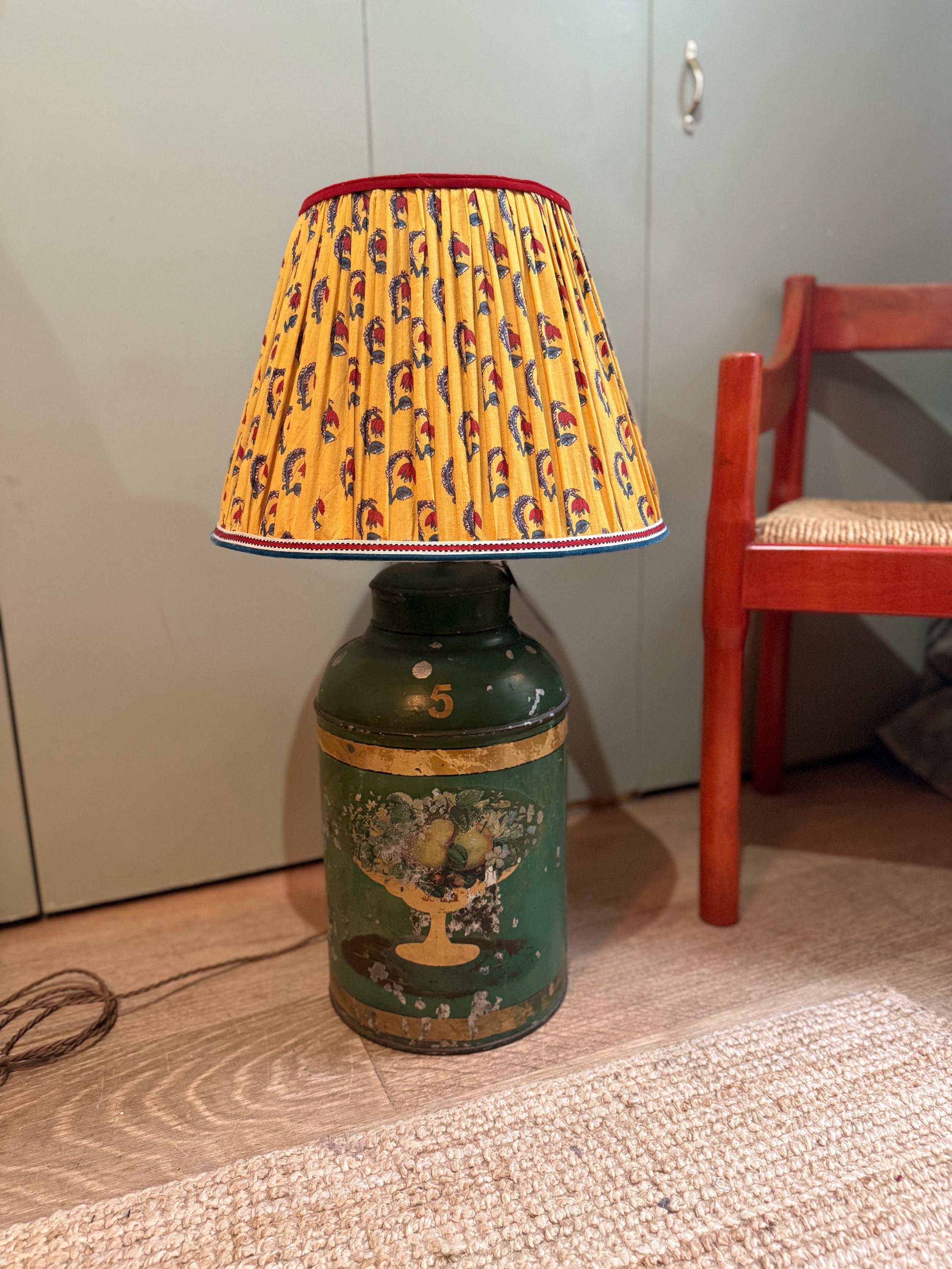 A large green antique toleware Tea Canister Lamp, sourced In England and newly converted into a lamp here in London by our antique lighting specialist with shiny brassware and a traditional style woven cord. The piece is circa 19th century and shows interesting patina due to its age.