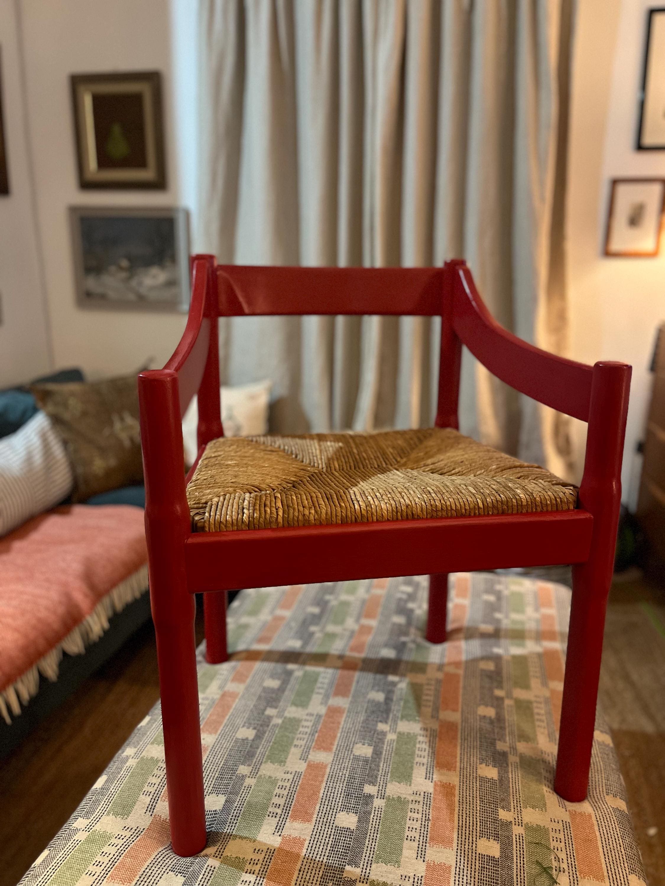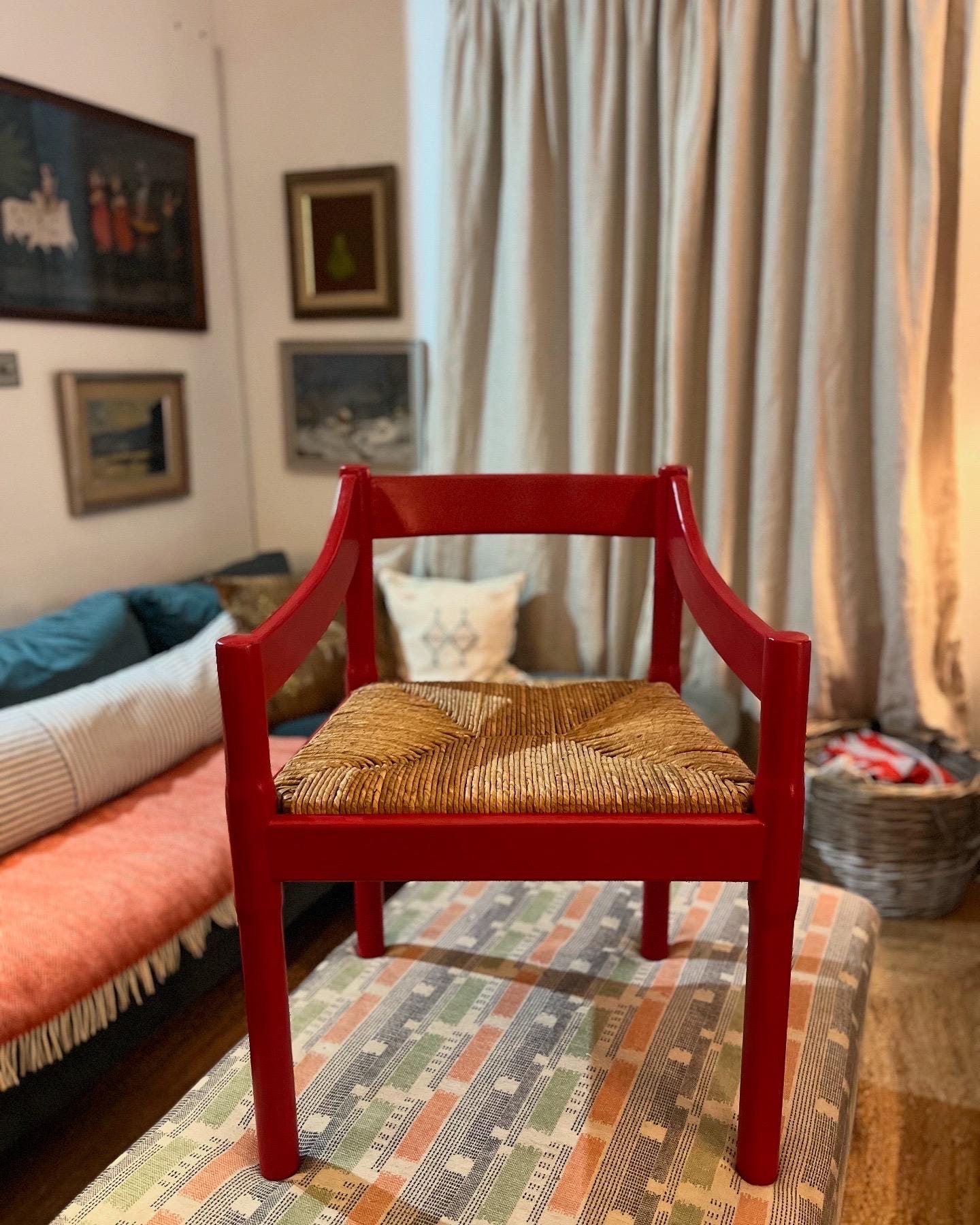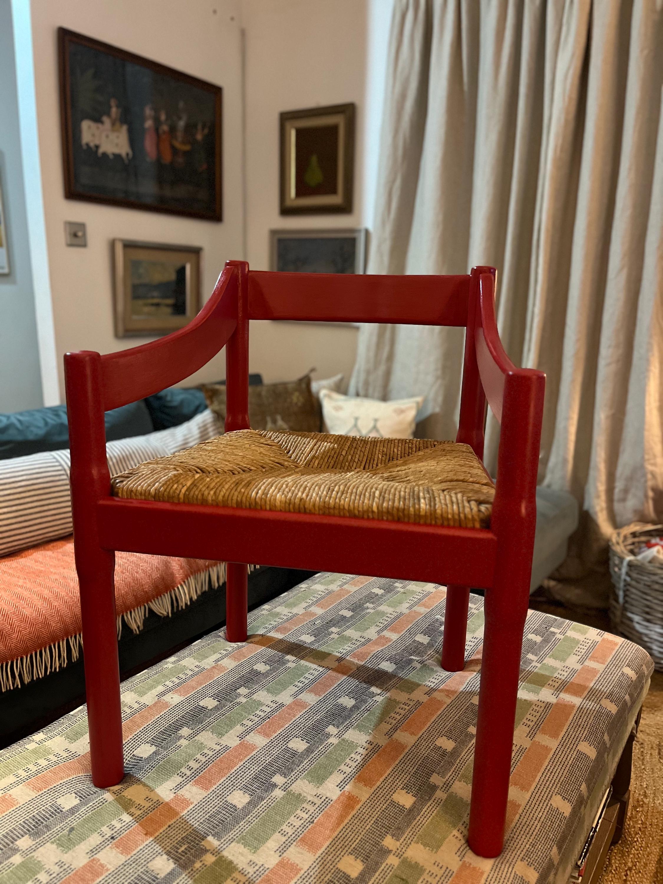 Eight c1960s Vico Magistretti “Carimate” carver chairs in classic Red, completely refurbished. The chairs are professionally painted and the seats re-rushed by an experienced artisan seat weaver with a lead time of approx 4 weeks. We can source more if you are after a larger set. The chairs can be purchased individually, as a set of 2, 4, 6, 8 or 10.