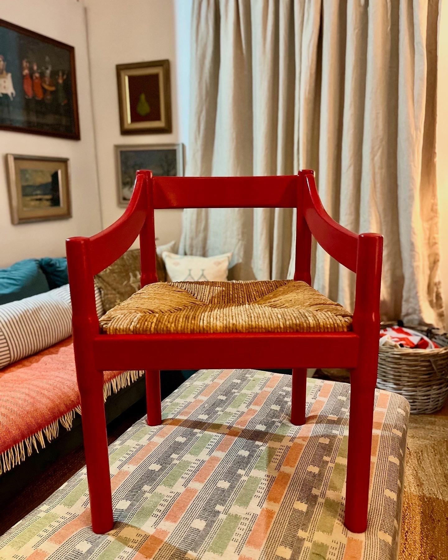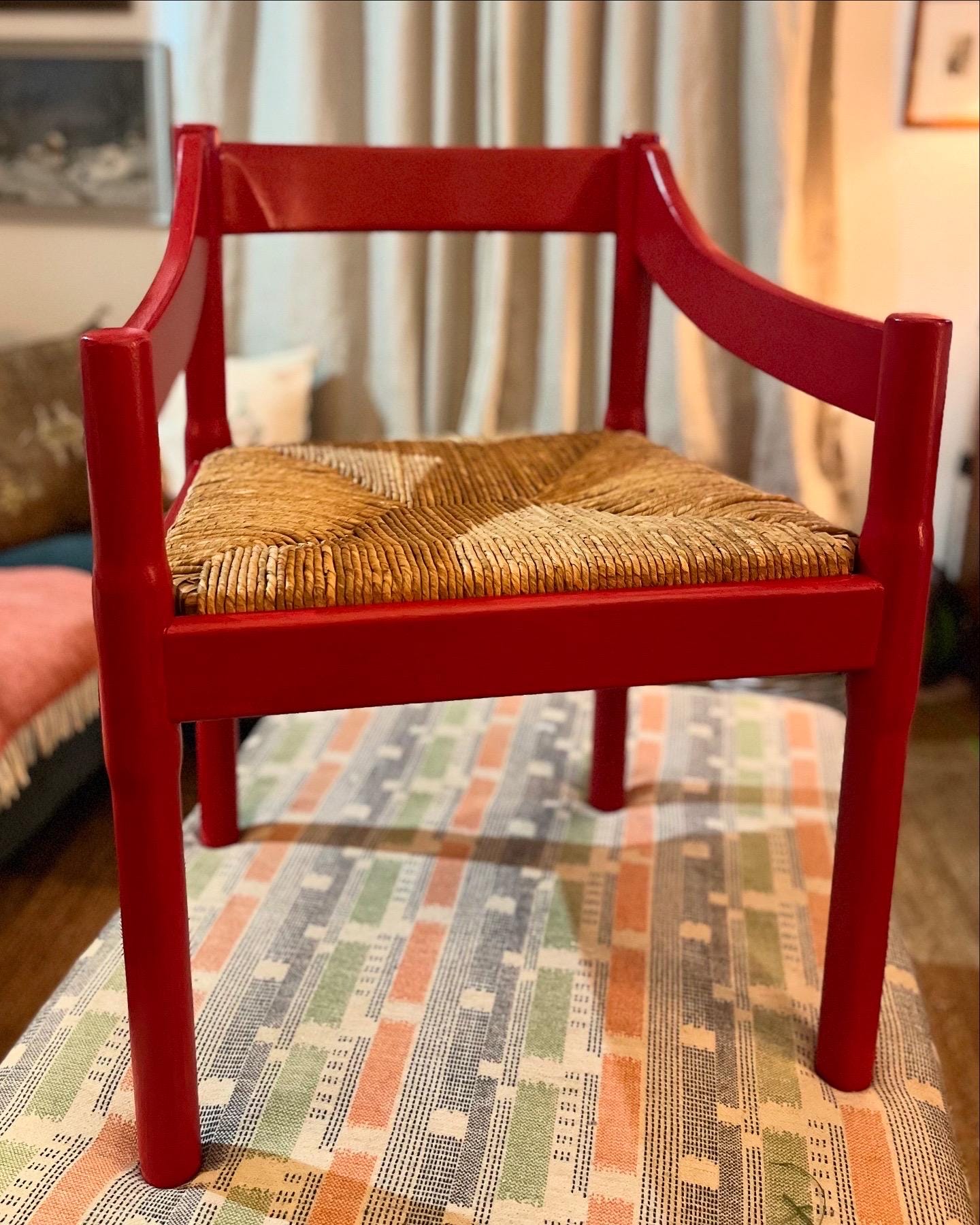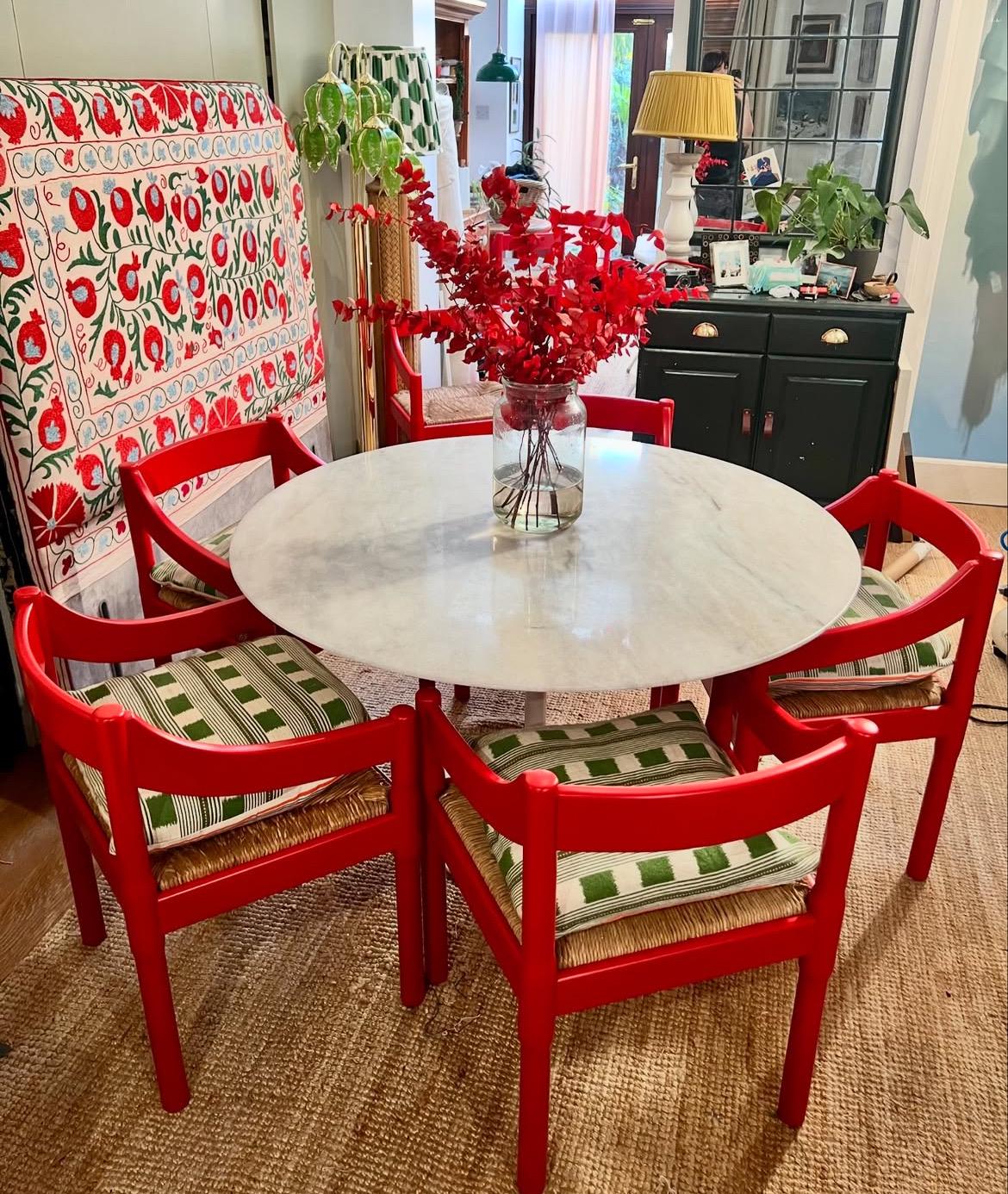 Eight c1960s Vico Magistretti “Carimate” carver chairs in classic Red, completely refurbished. The chairs are professionally painted and the seats re-rushed by an experienced artisan seat weaver with a lead time of approx 4 weeks. We can source more if you are after a larger set. The chairs can be purchased individually, as a set of 2, 4, 6, 8 or 10.