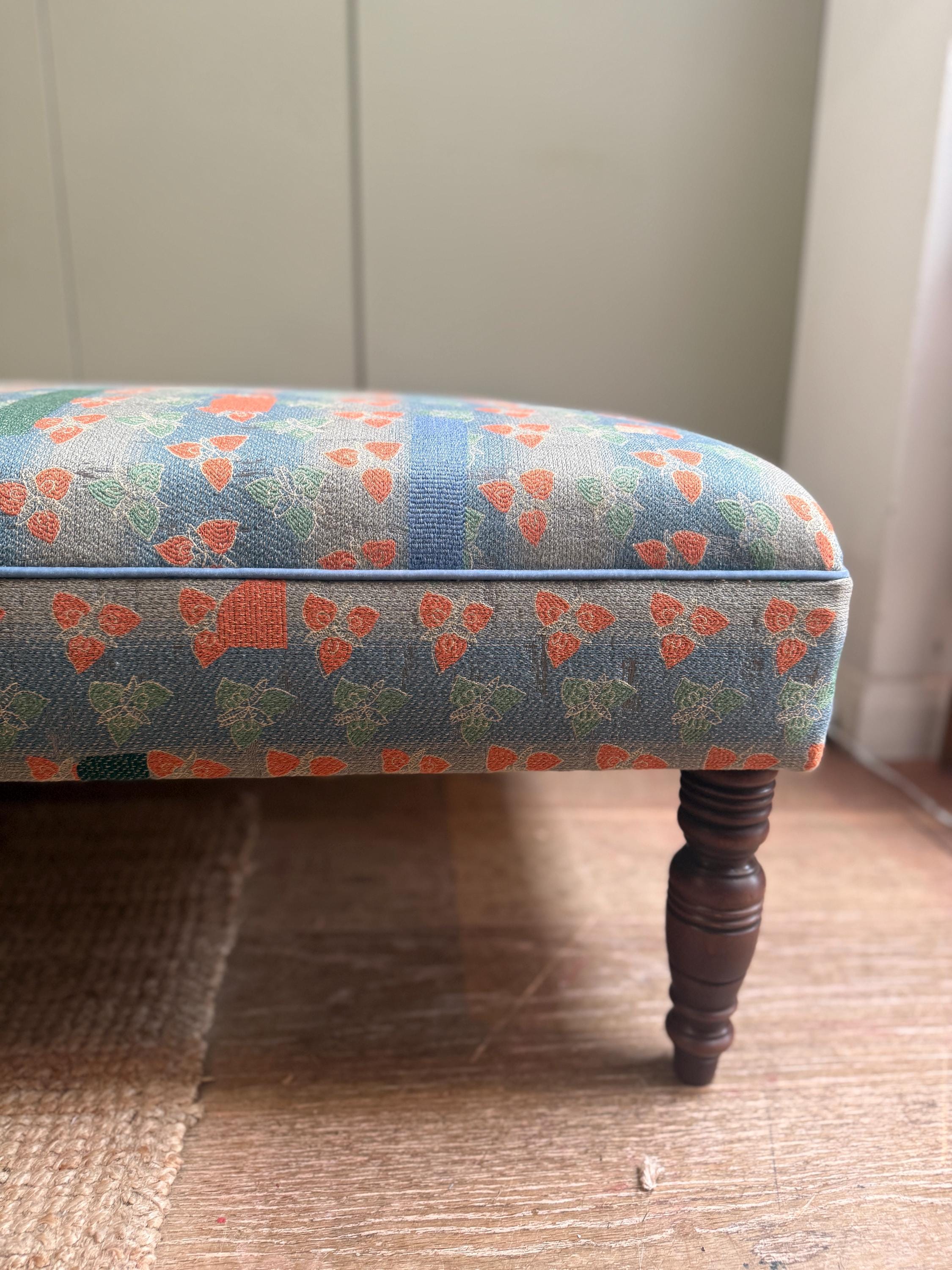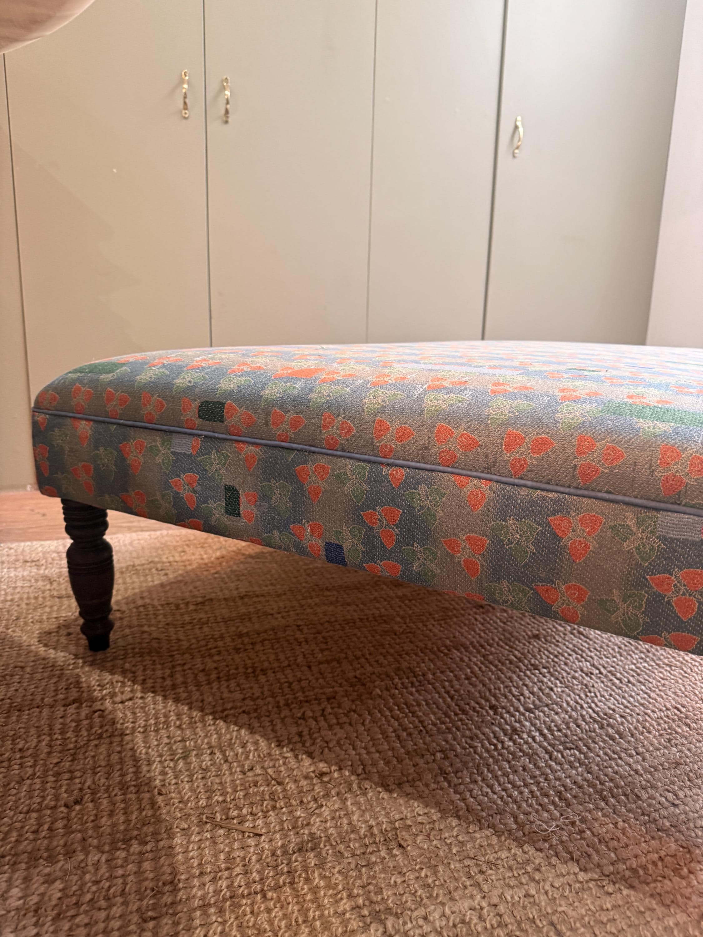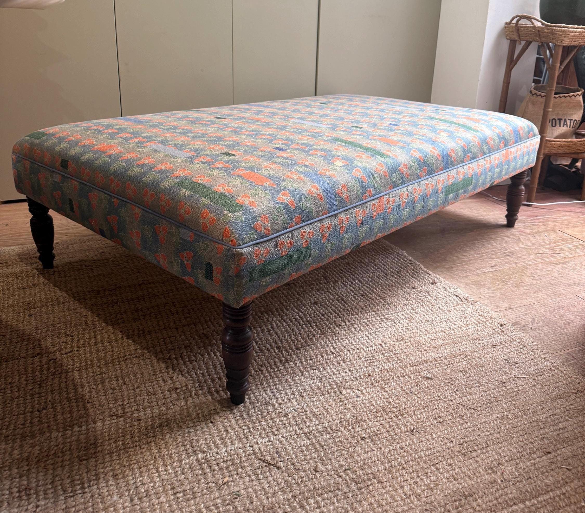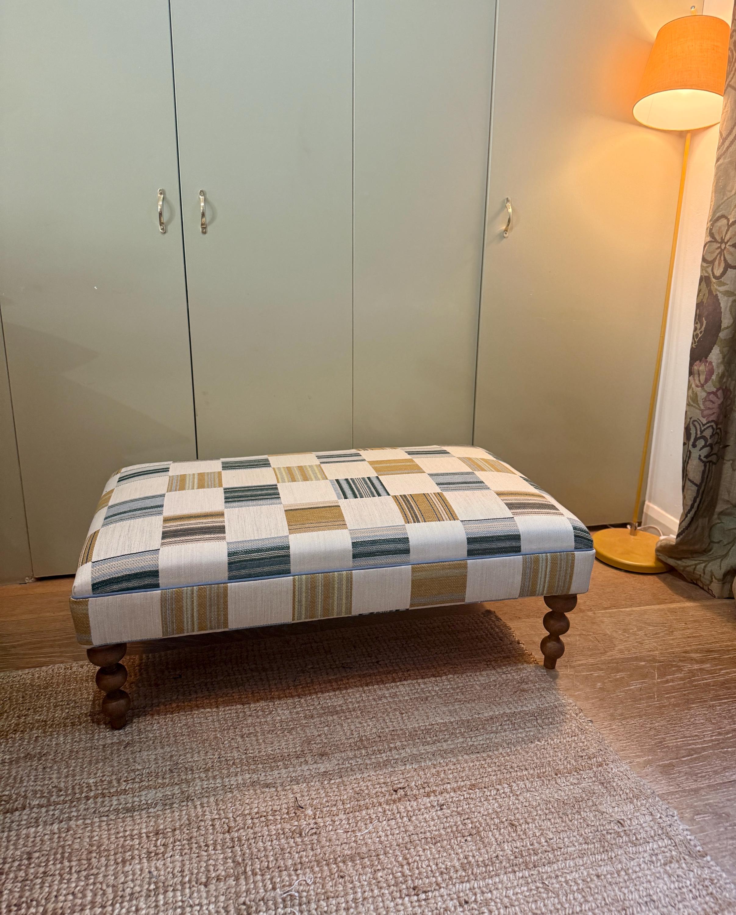 Our traditional ottoman style footstool in Studio Ashby, seen here in Afua - see fabric and colour choices in the photo gallery and personalise with any colour piping and turned beech legs stained in warm beeswax.