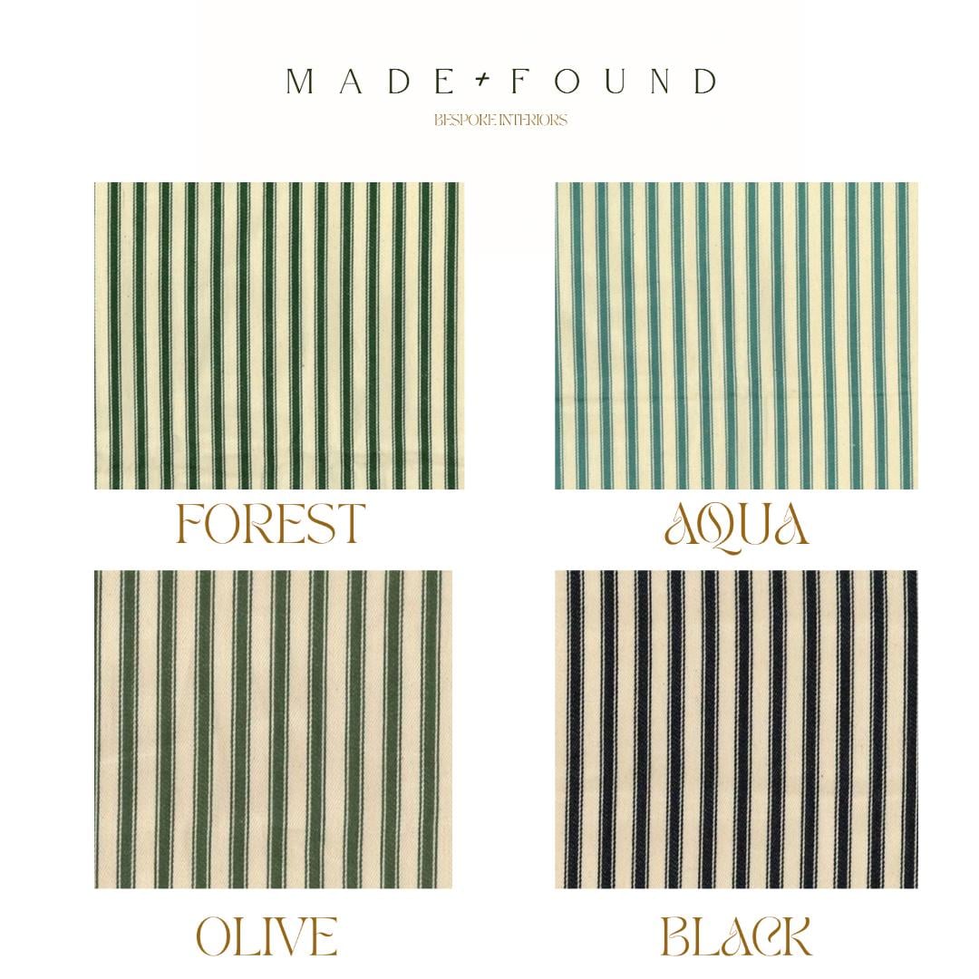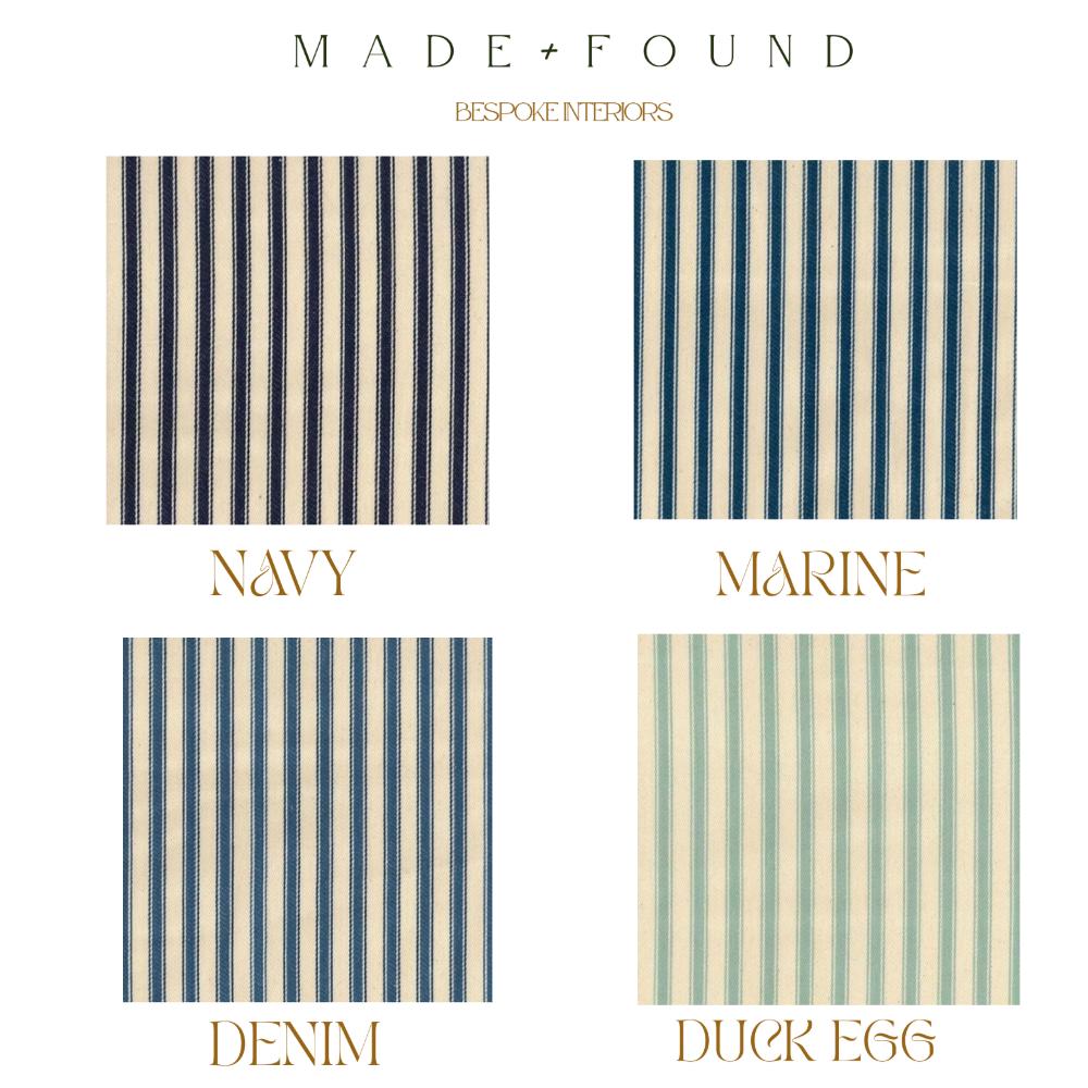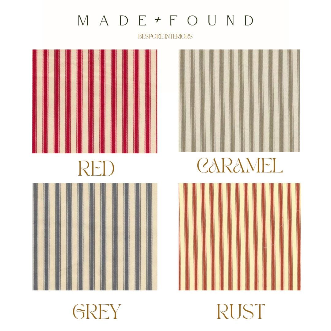 Handmade ‘flop’ shower curtain in cotton ticking stripe and contrasting trim. The shower curtain is available in a variety of sizes in the dropdown menu - please message us your dimensions if your size isn't listed so we can quote. We can source the grosgrain trim in most shades. Please add your preference in the personalisation box and send a photo or link to the colour so we can closely match it.