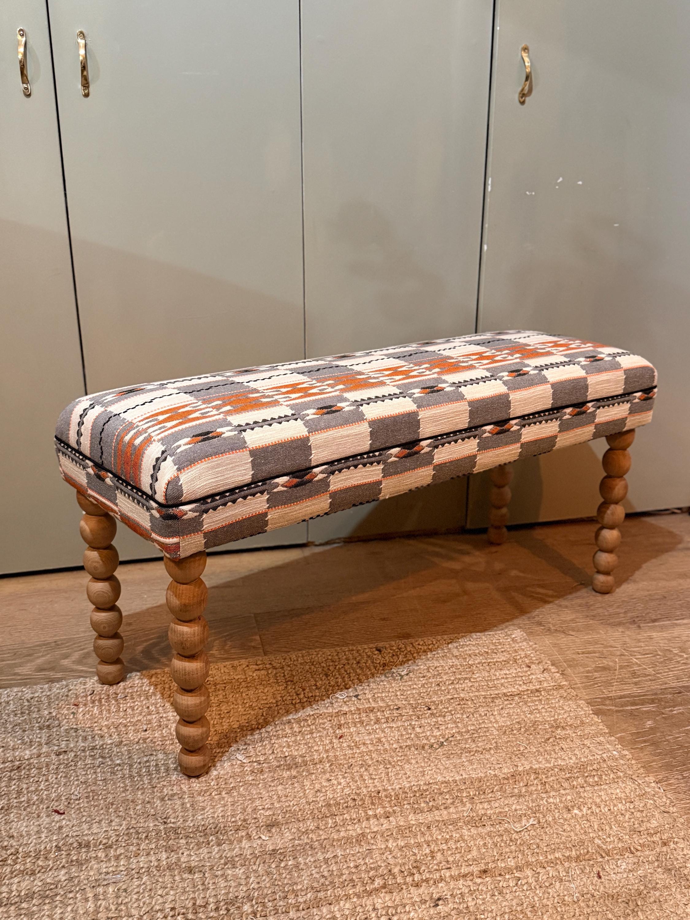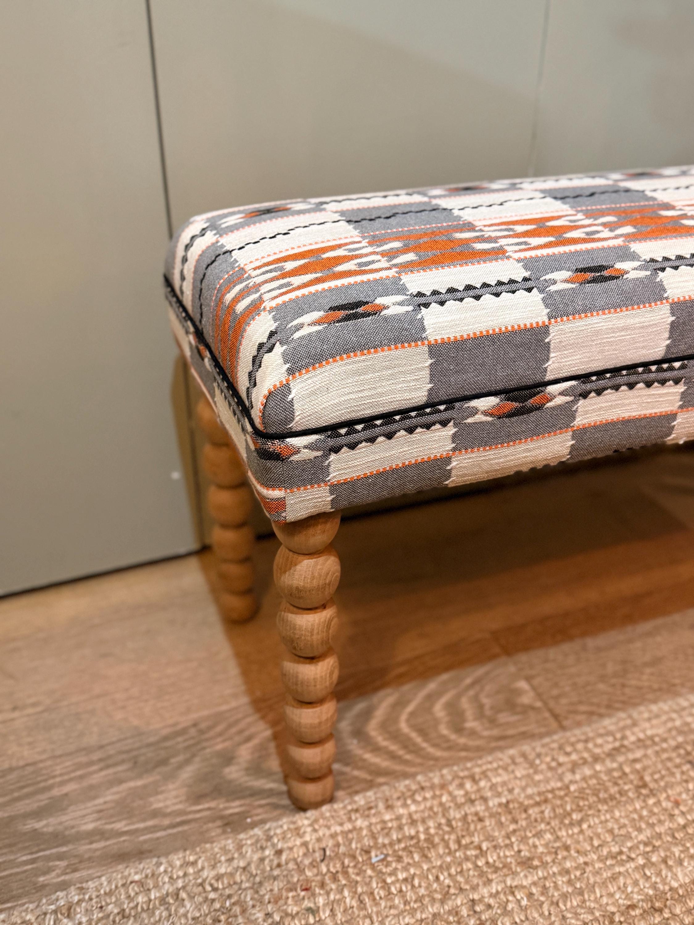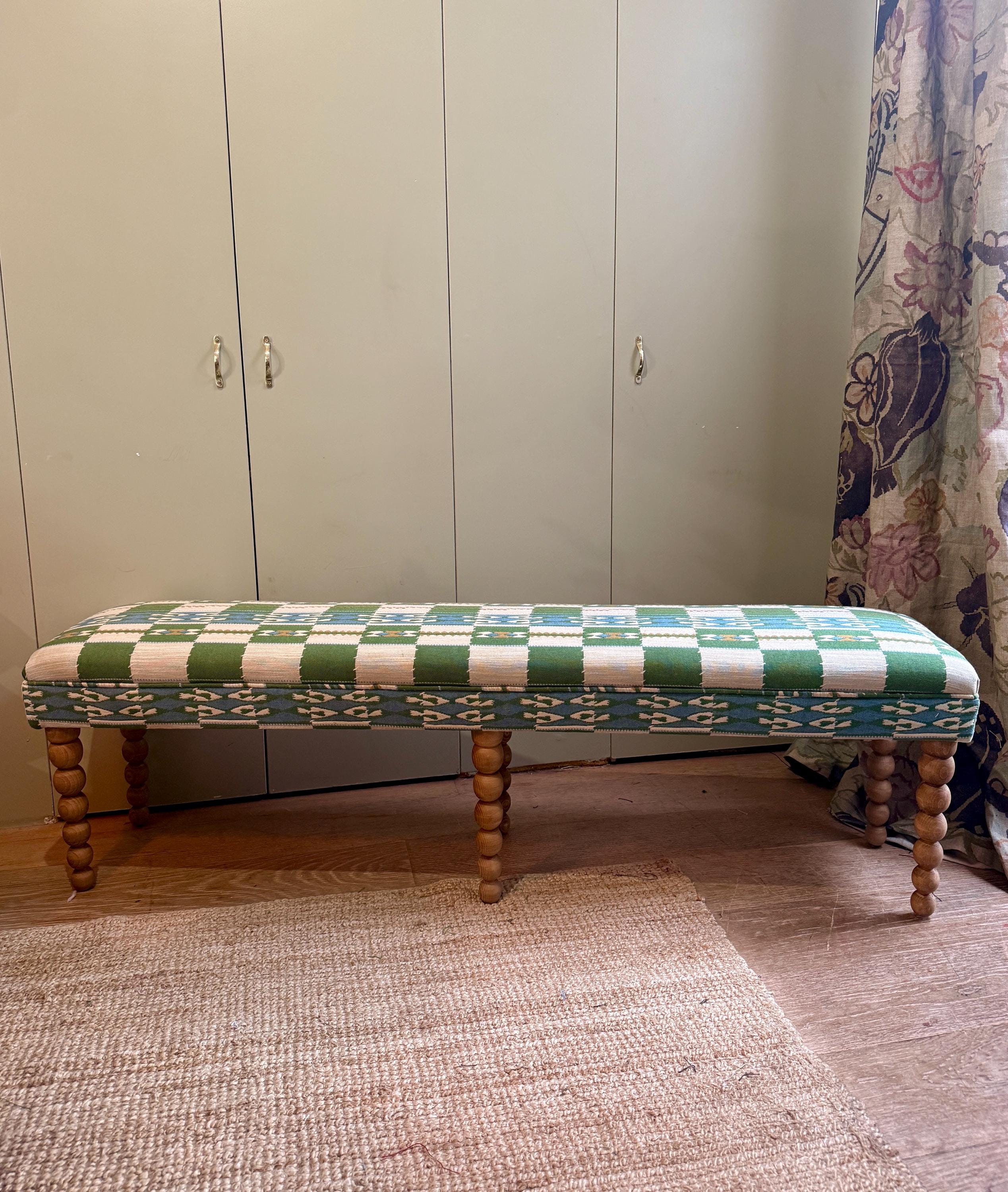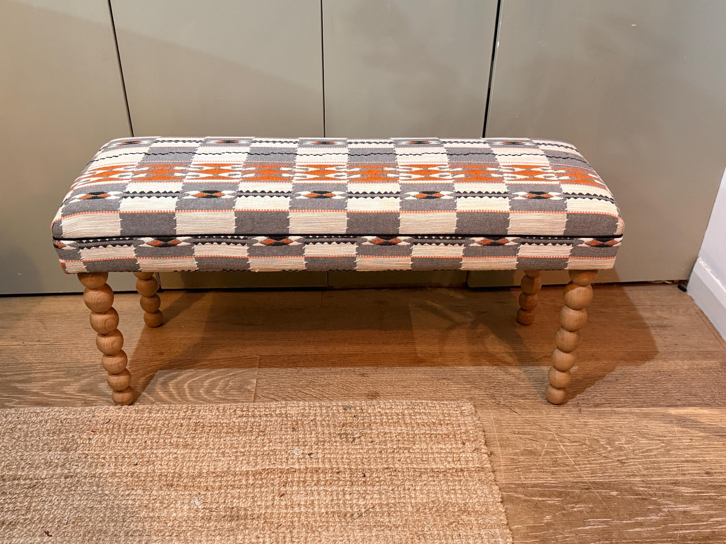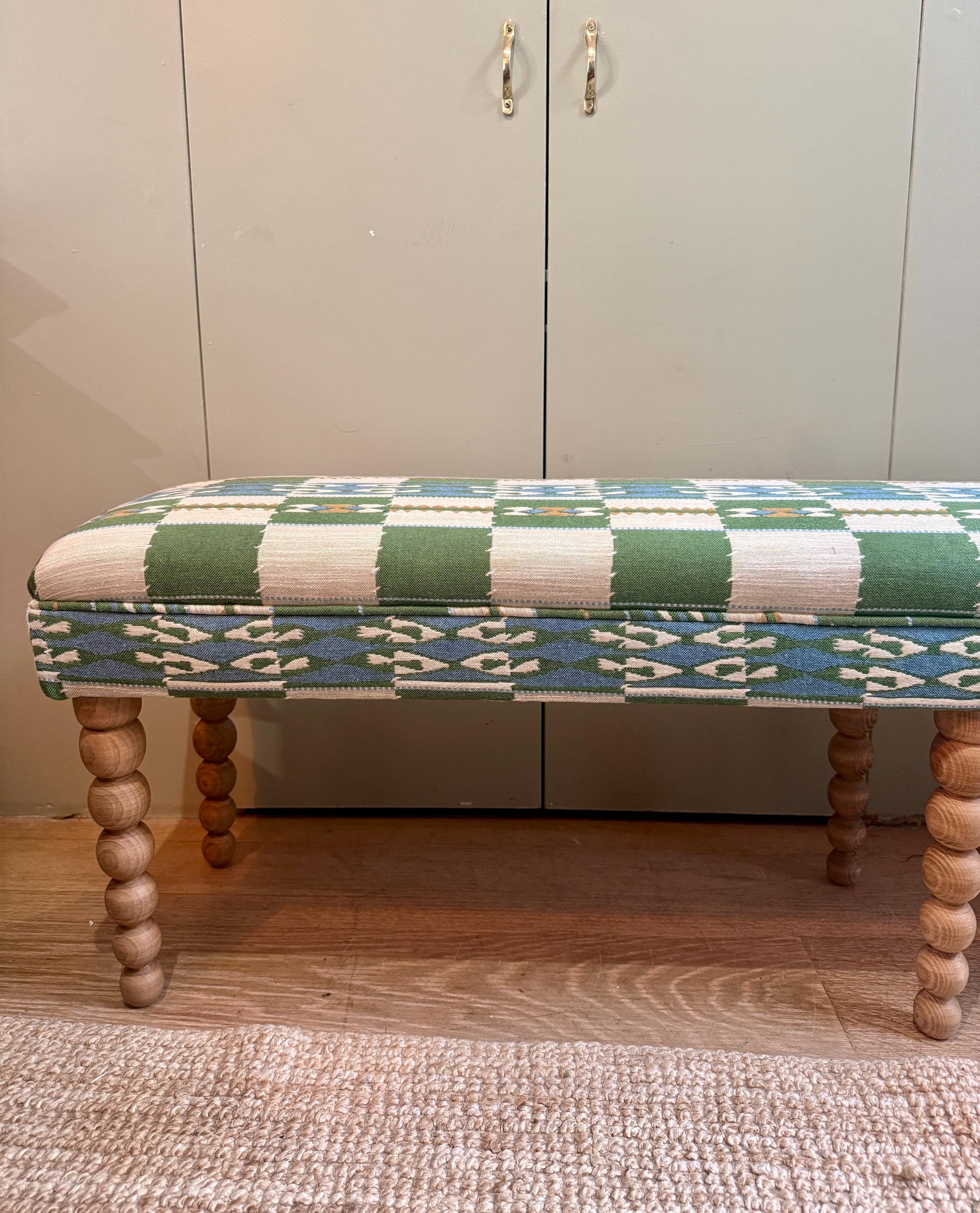 Bespoke upholstered bench in eye catching Christopher Farr Cloth “Chubby Check” by designer Kit Kemp with piping detail and stunning bobbin style wooden legs.
