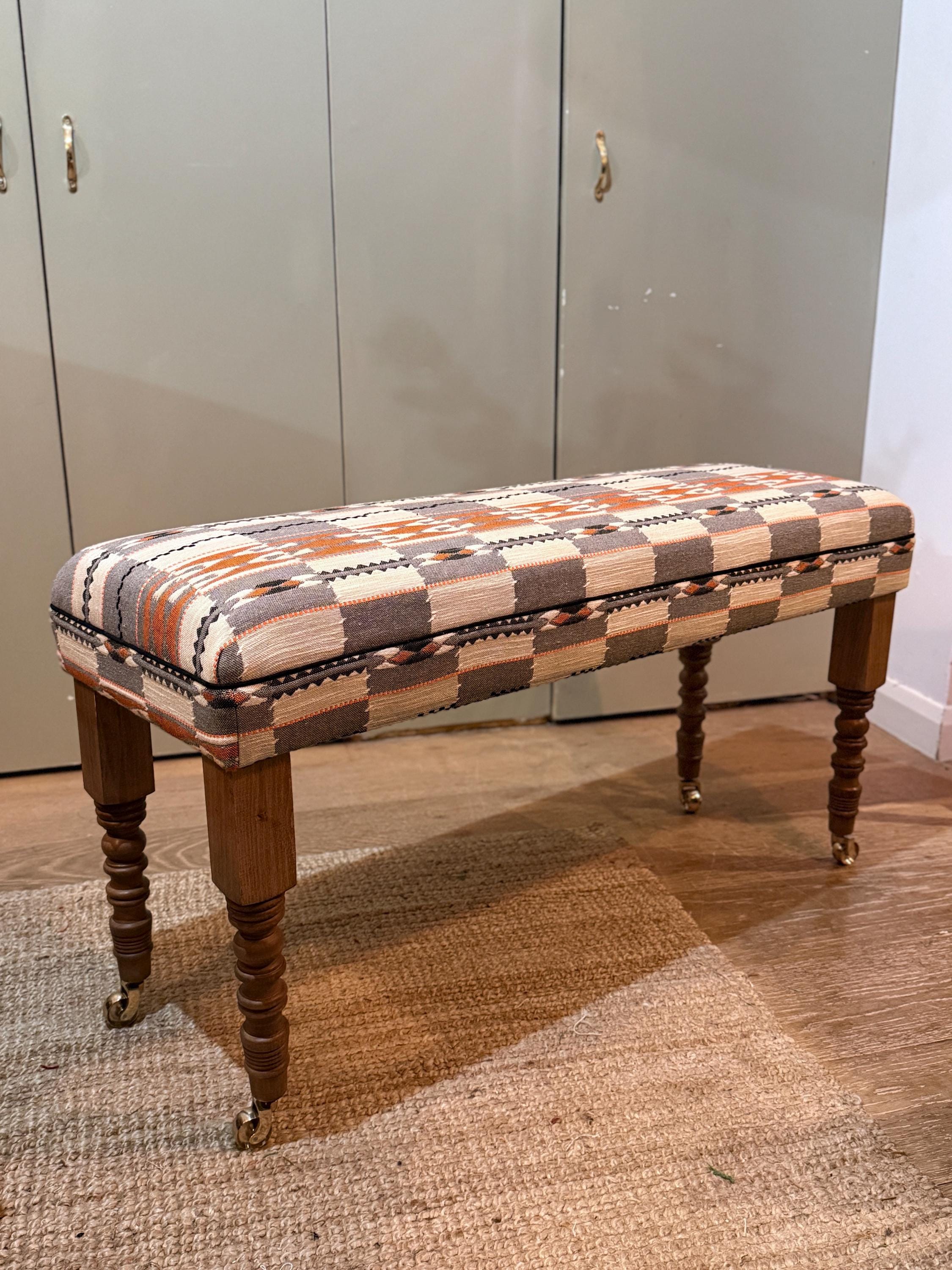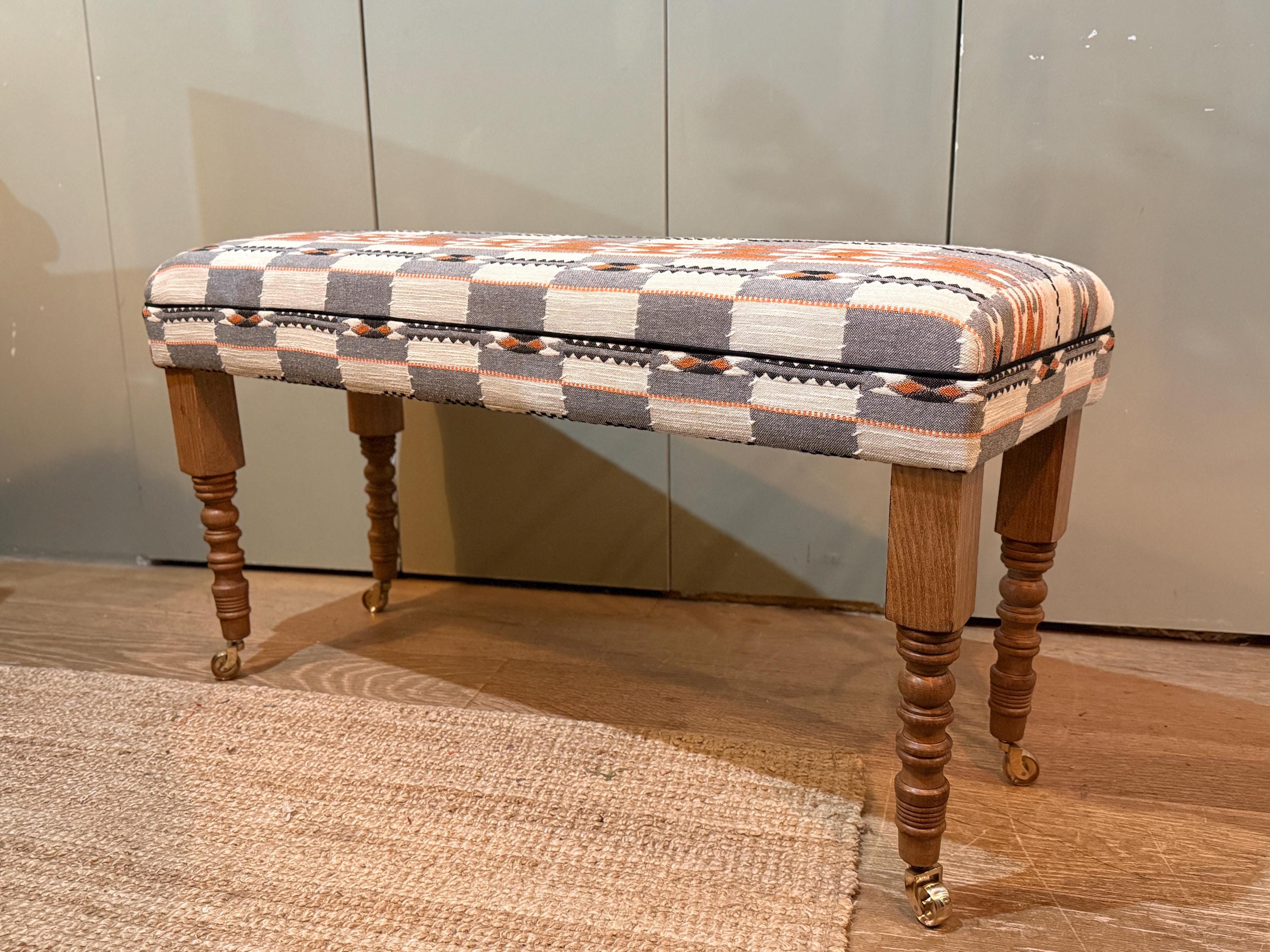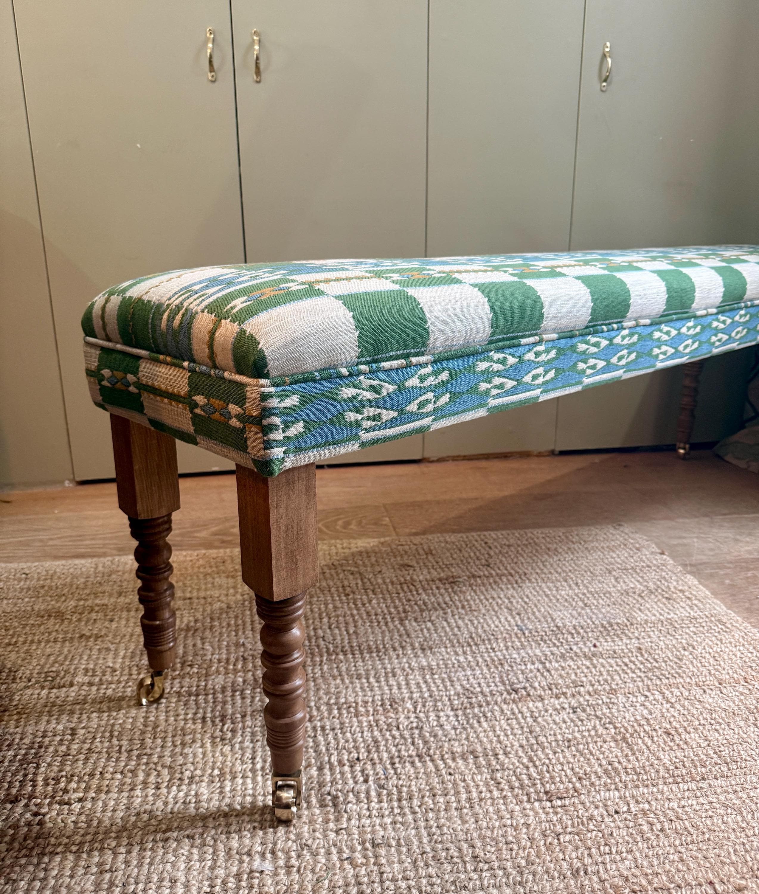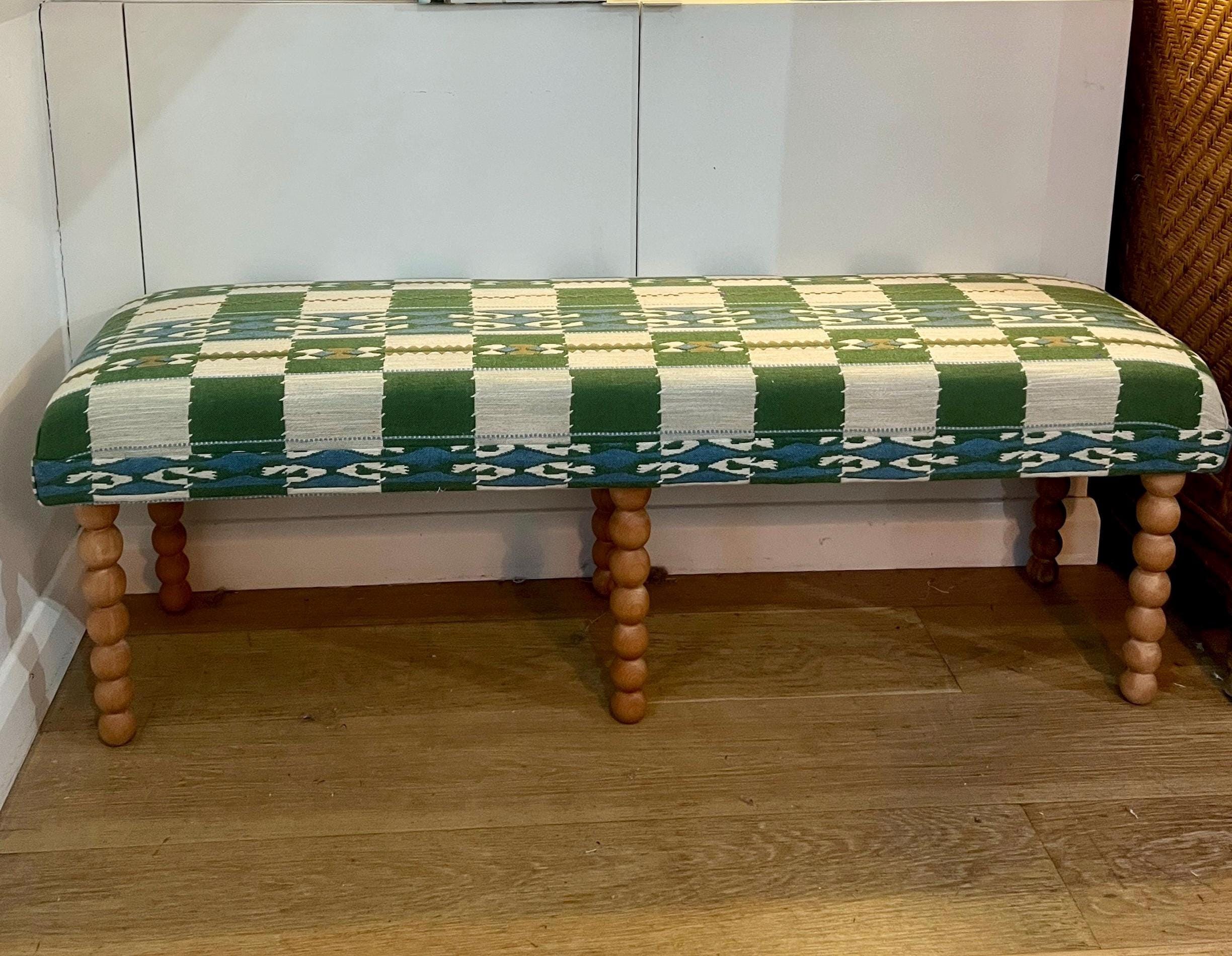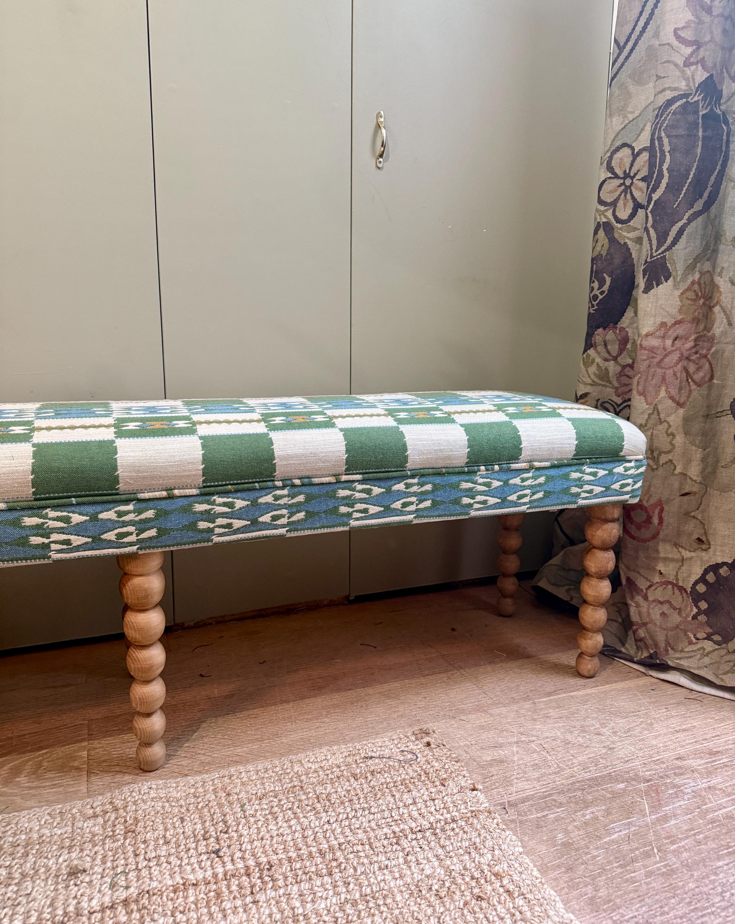 Bespoke upholstered bench in eye catching Christopher Farr Cloth “Chubby Check” by designer Kit Kemp with piping detail and stunning bobbin style wooden legs.