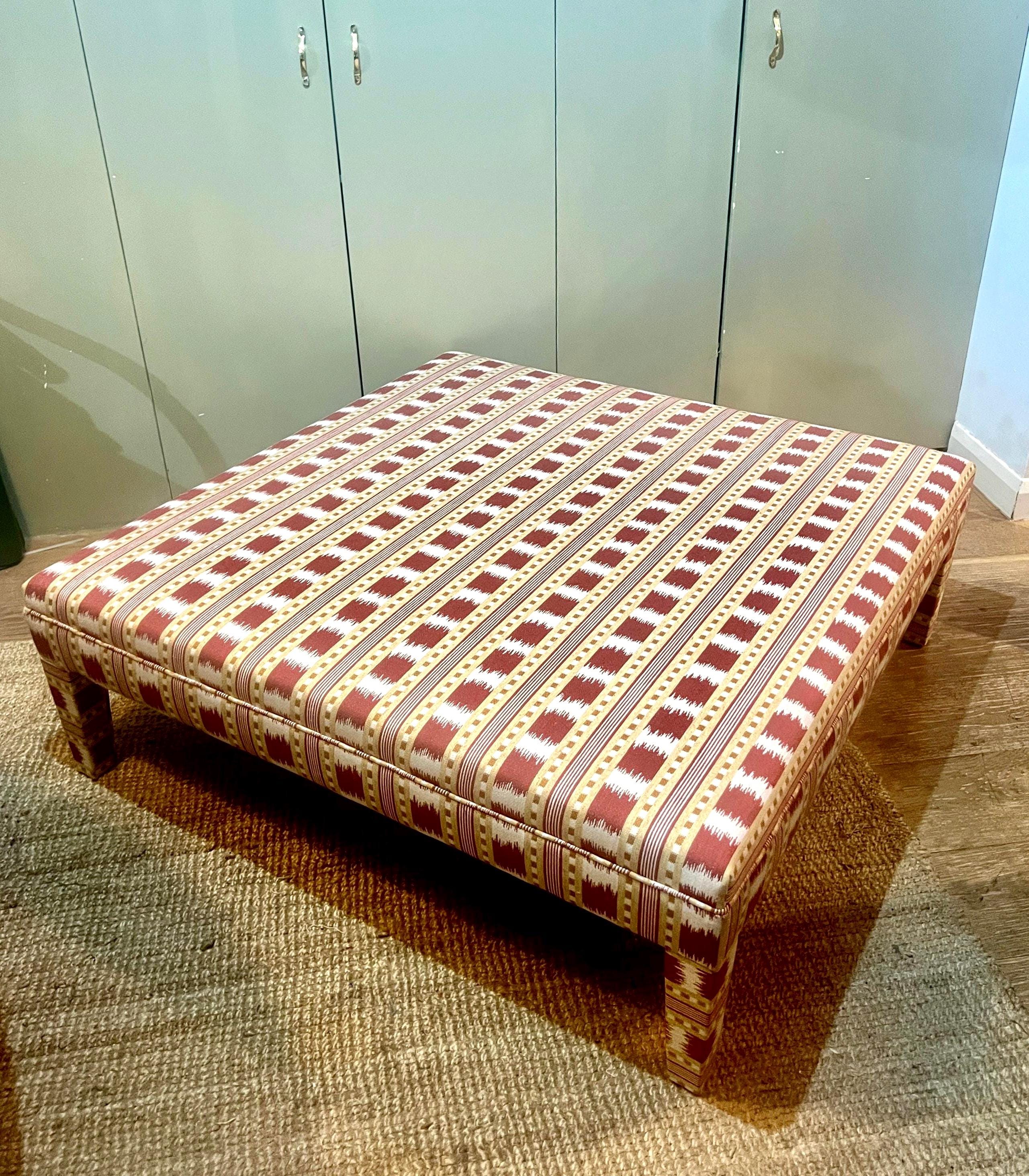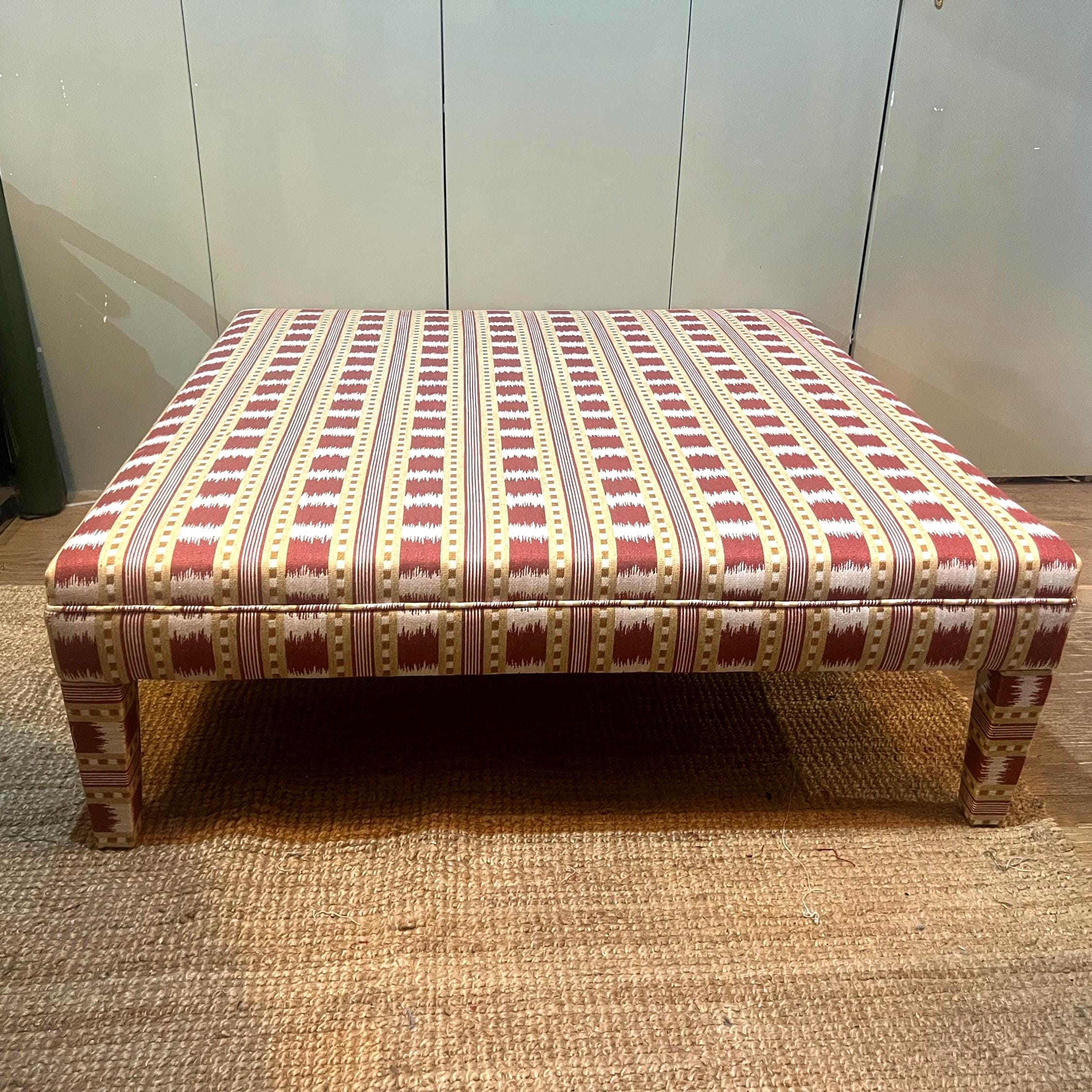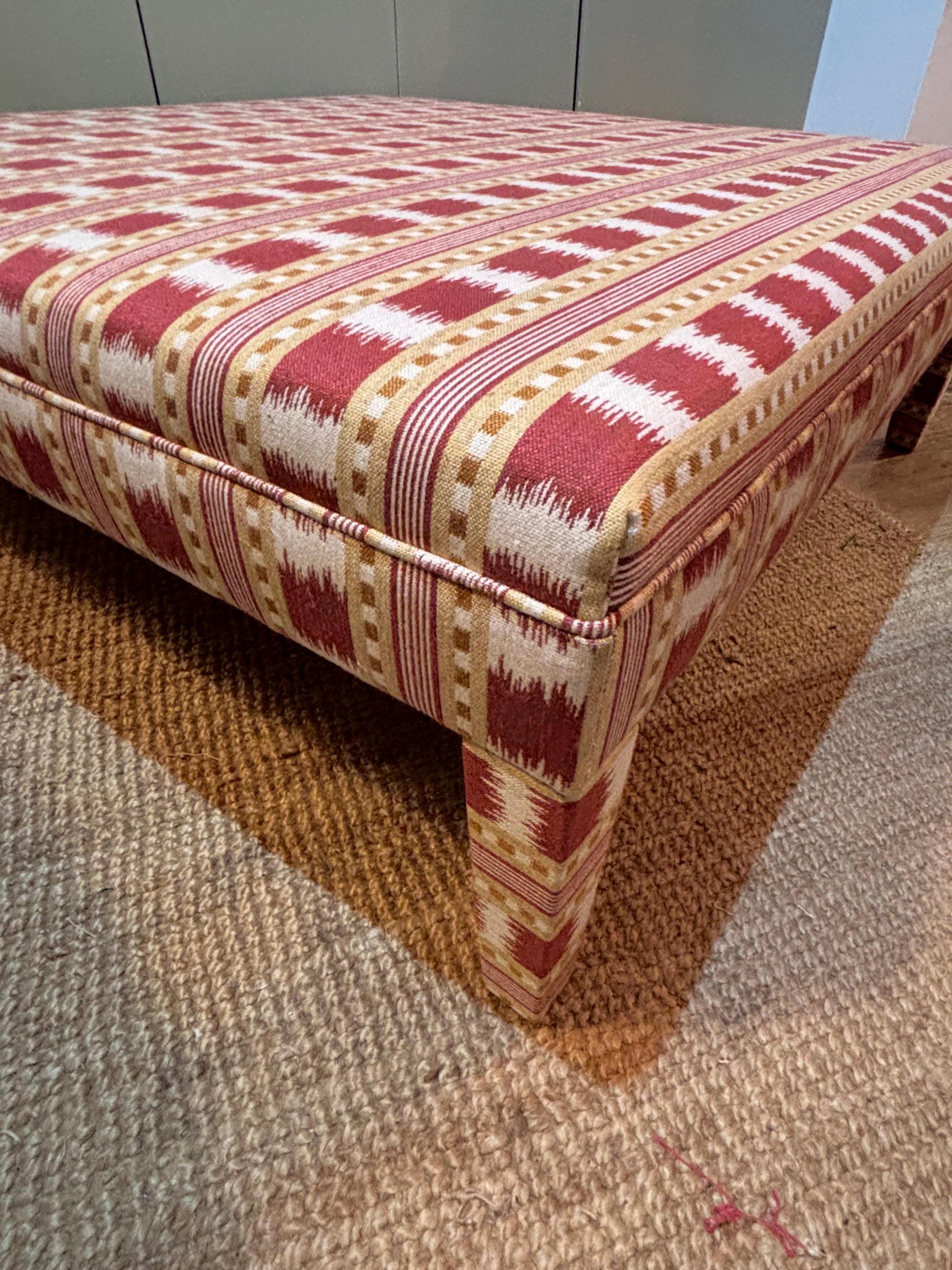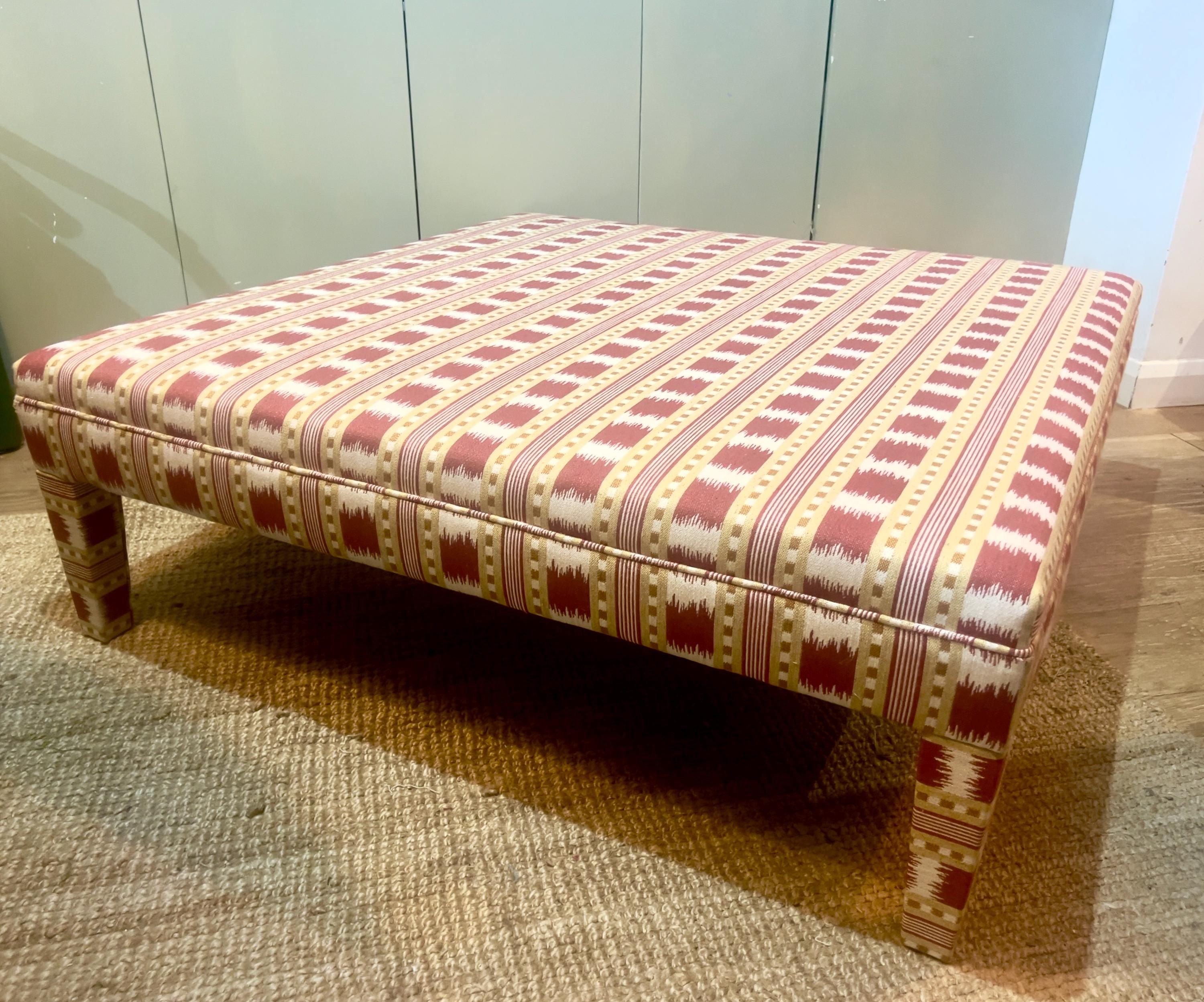 Our fully upholstered “Whitmore Footsool”, seen here in James Hare Red Paxton fabric, is sold excluding fabric. You can either send us your own fabric or we can assist you in choosing a fabric and order it for you via the various accounts we hold with fabric designers (see below list below)