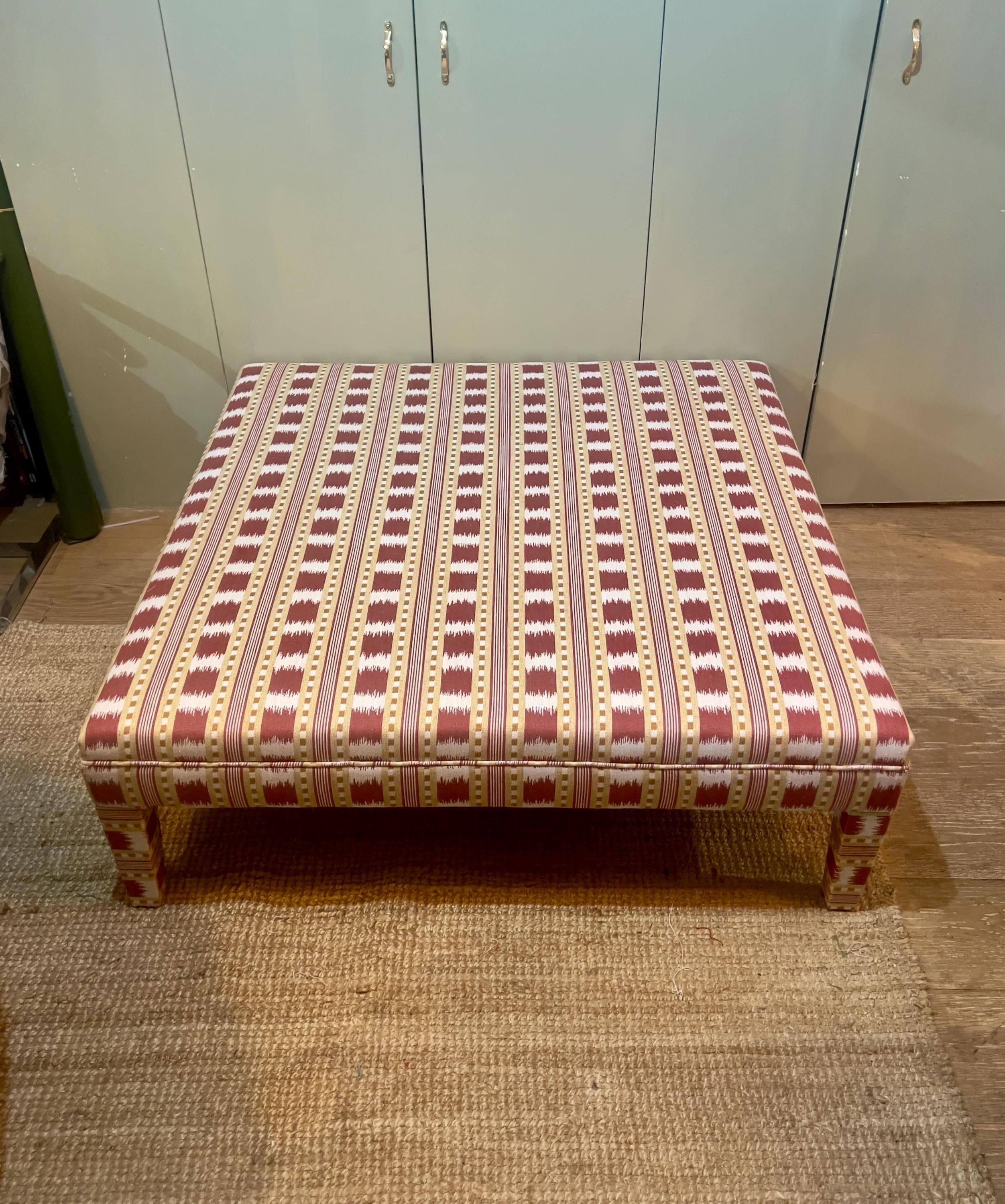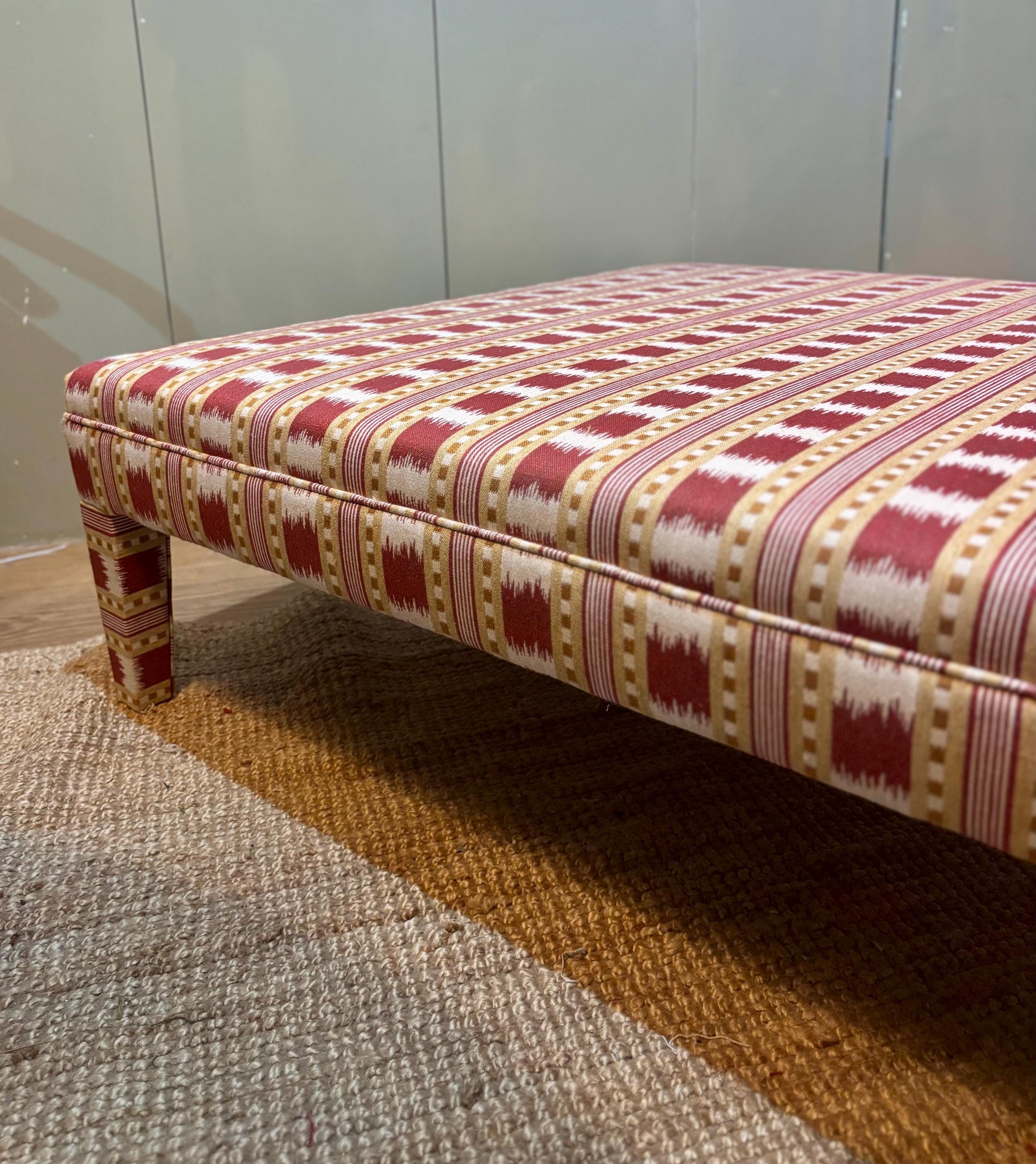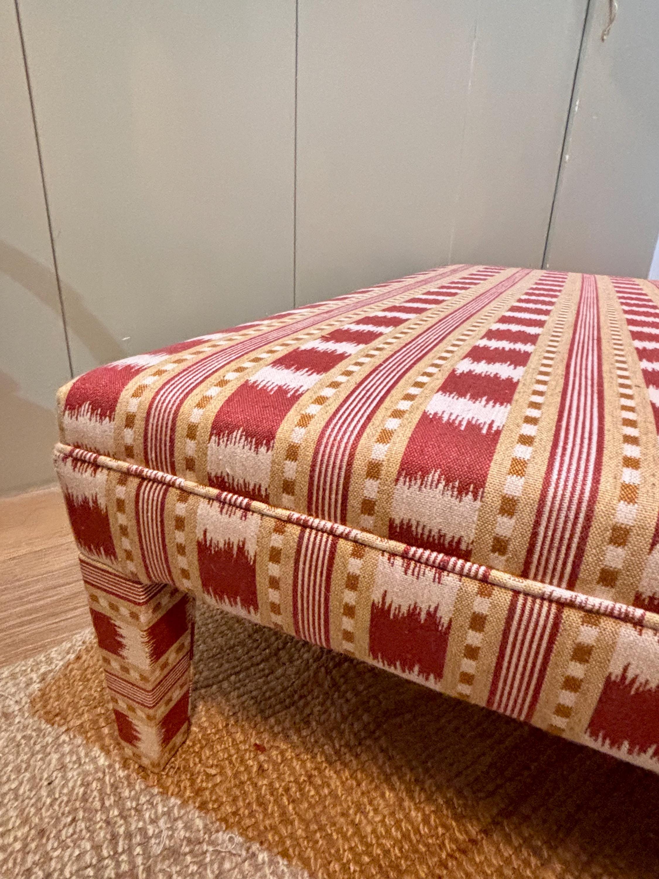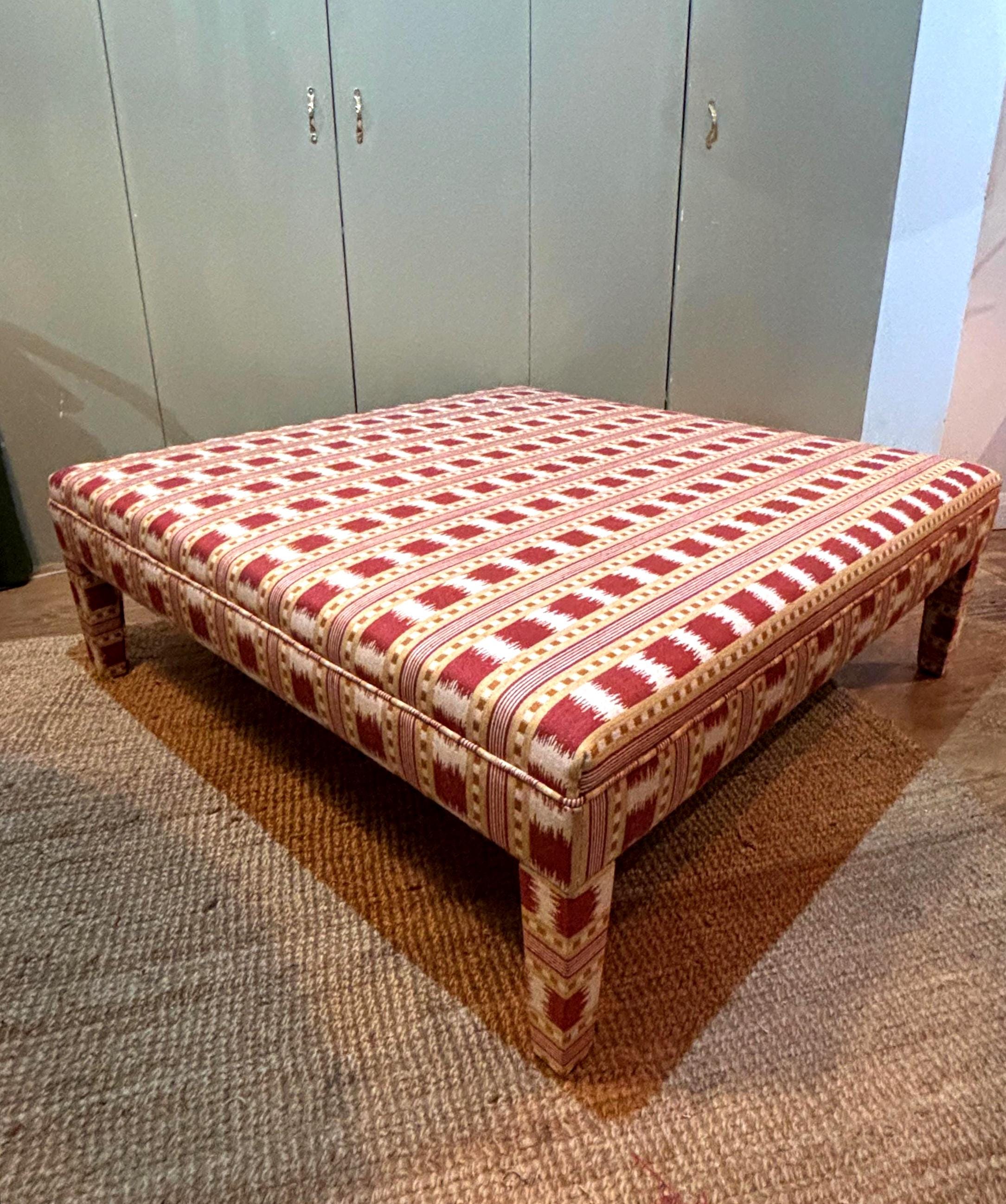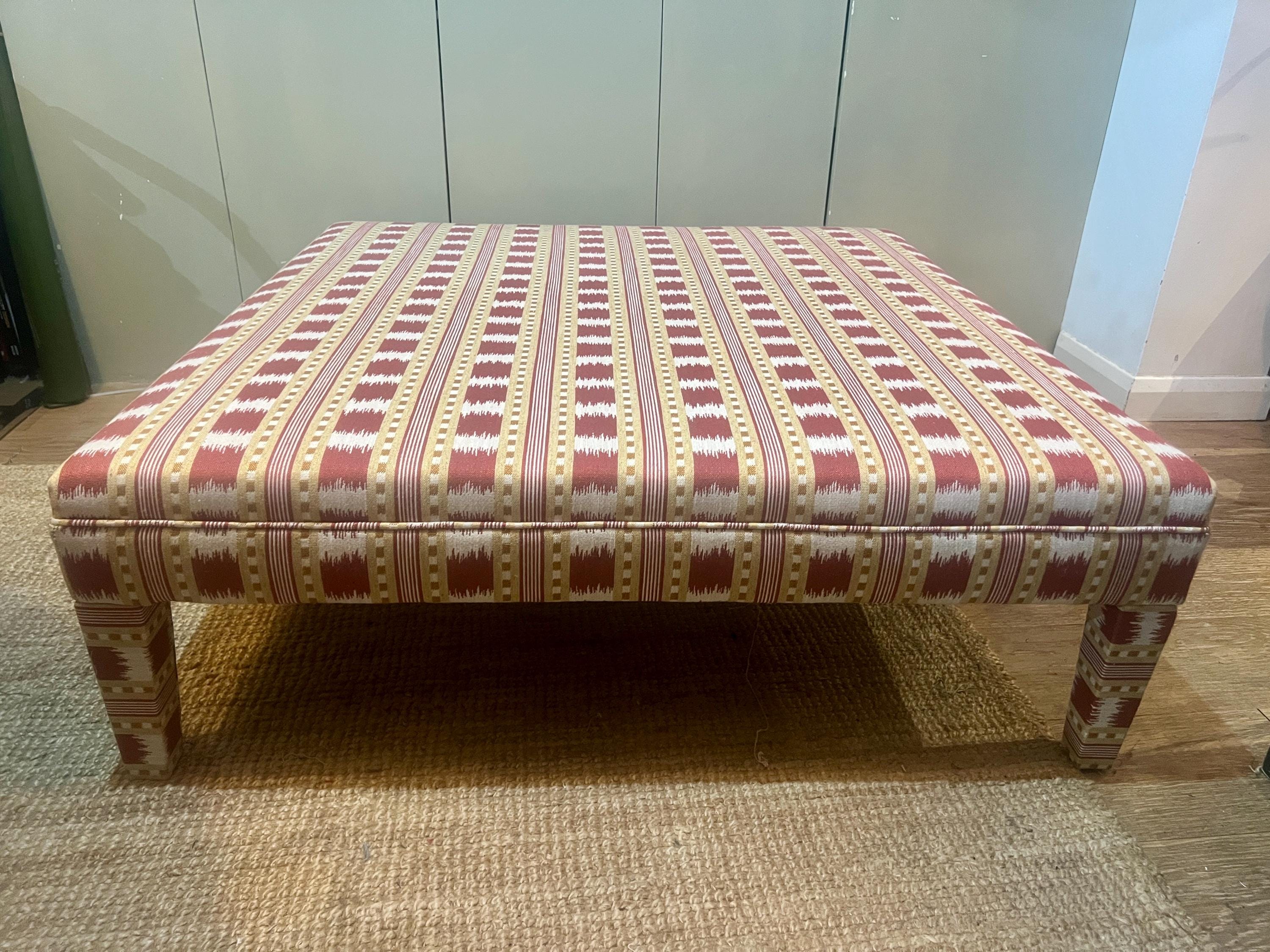 Our fully upholstered “Whitmore Footsool”, seen here in James Hare Red Paxton fabric, is sold excluding fabric. You can either send us your own fabric or we can assist you in choosing a fabric and order it for you via the various accounts we hold with fabric designers (see below list below)