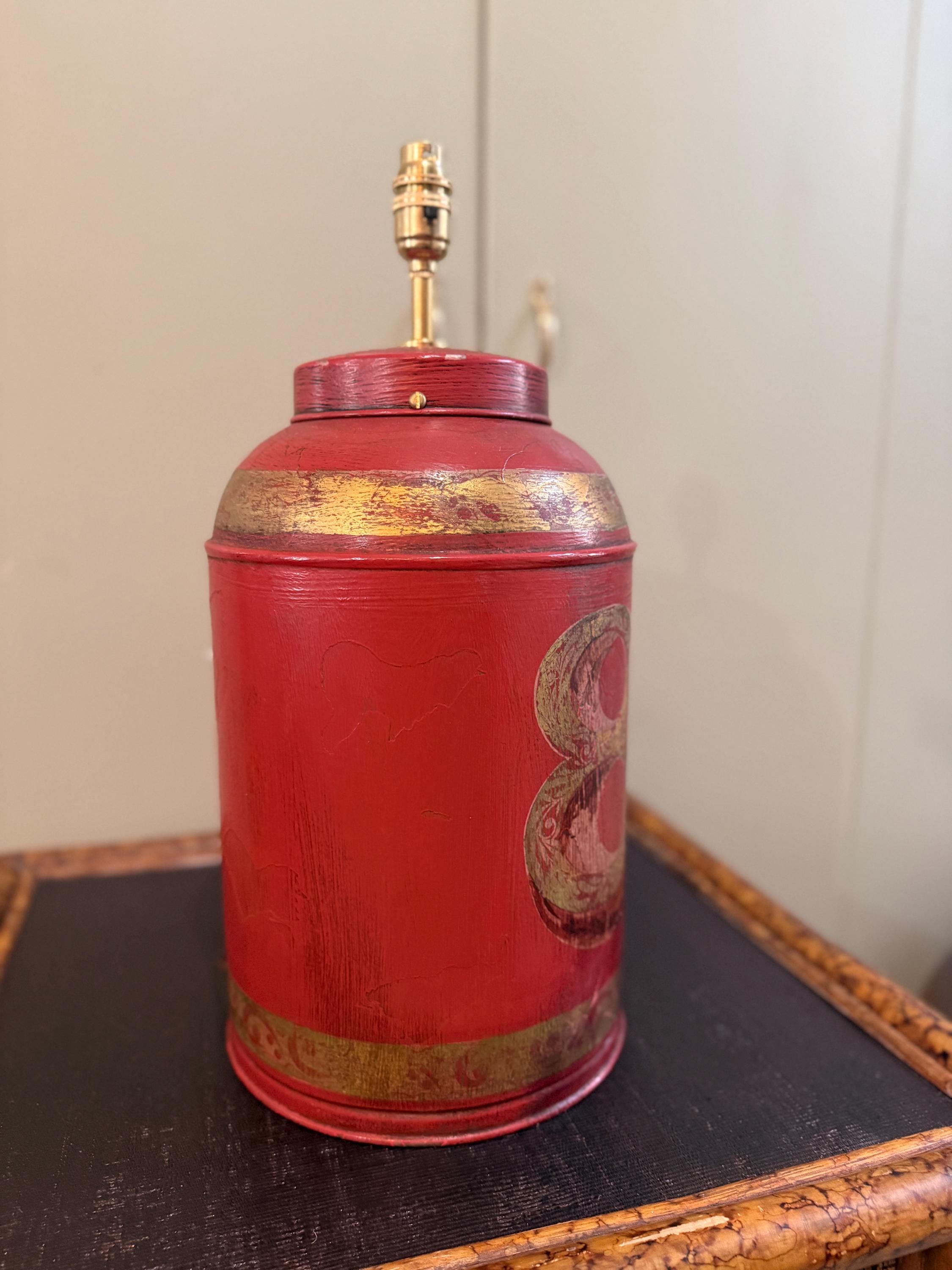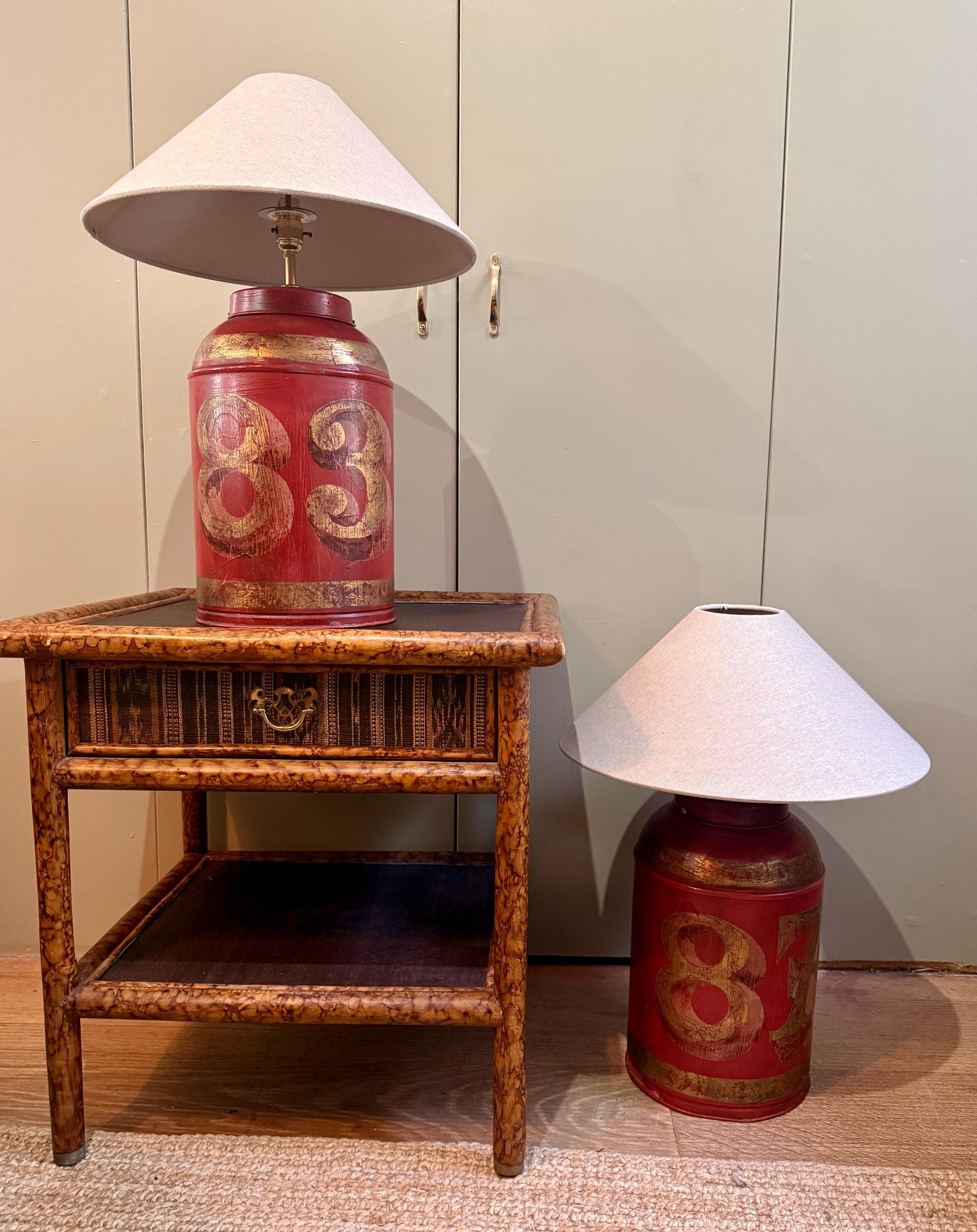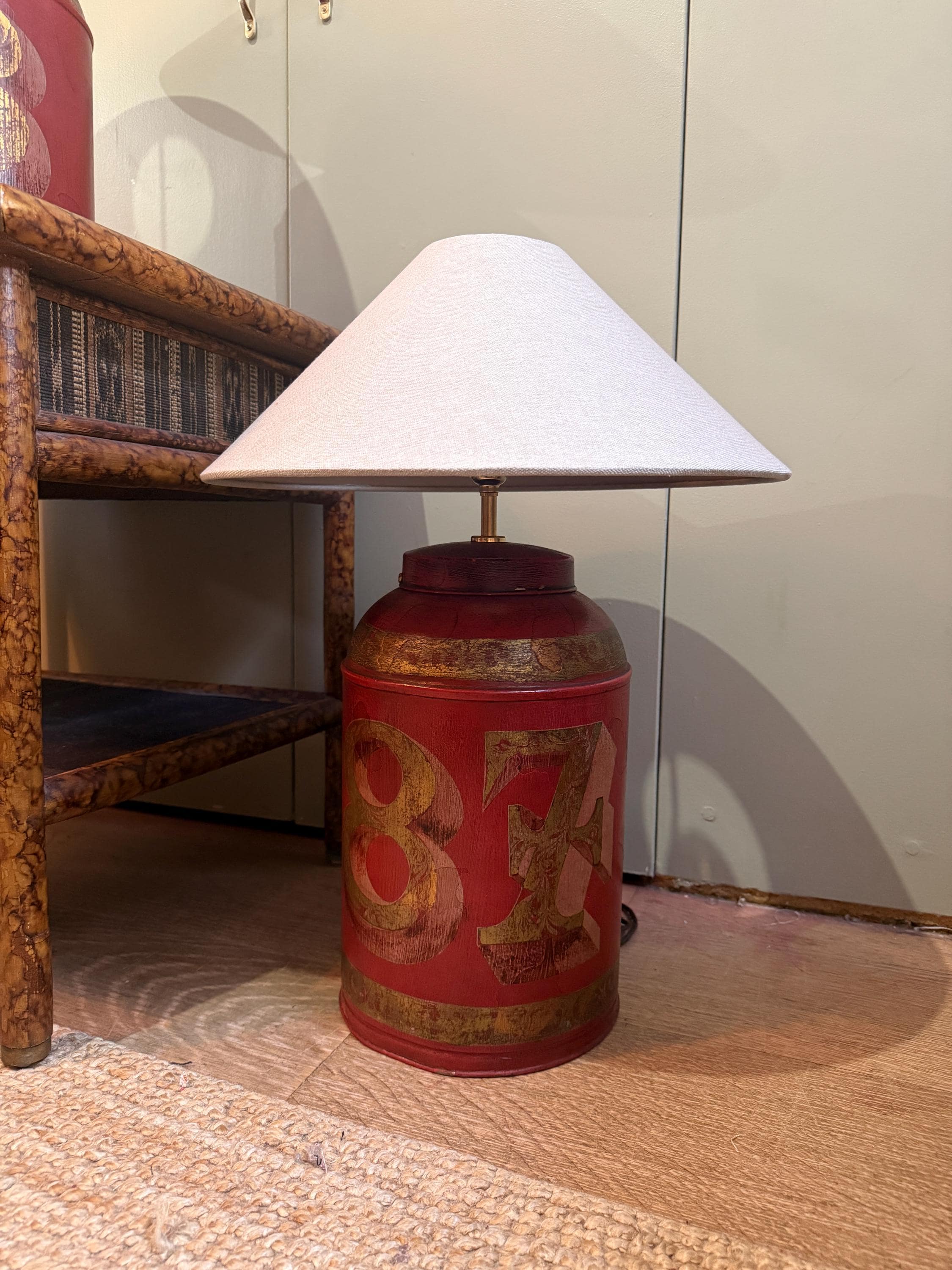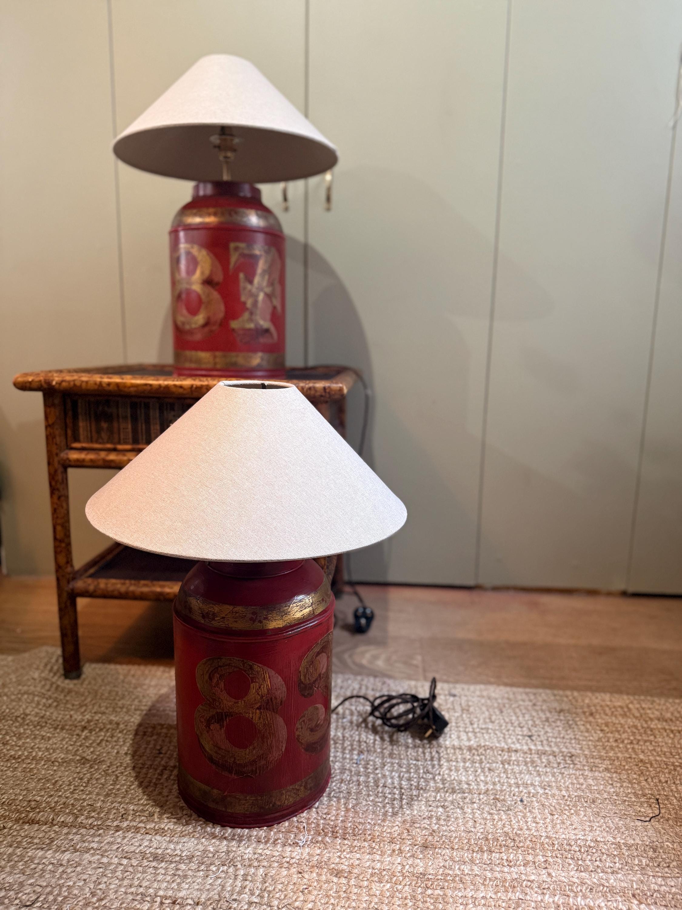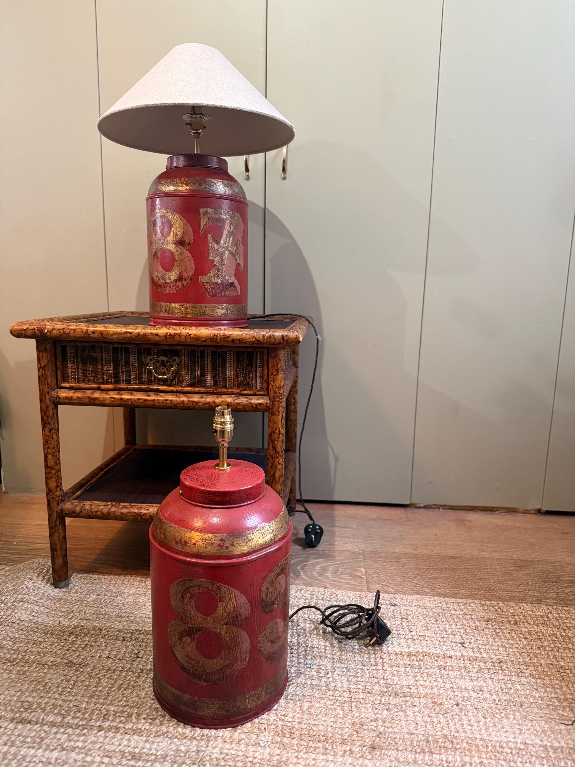 This rare pair of large, hand painted red toleware tea caddies were sourced from America and have been converted into lamps by our antique lighting expert here in London. Hand painted, in red and gold with shiny brass bayonet bulb holders and woven chords. The lamps are wired for UK use but we can re-wire these for the USA or European requirements at an additional cost. Please request. This listing is for the lamps only, however we will include the oatmeal coolie shades at no extra cost.