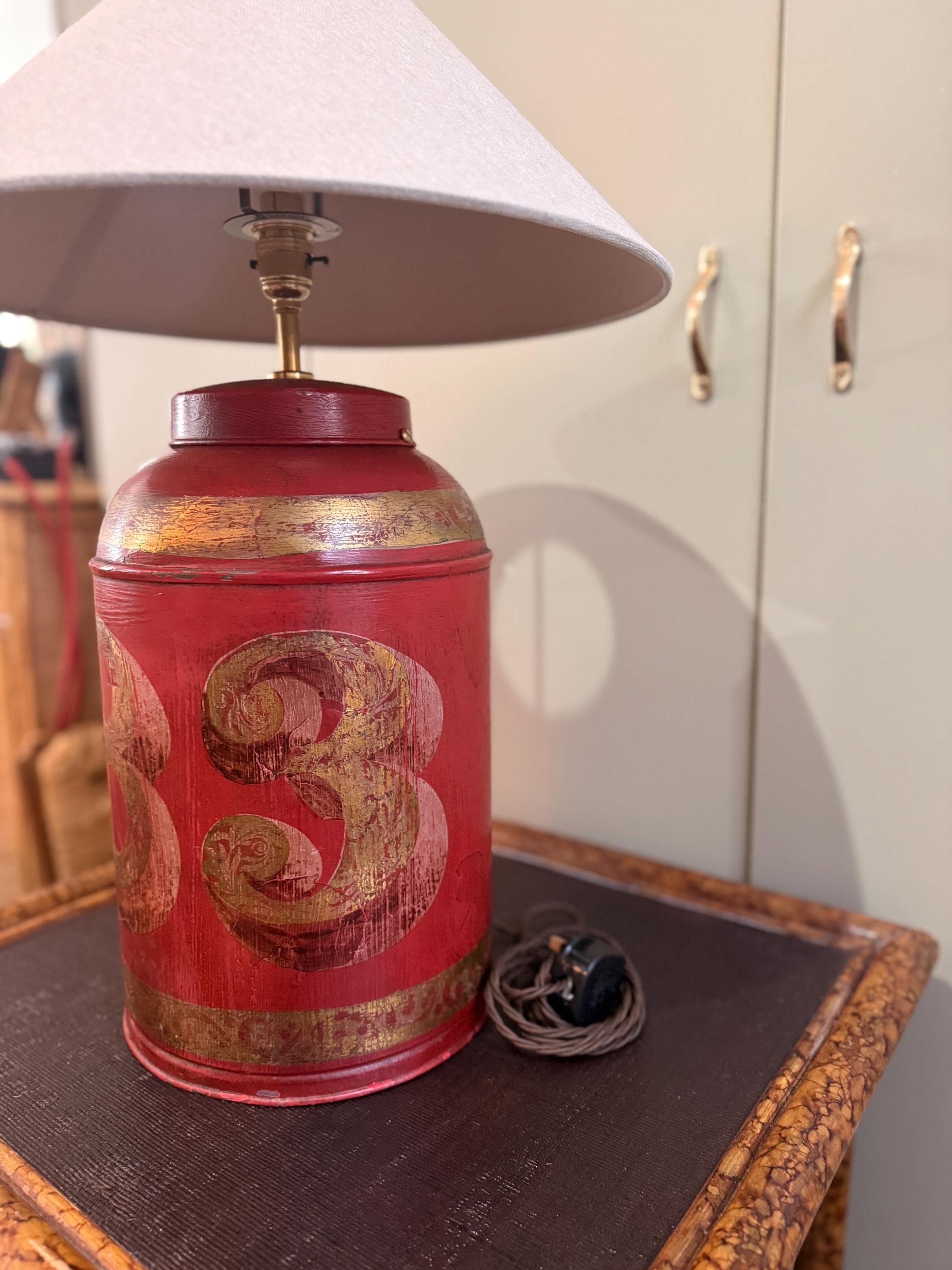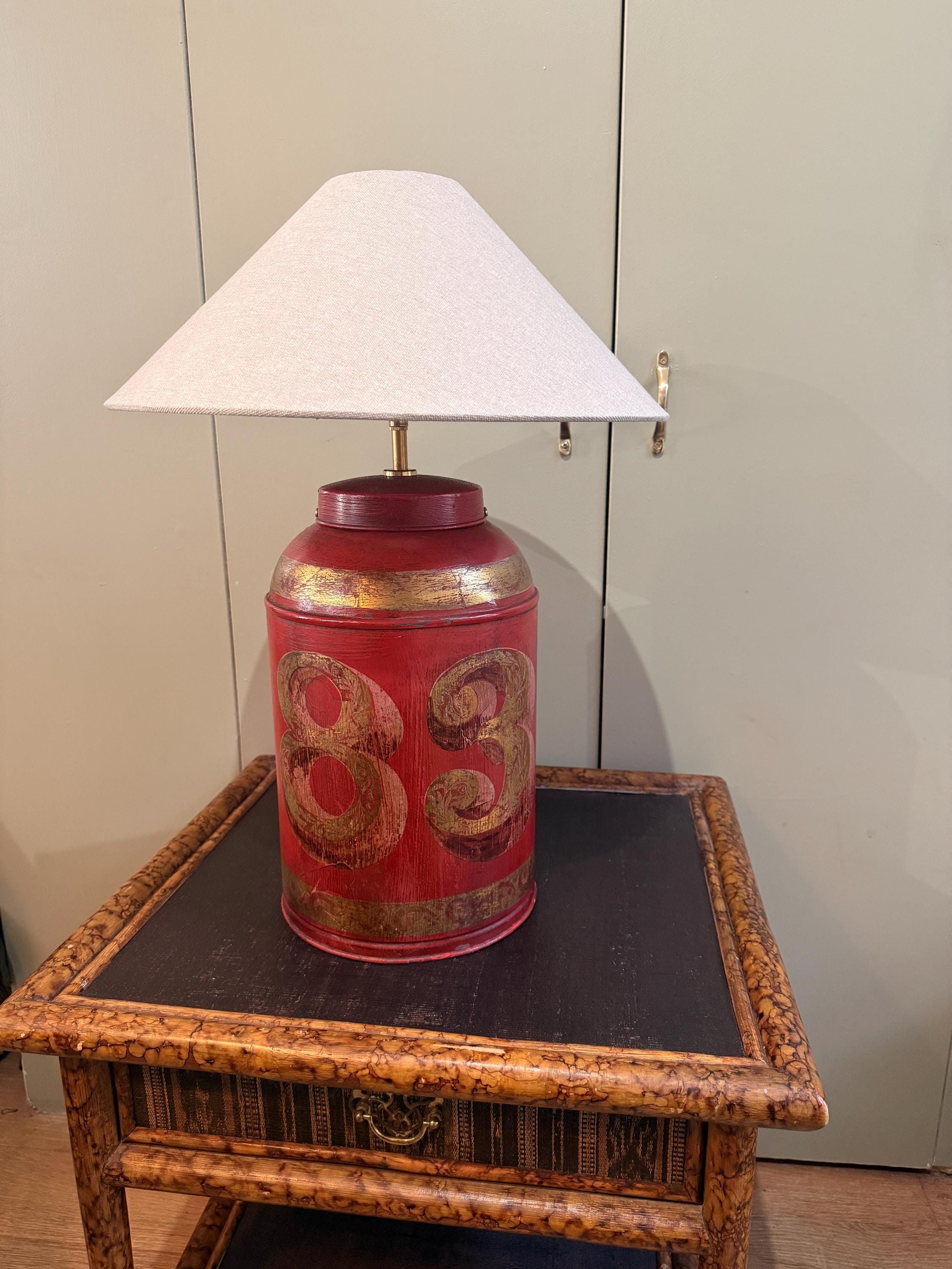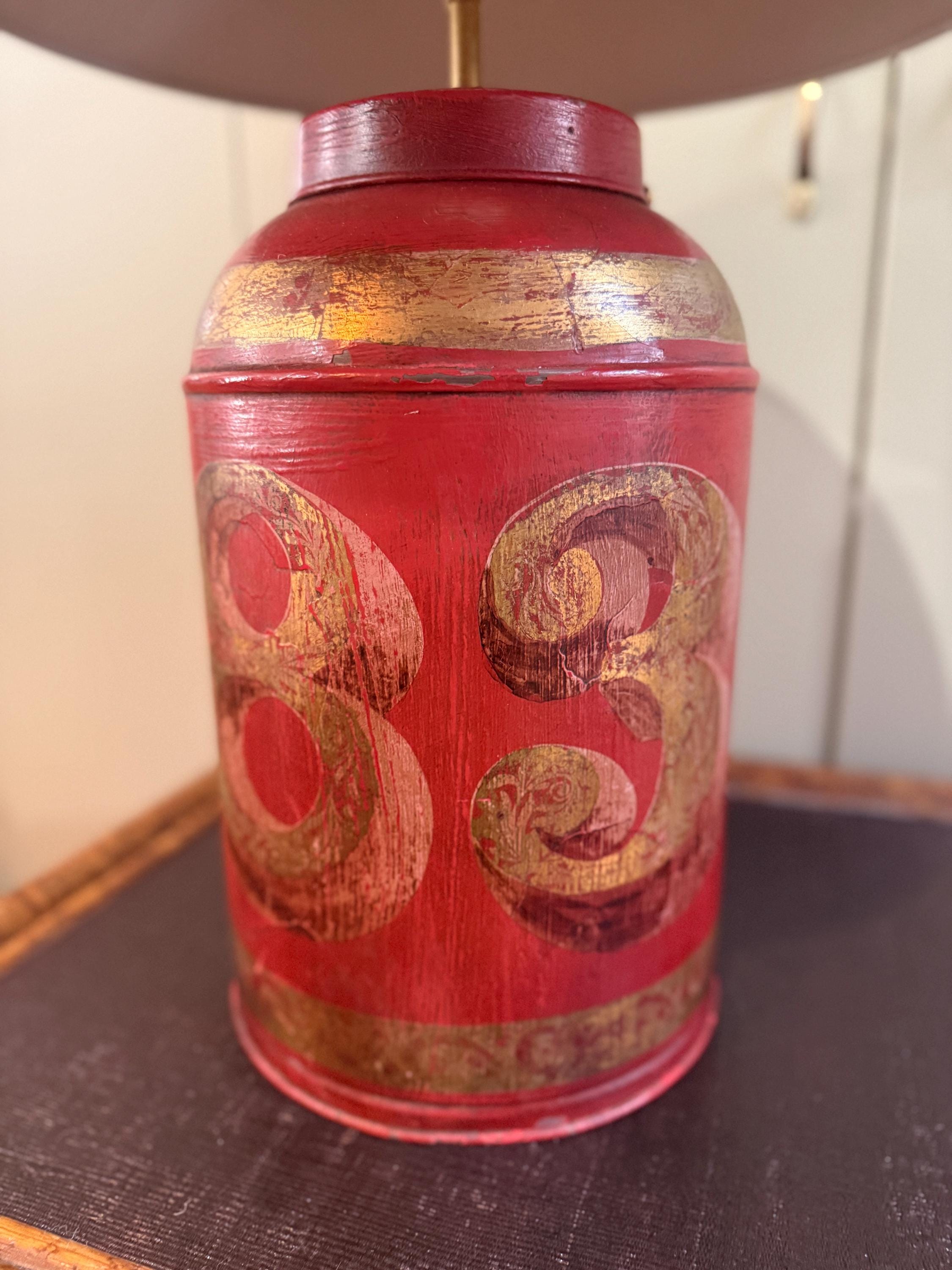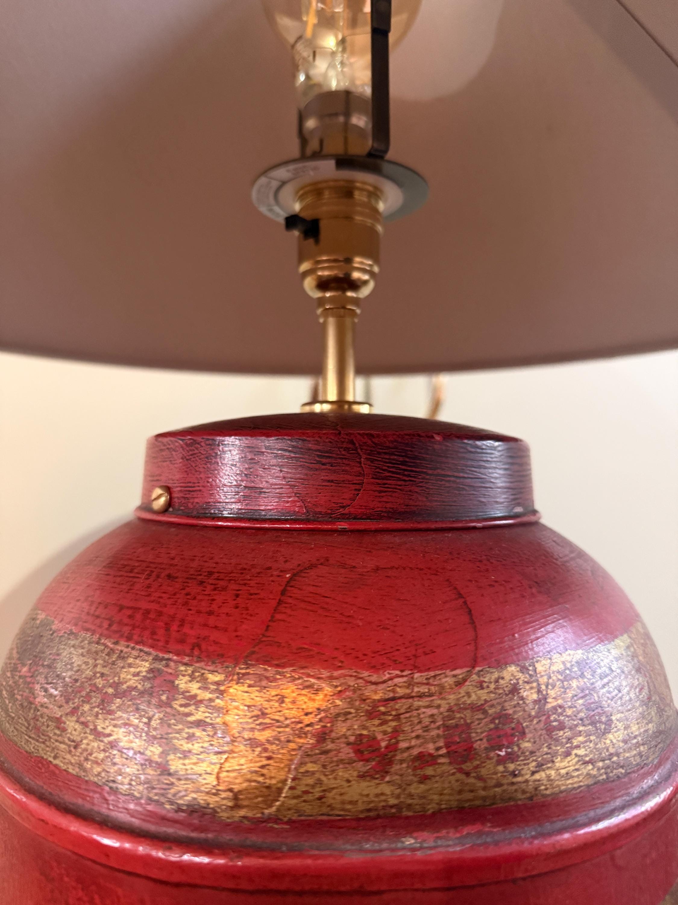 This rare pair of large, hand painted red toleware tea caddies were sourced from America and have been converted into lamps by our antique lighting expert here in London. Hand painted, in red and gold with shiny brass bayonet bulb holders and woven chords. The lamps are wired for UK use but we can re-wire these for the USA or European requirements at an additional cost. Please request. This listing is for the lamps only, however we will include the oatmeal coolie shades at no extra cost.