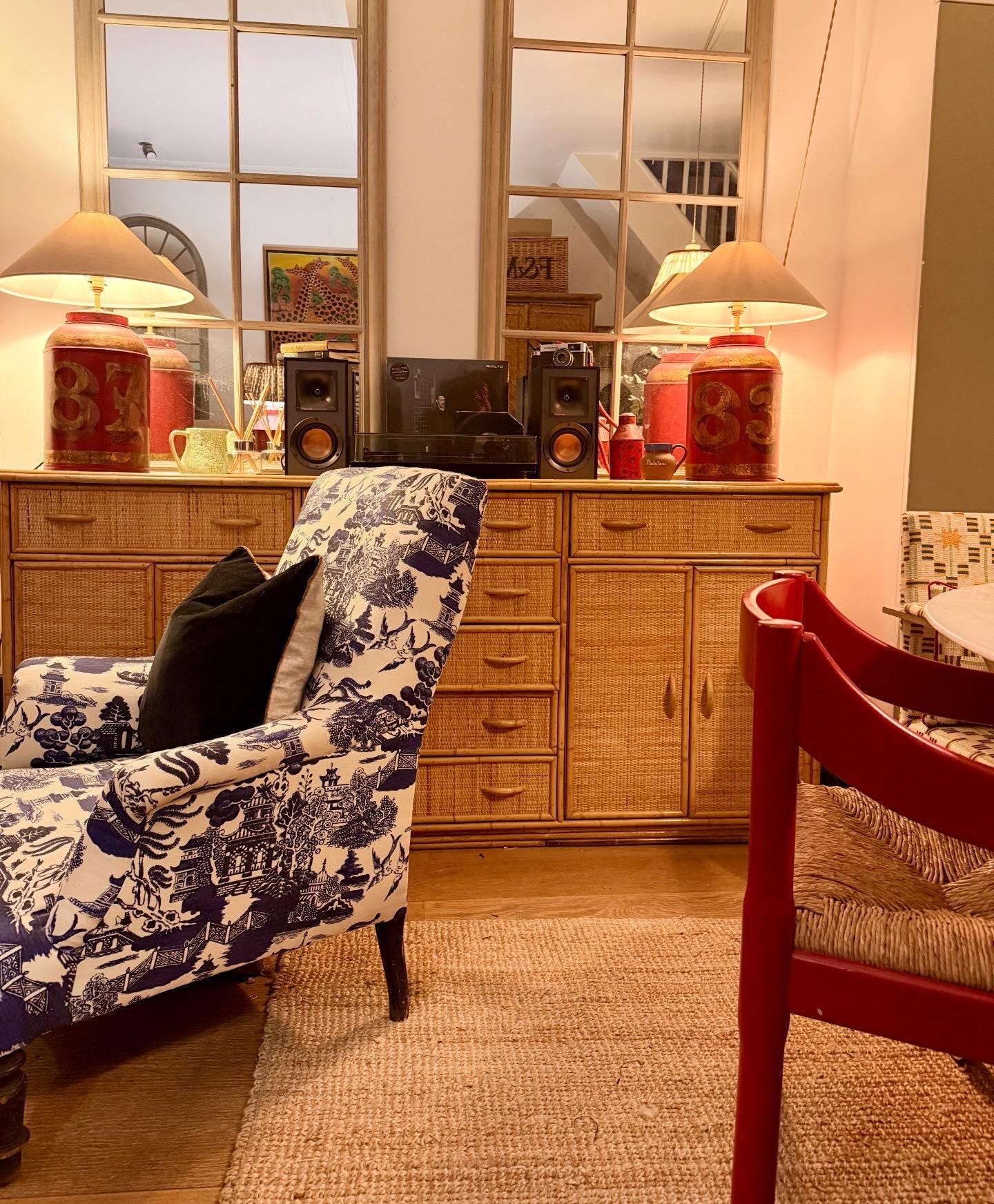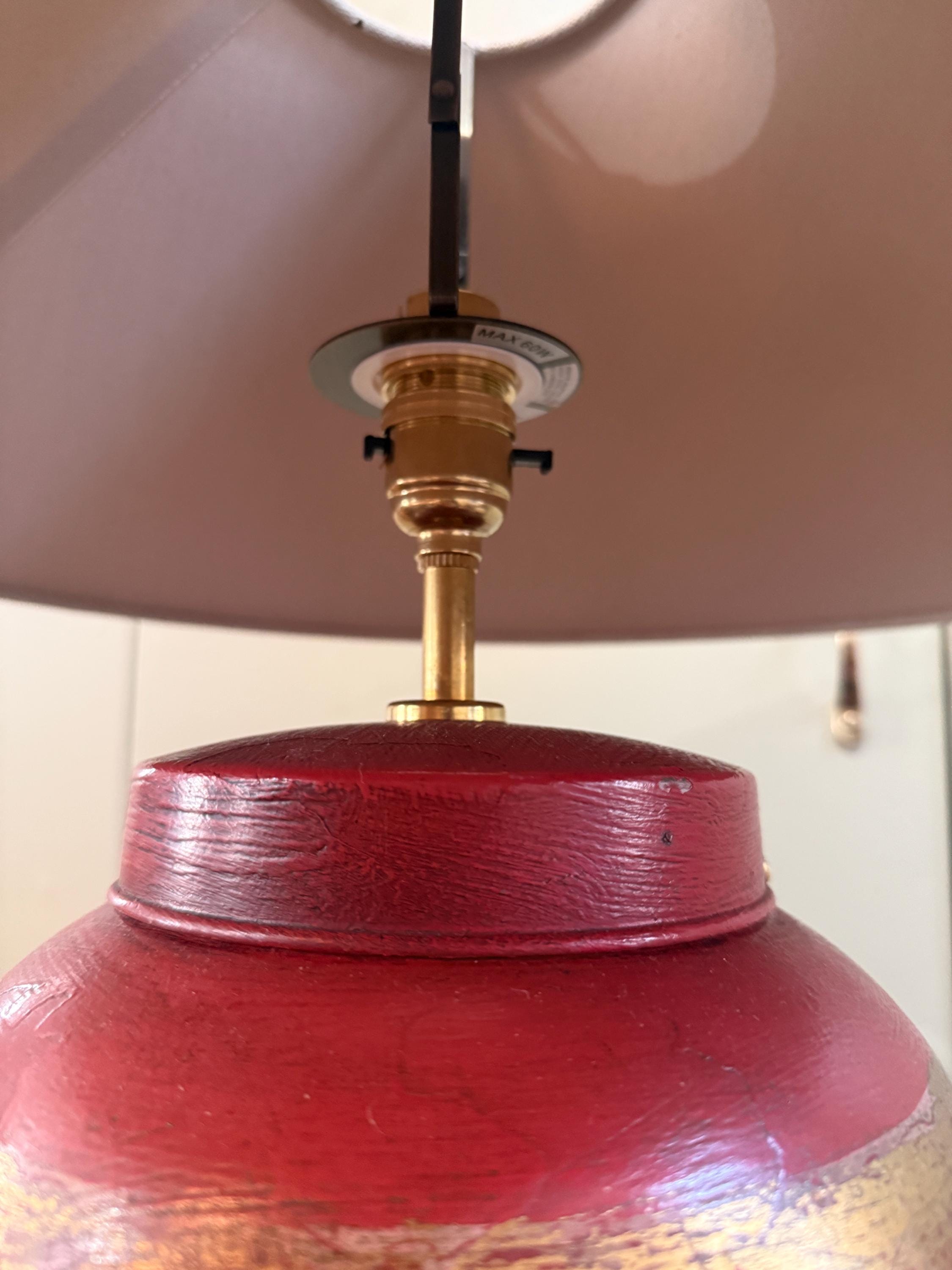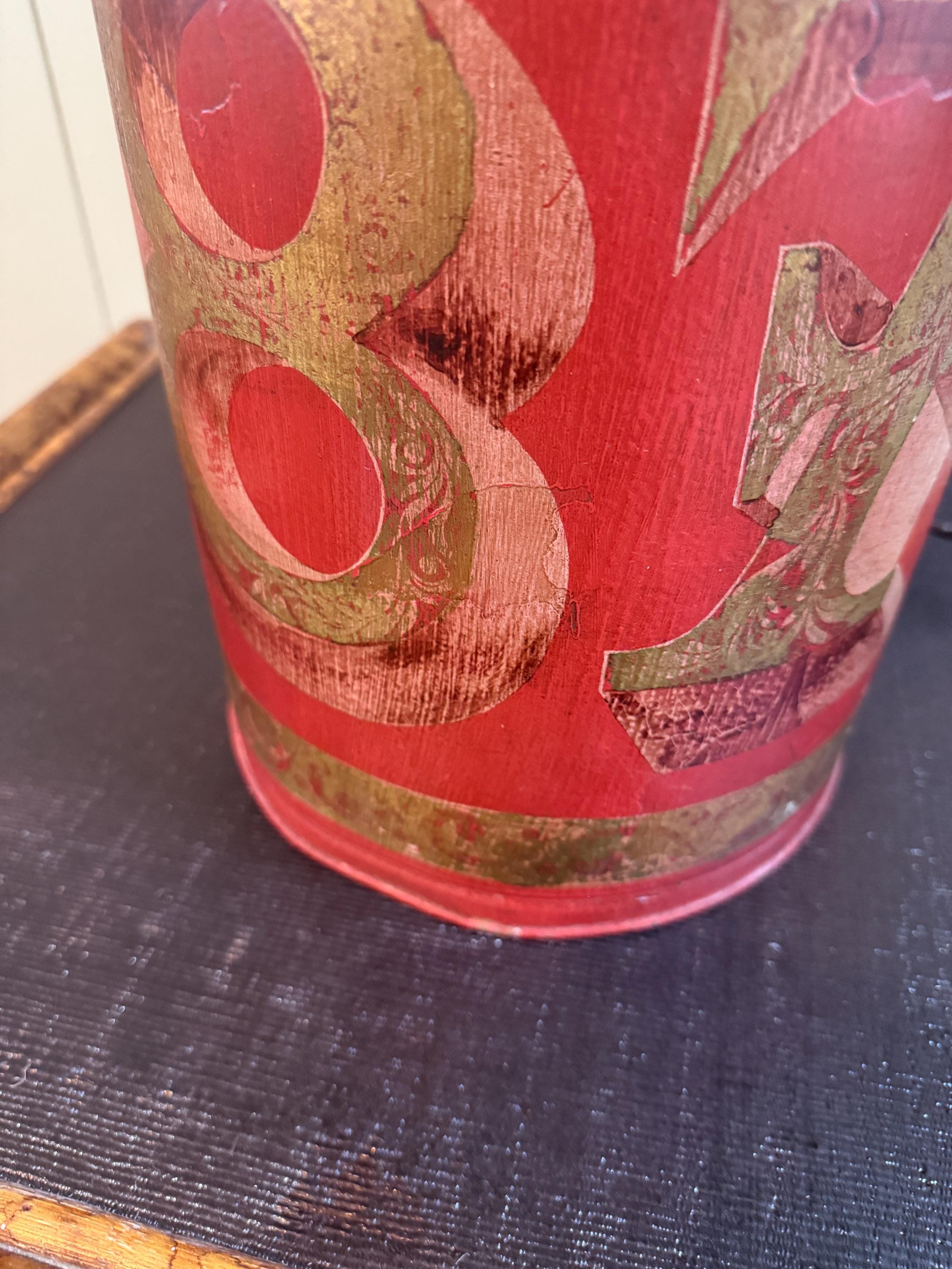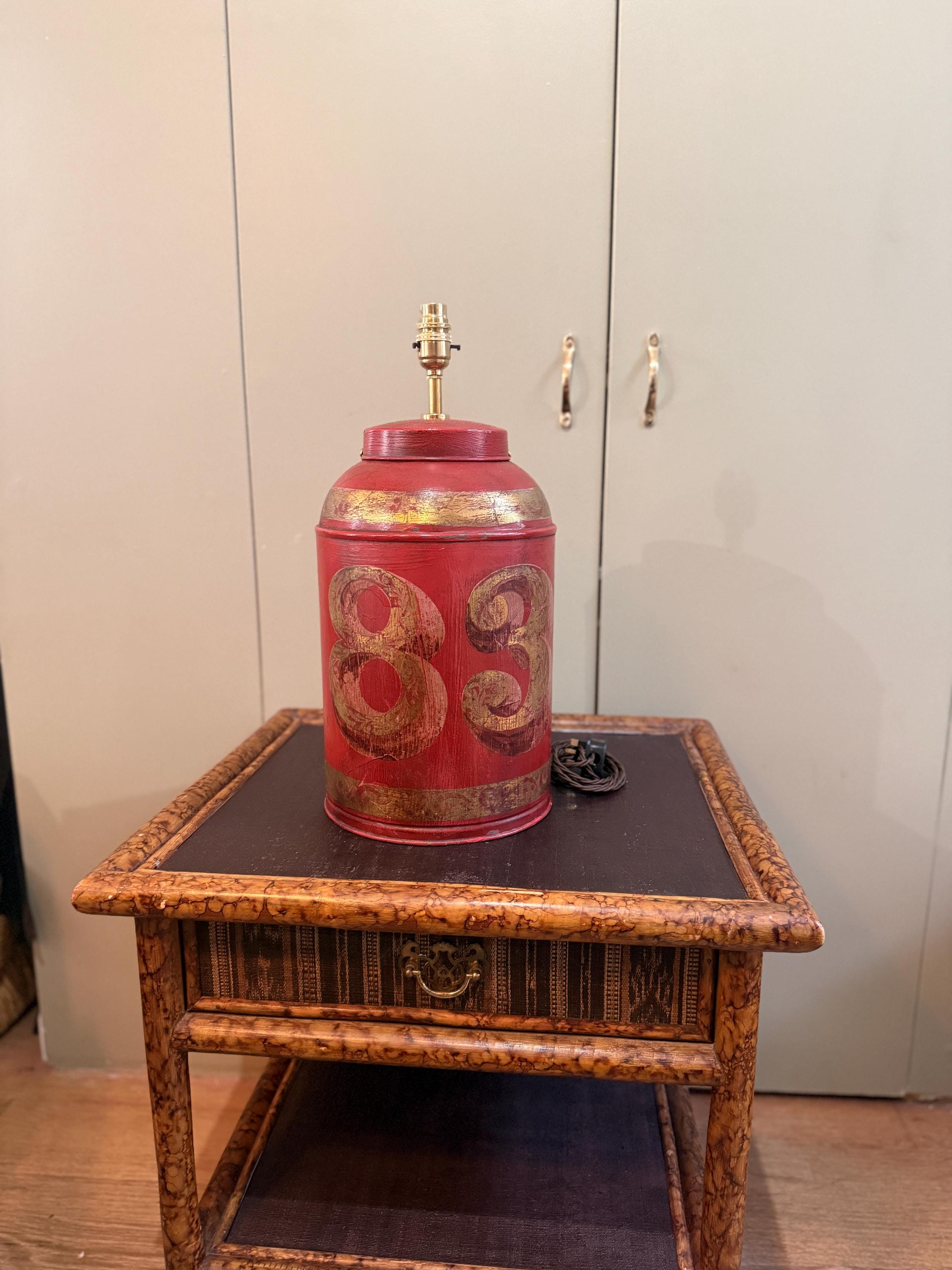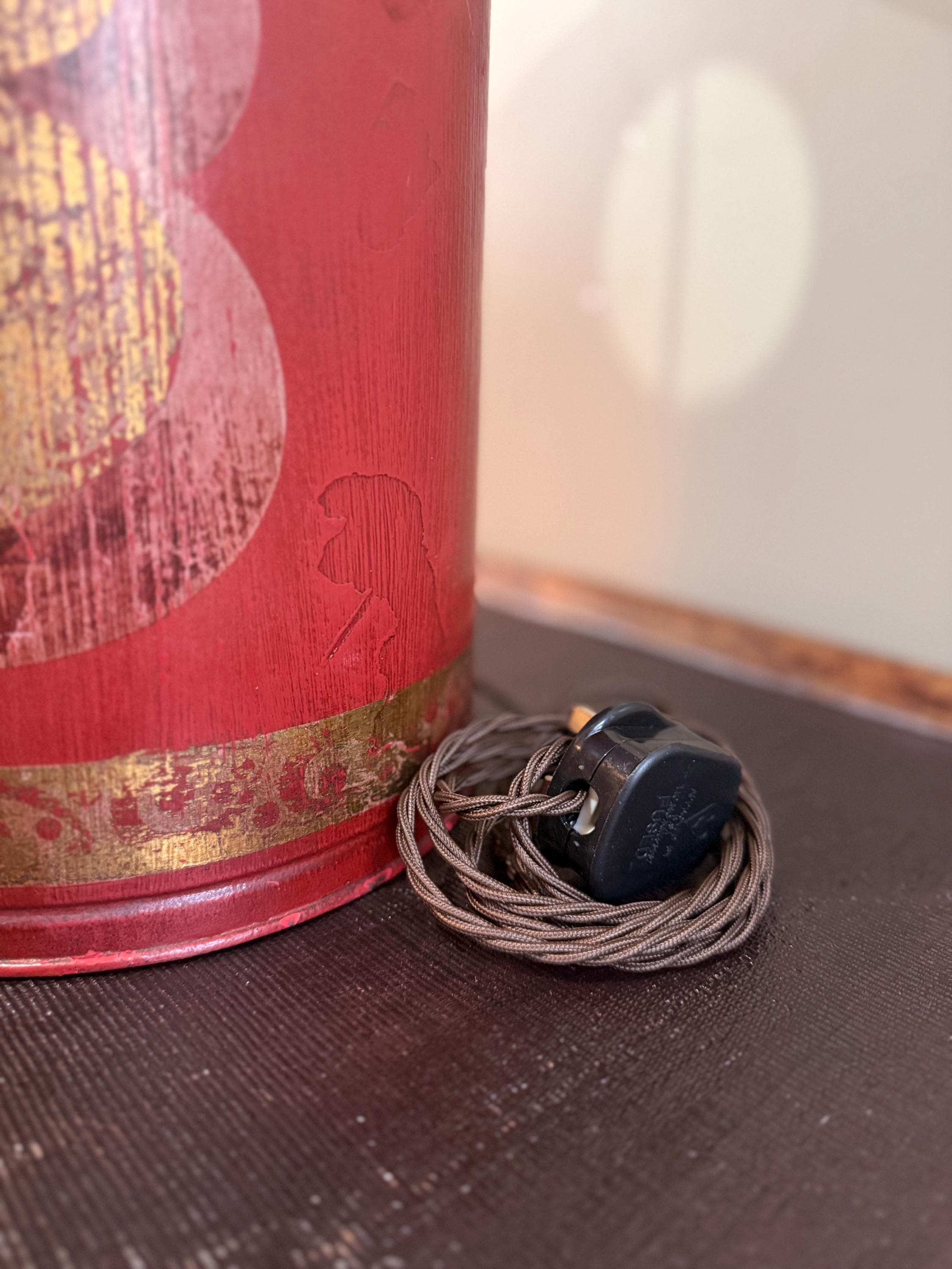 This rare pair of large, hand painted red toleware tea caddies were sourced from America and have been converted into lamps by our antique lighting expert here in London. Hand painted, in red and gold with shiny brass bayonet bulb holders and woven chords. The lamps are wired for UK use but we can re-wire these for the USA or European requirements at an additional cost. Please request. This listing is for the lamps only, however we will include the oatmeal coolie shades at no extra cost.