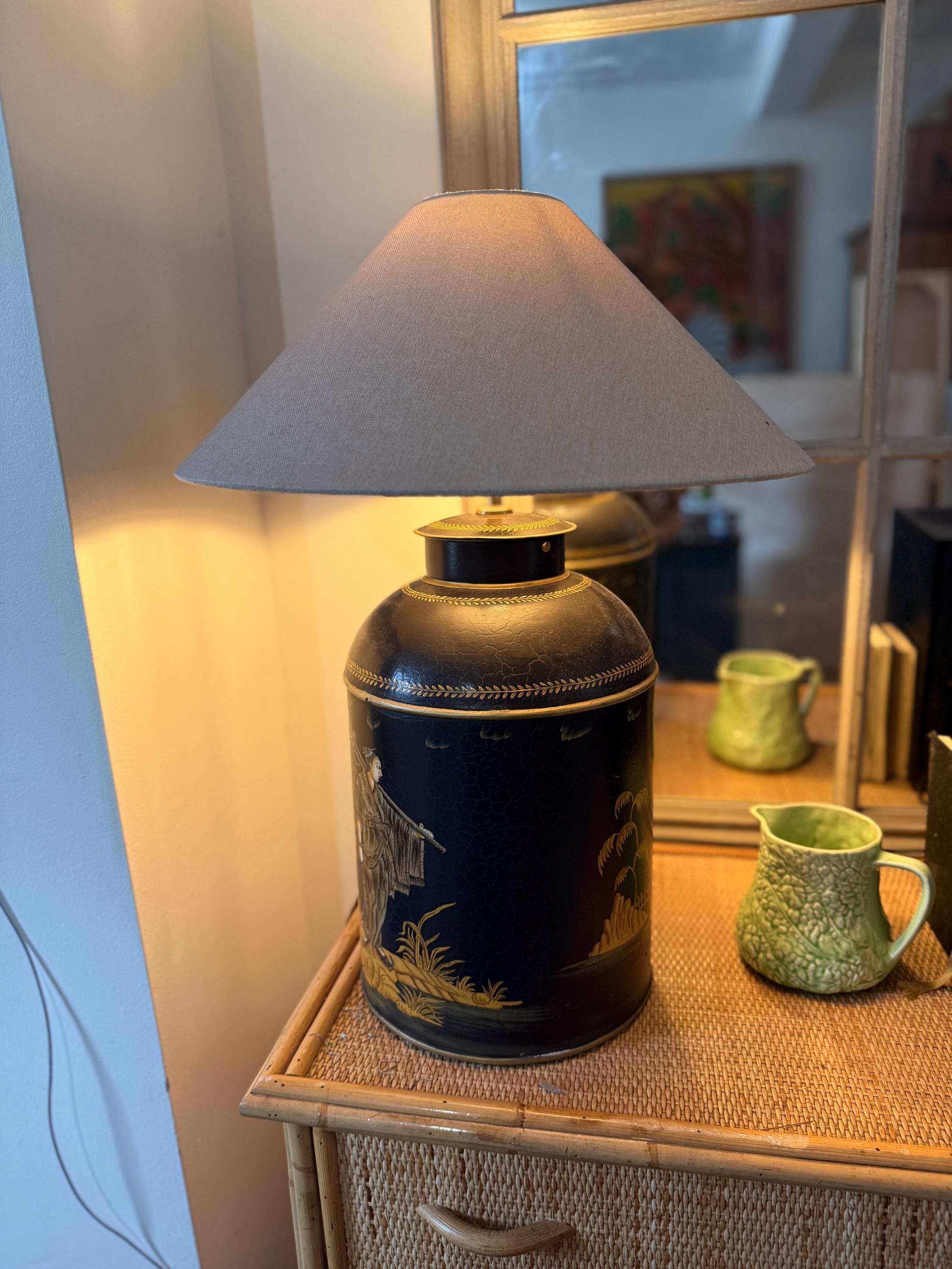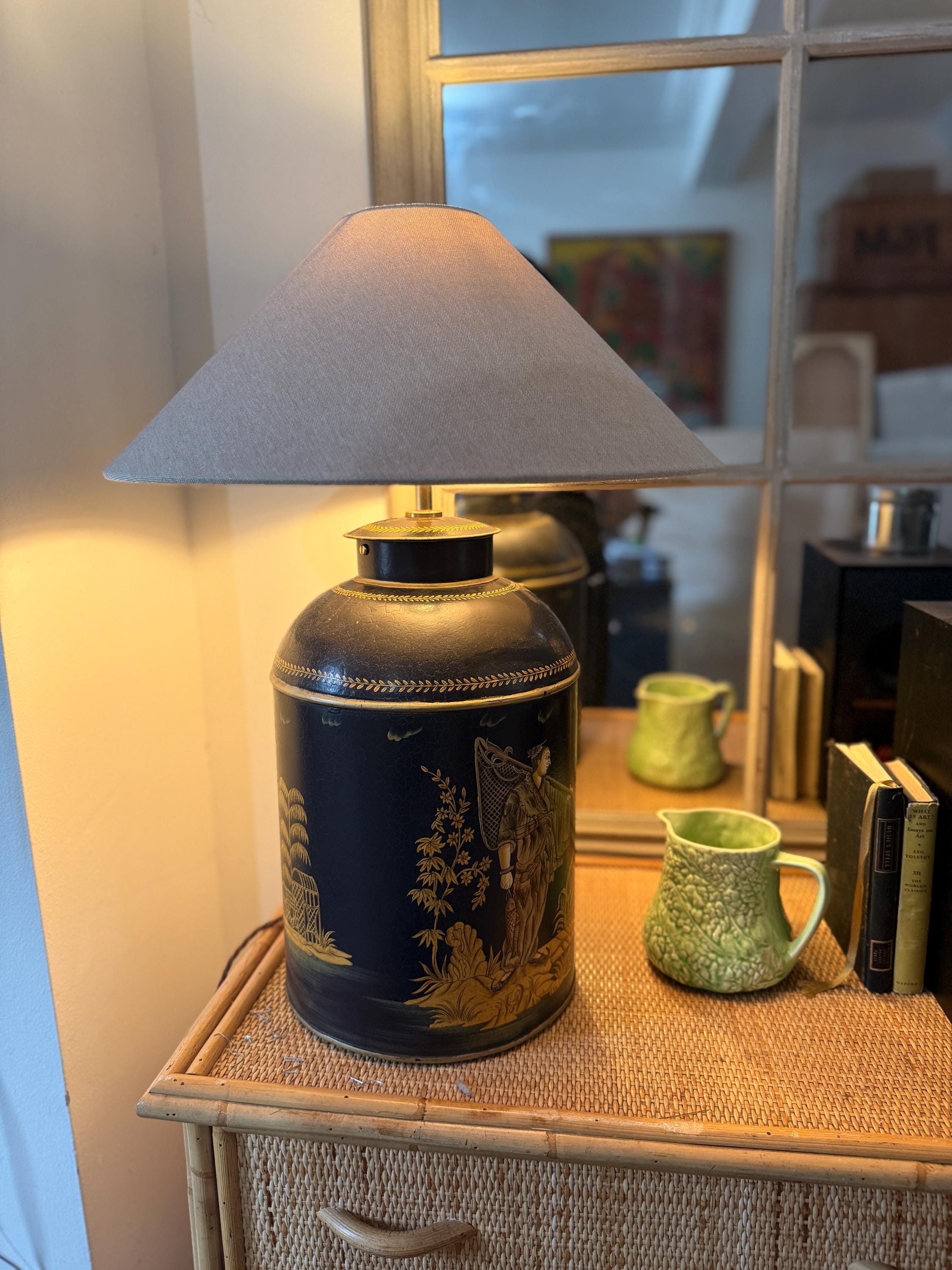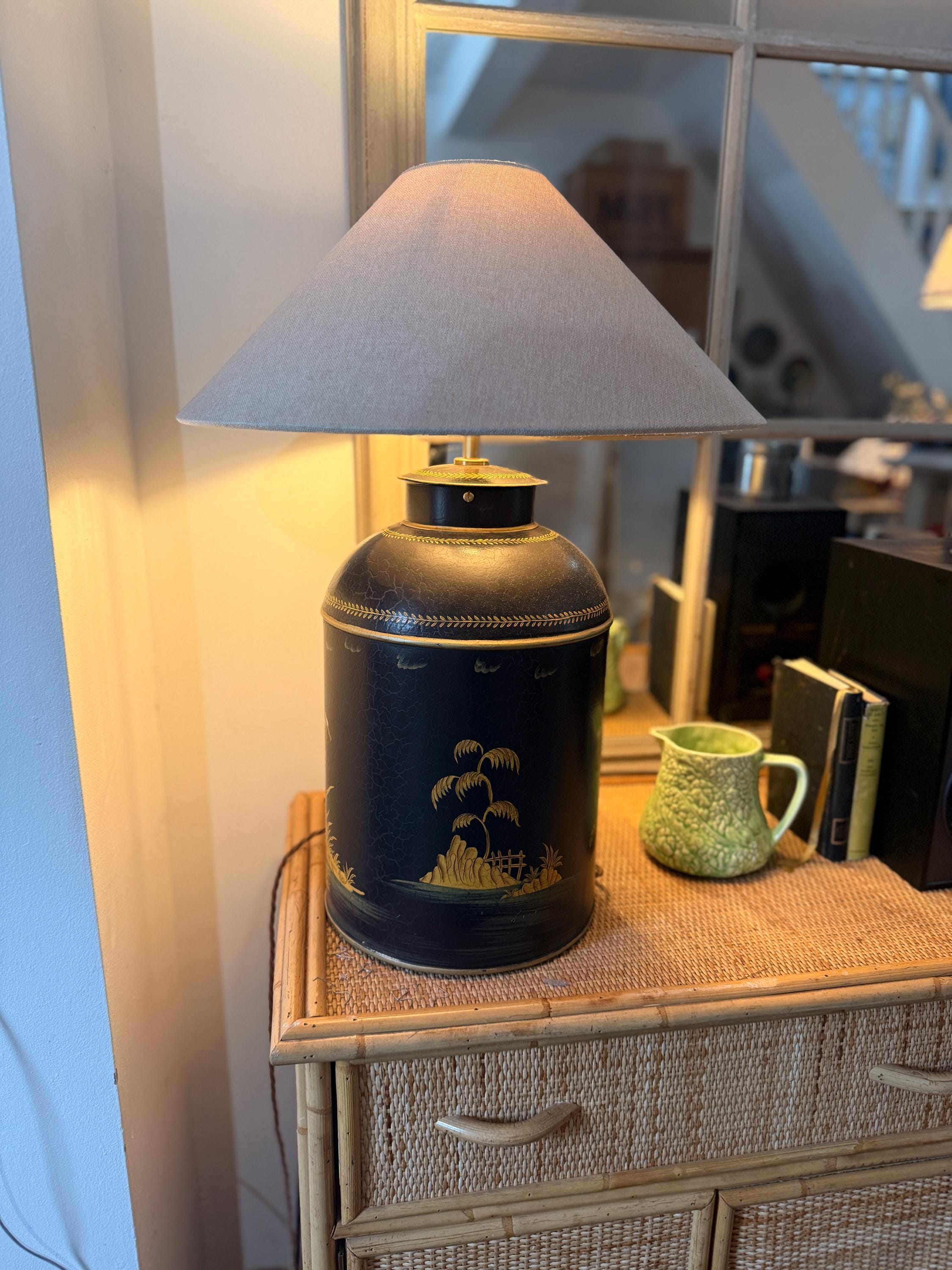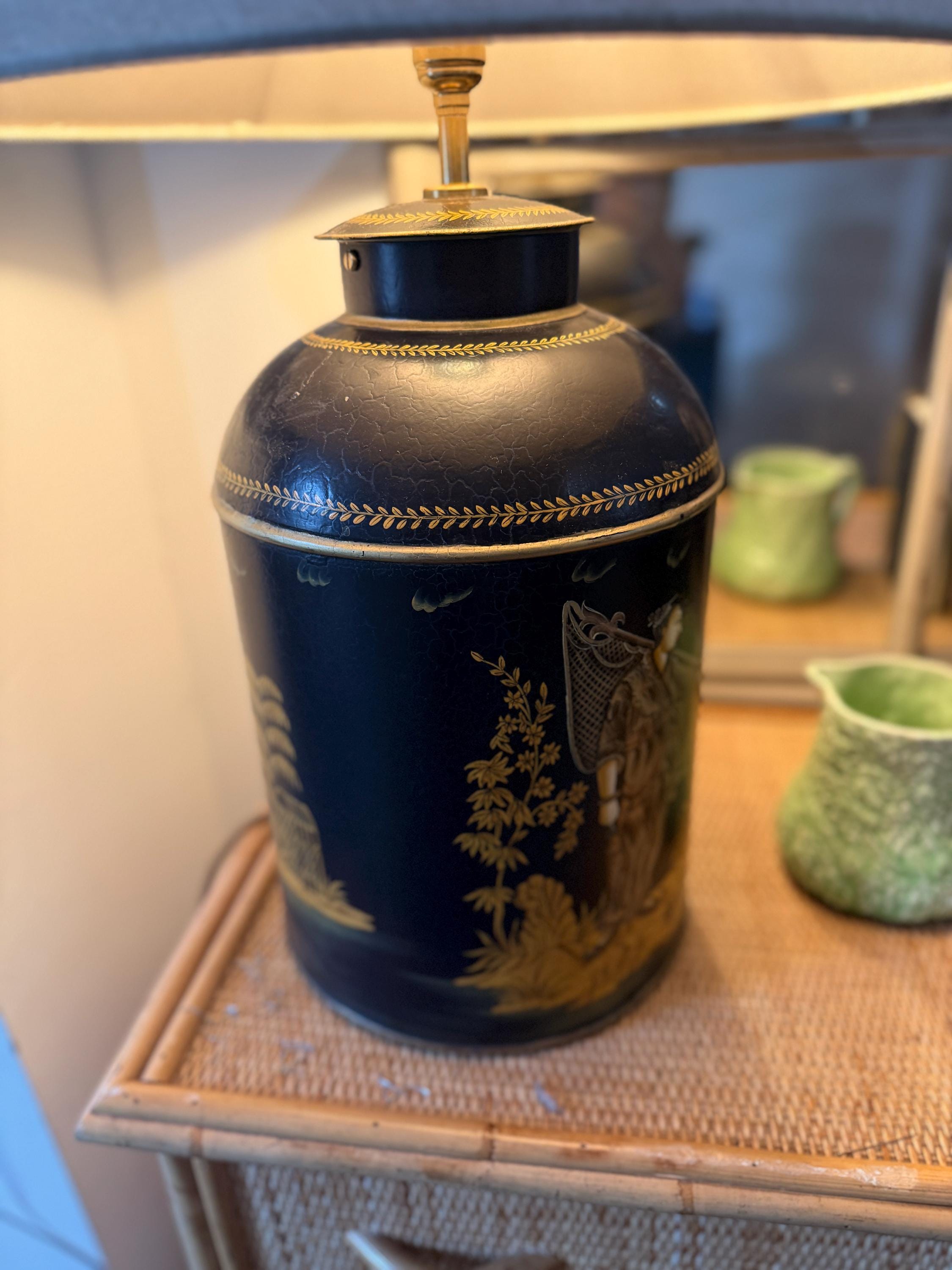 This striking pair of large reproduction chinoiserie black and gold toleware tea caddies have been converted into lamps by our lighting expert with shiny brass bayonet bulb holders and woven chords. The lamps are wired for UK use but we can re-wire these for the USA or European requirements at an additional cost. Please request. This listing is for the lamps only.