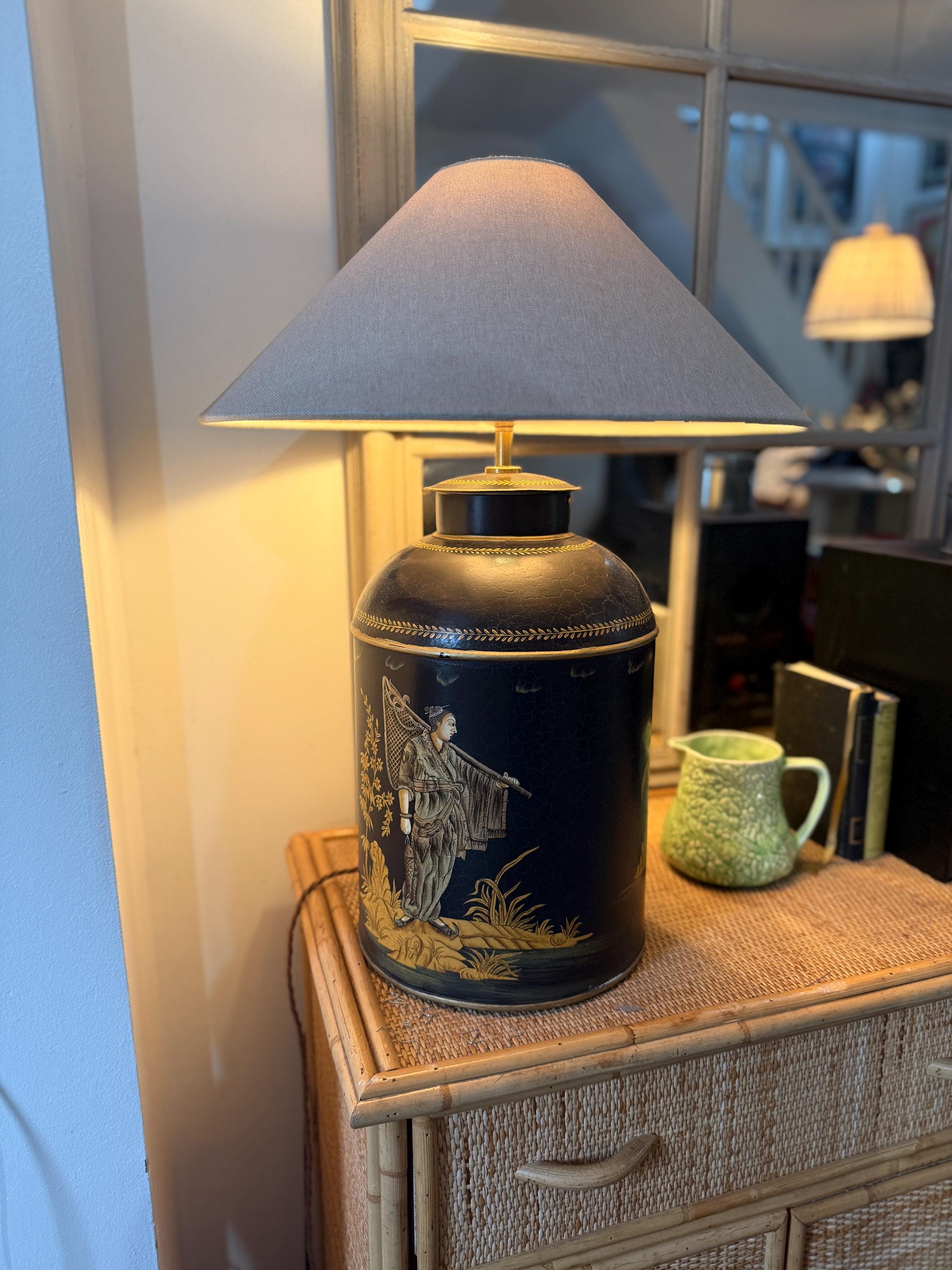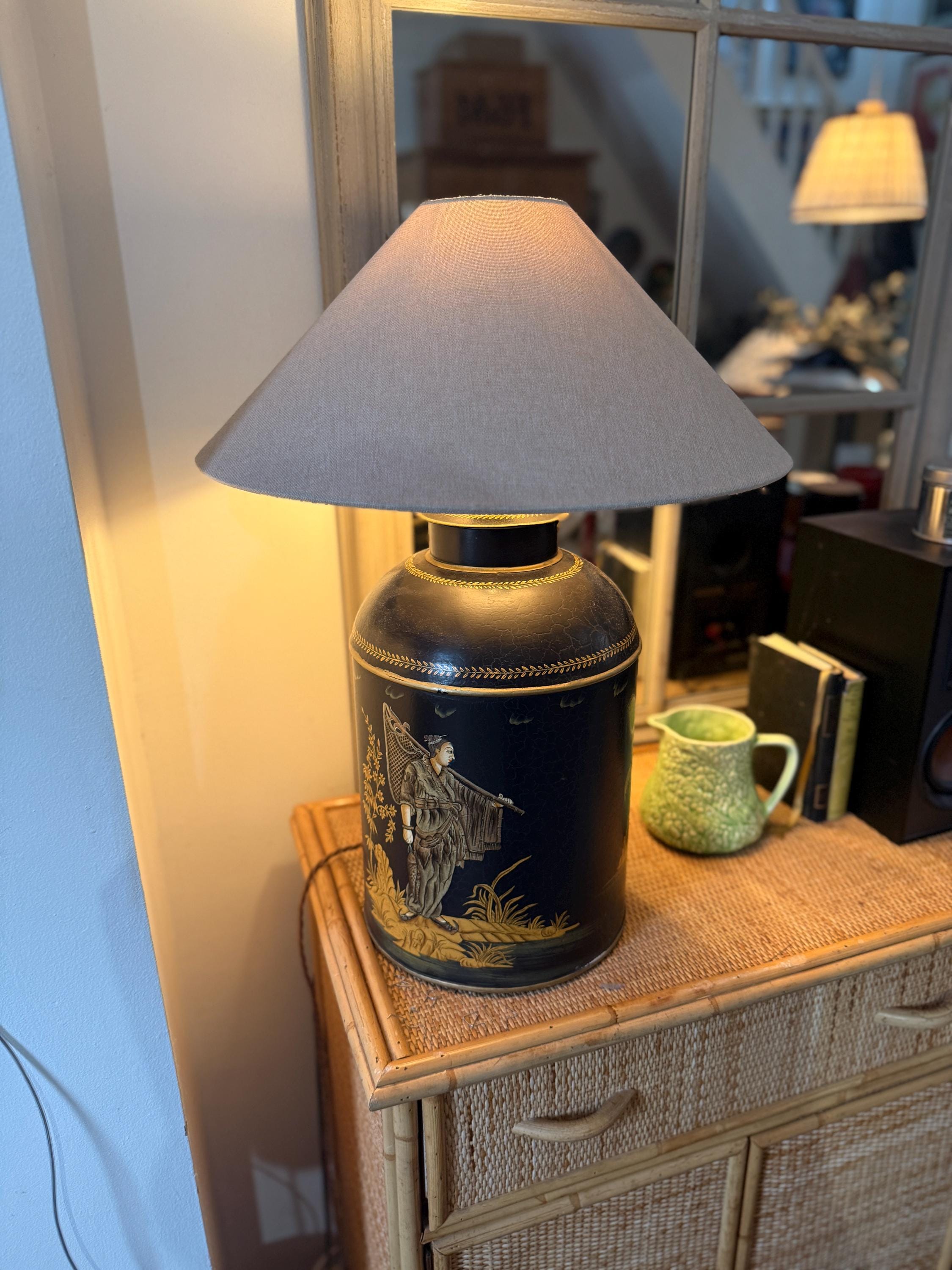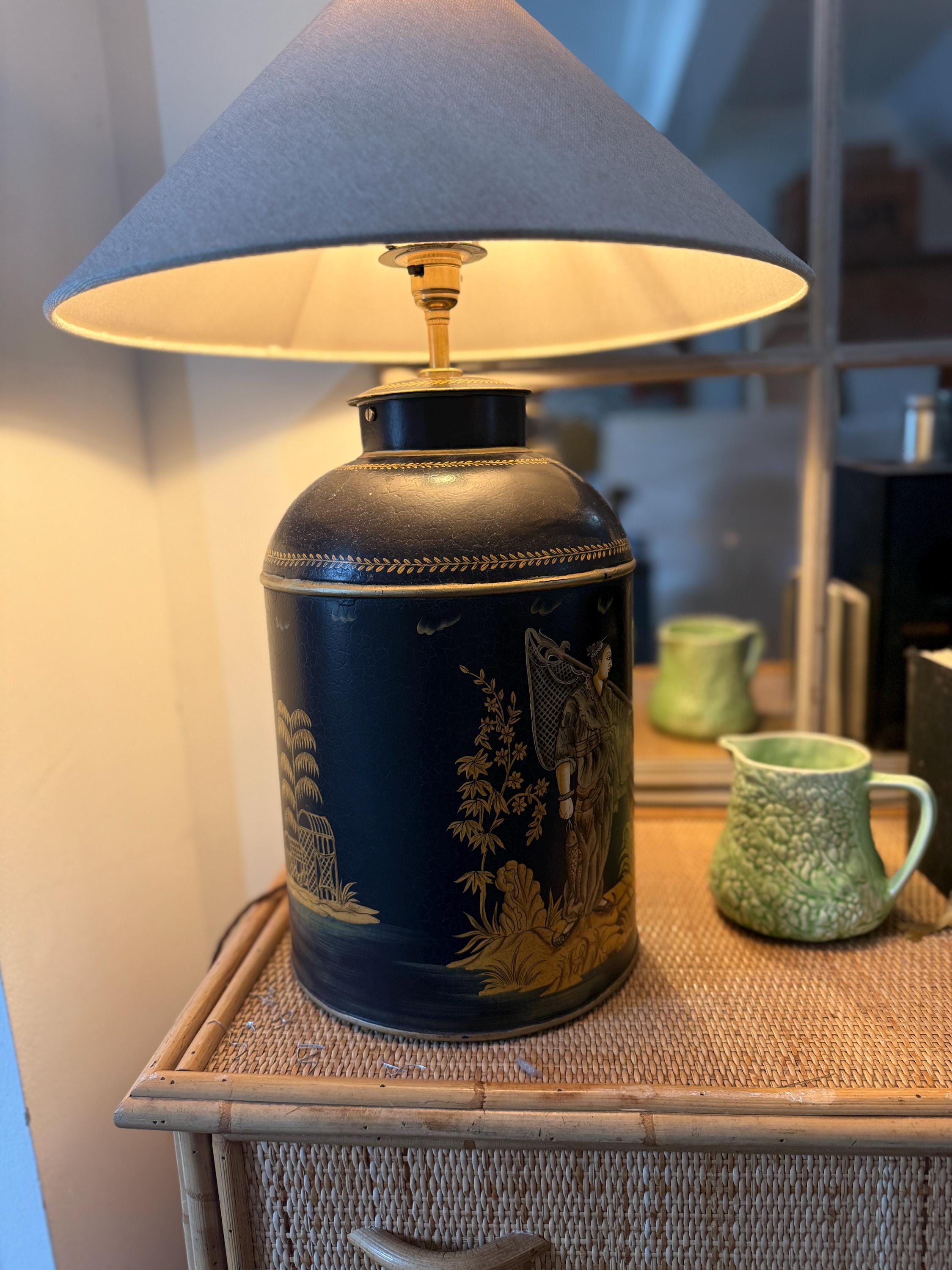 This striking pair of large reproduction chinoiserie black and gold toleware tea caddies have been converted into lamps by our lighting expert with shiny brass bayonet bulb holders and woven chords. The lamps are wired for UK use but we can re-wire these for the USA or European requirements at an additional cost. Please request. This listing is for the lamps only.