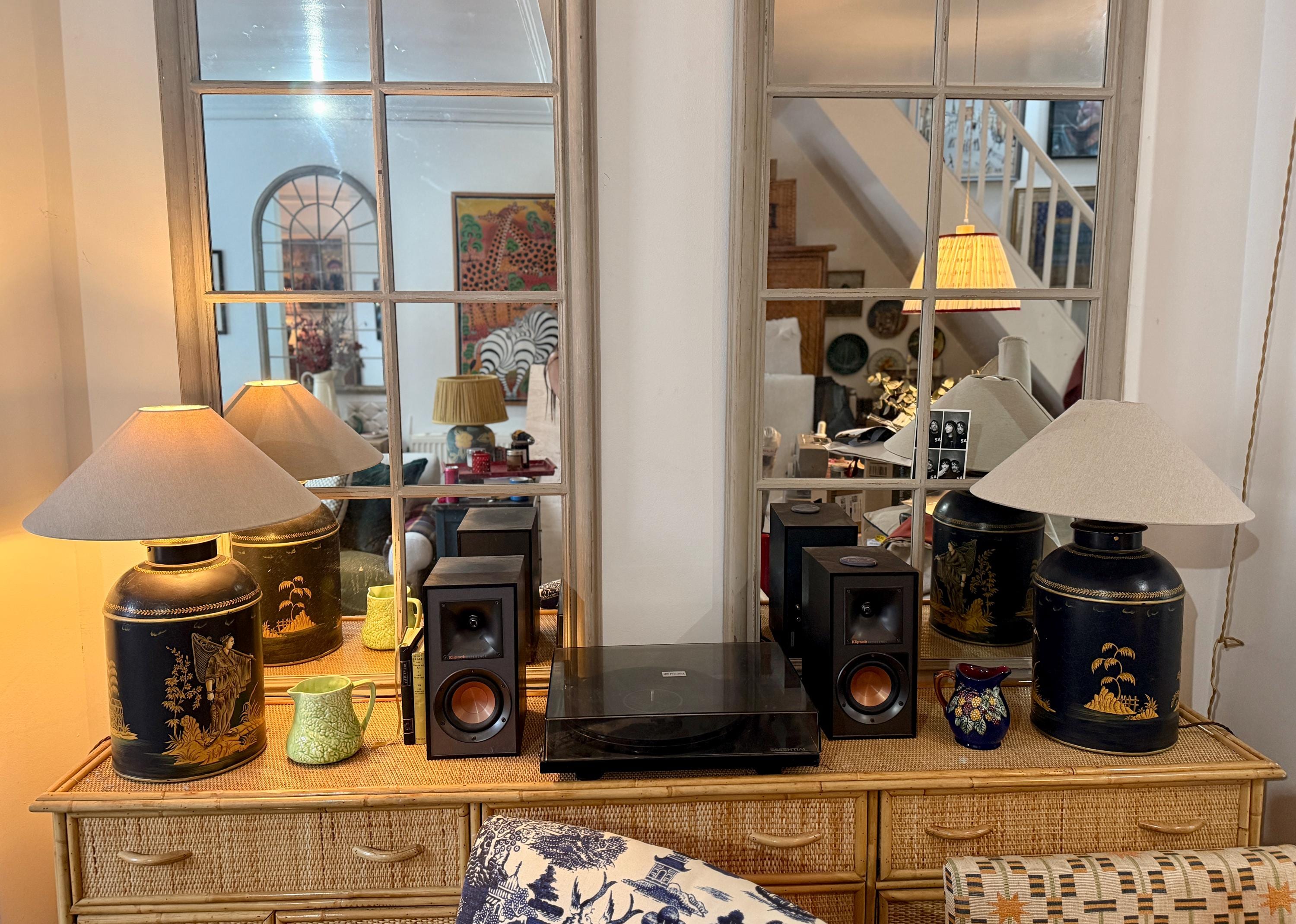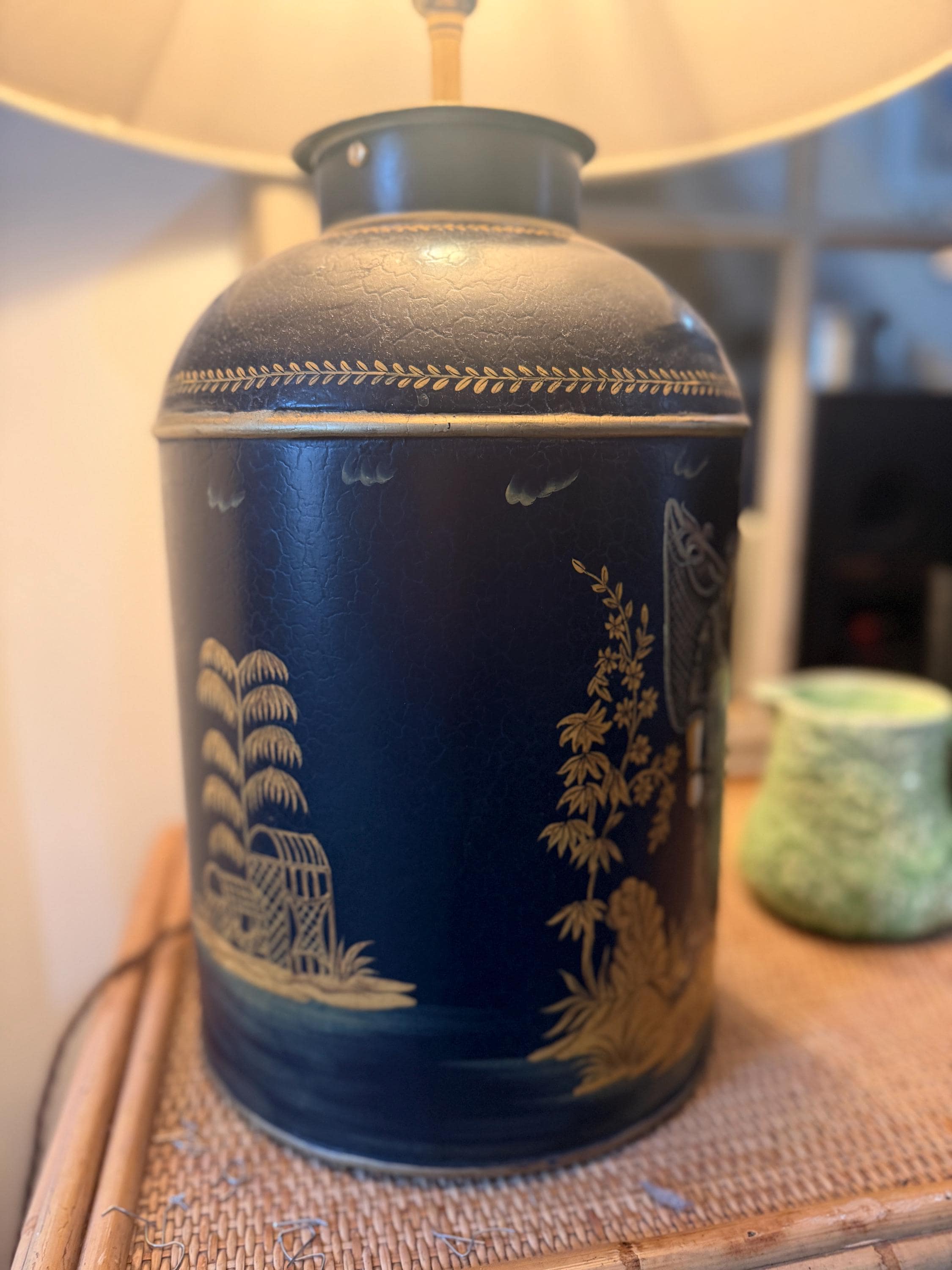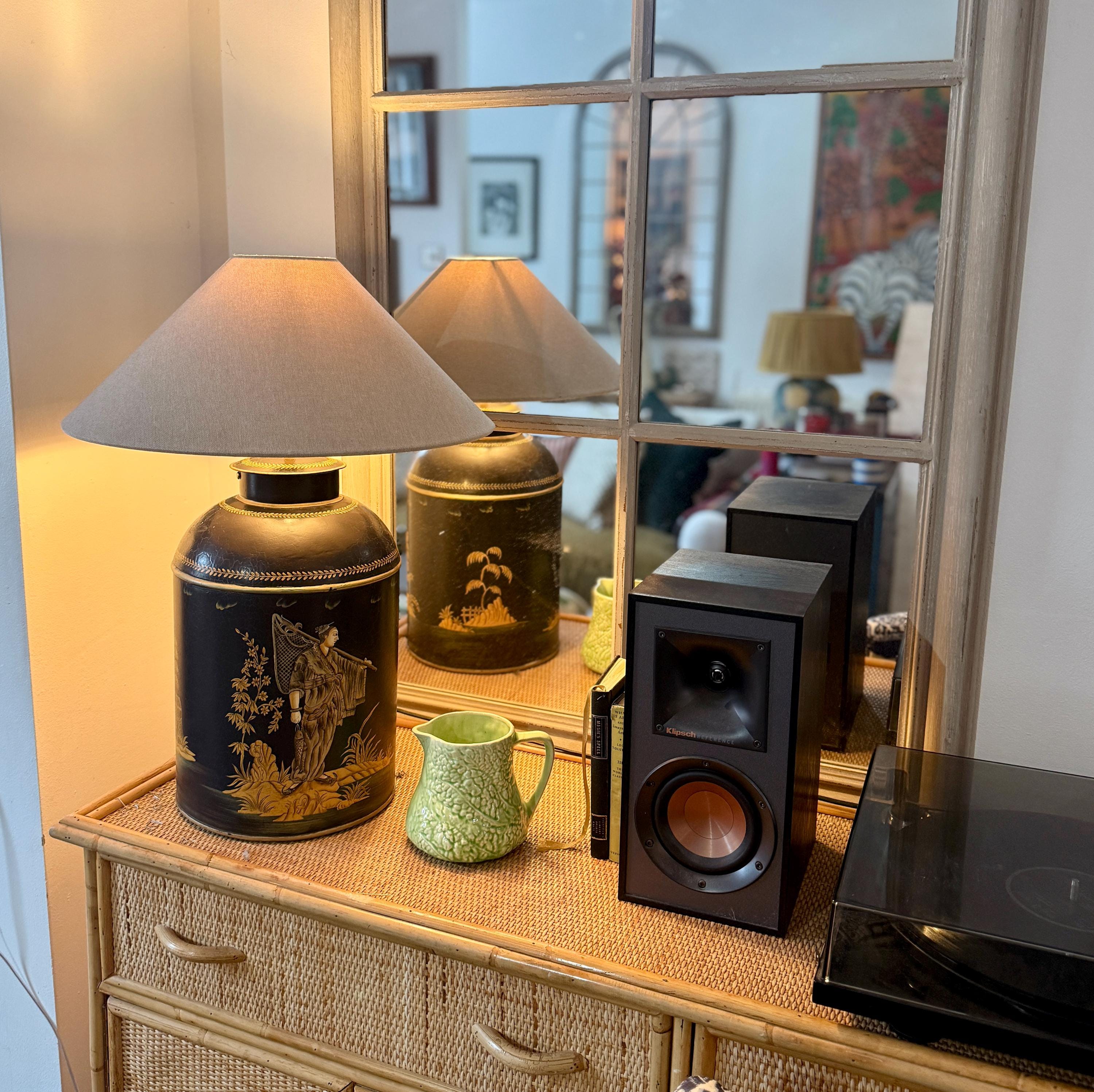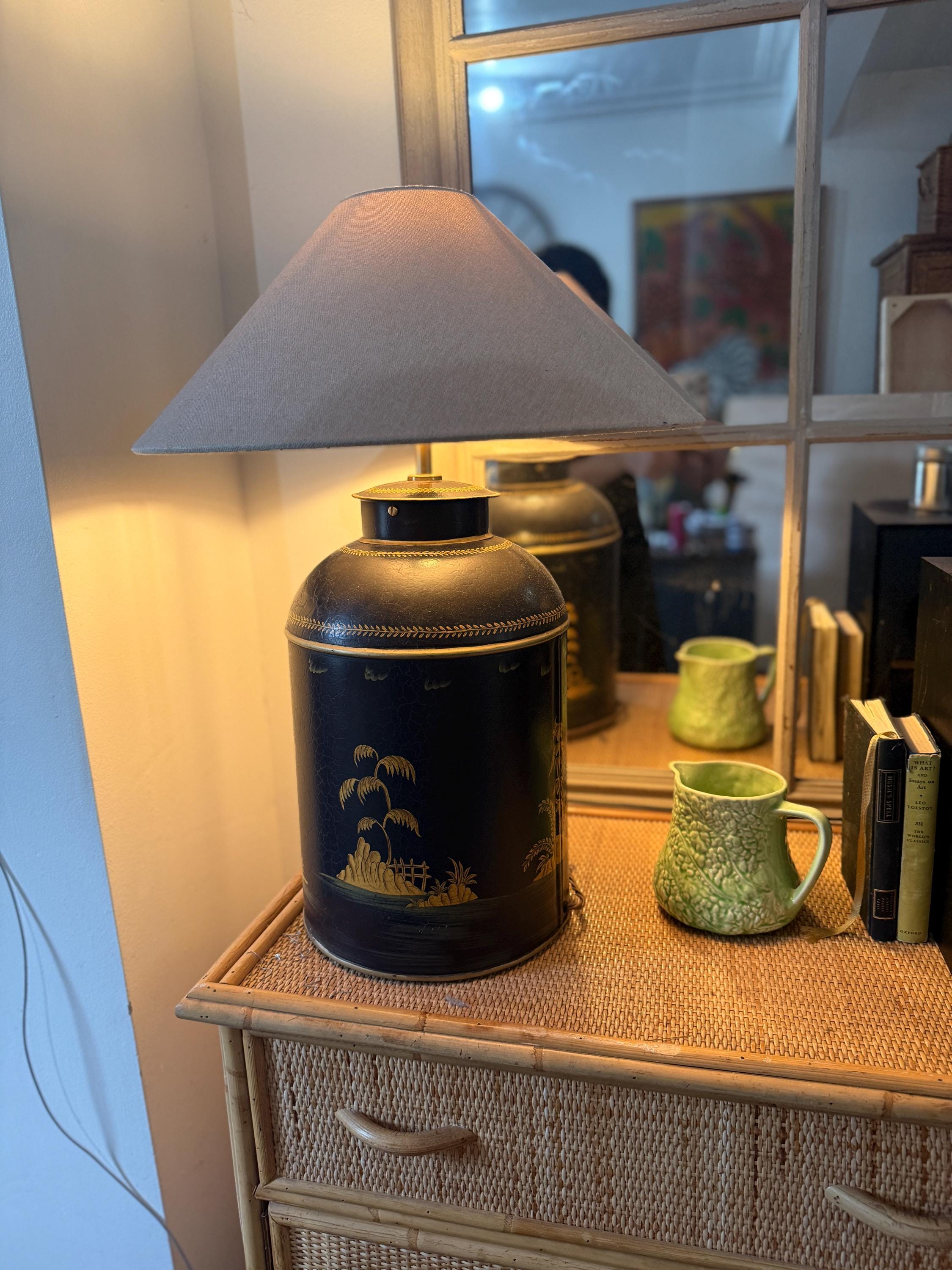 This striking pair of large reproduction chinoiserie black and gold toleware tea caddies have been converted into lamps by our lighting expert with shiny brass bayonet bulb holders and woven chords. The lamps are wired for UK use but we can re-wire these for the USA or European requirements at an additional cost. Please request. This listing is for the lamps only.
